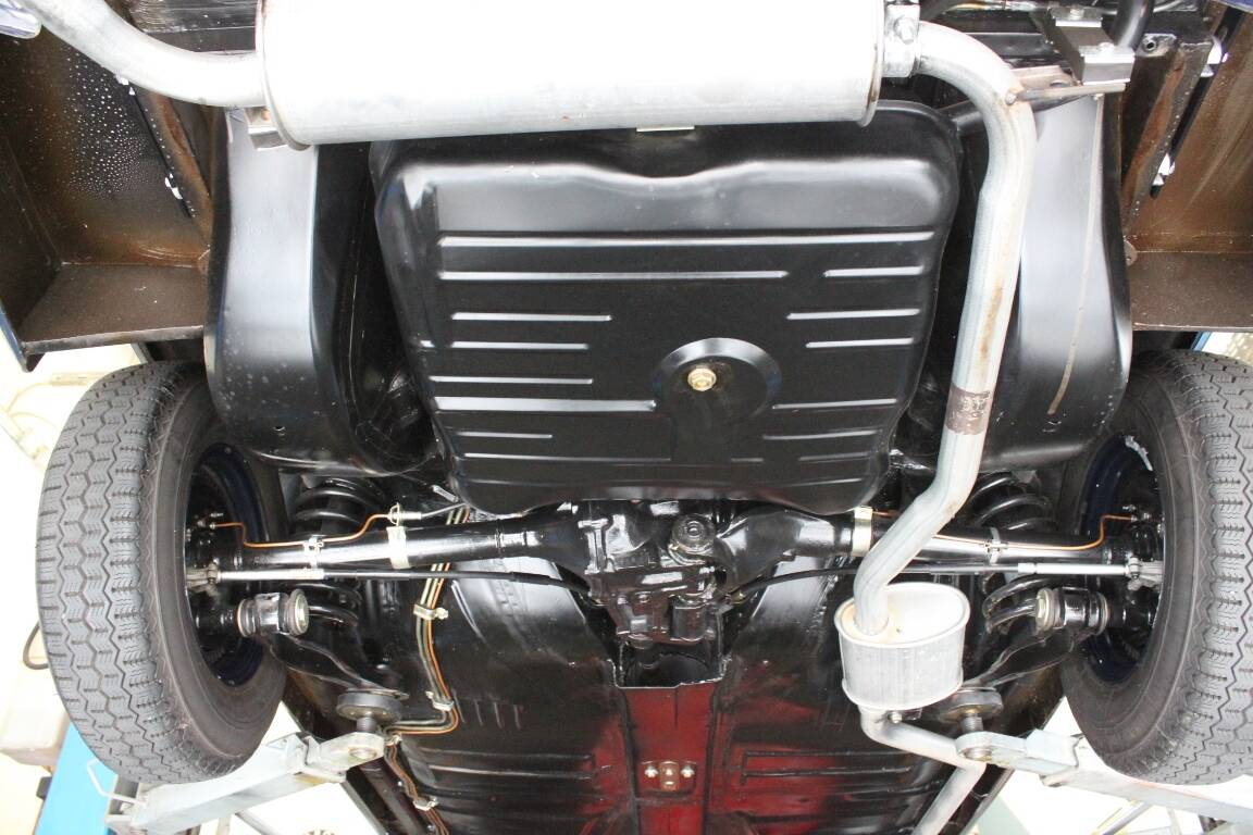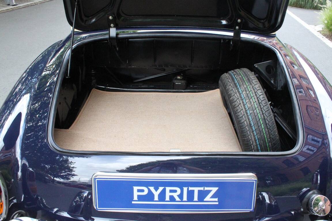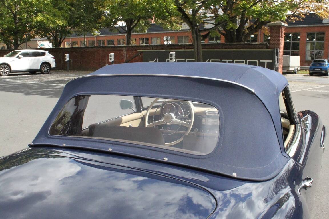 Das Ergebnis der Restaurierung ist ein Traum von einem Auto. Die dunkel blaue Farbe in der Kombination mit dem blauen Stoffverdeck und der cremefarbigen Innenausstattung wirkt exzellent.