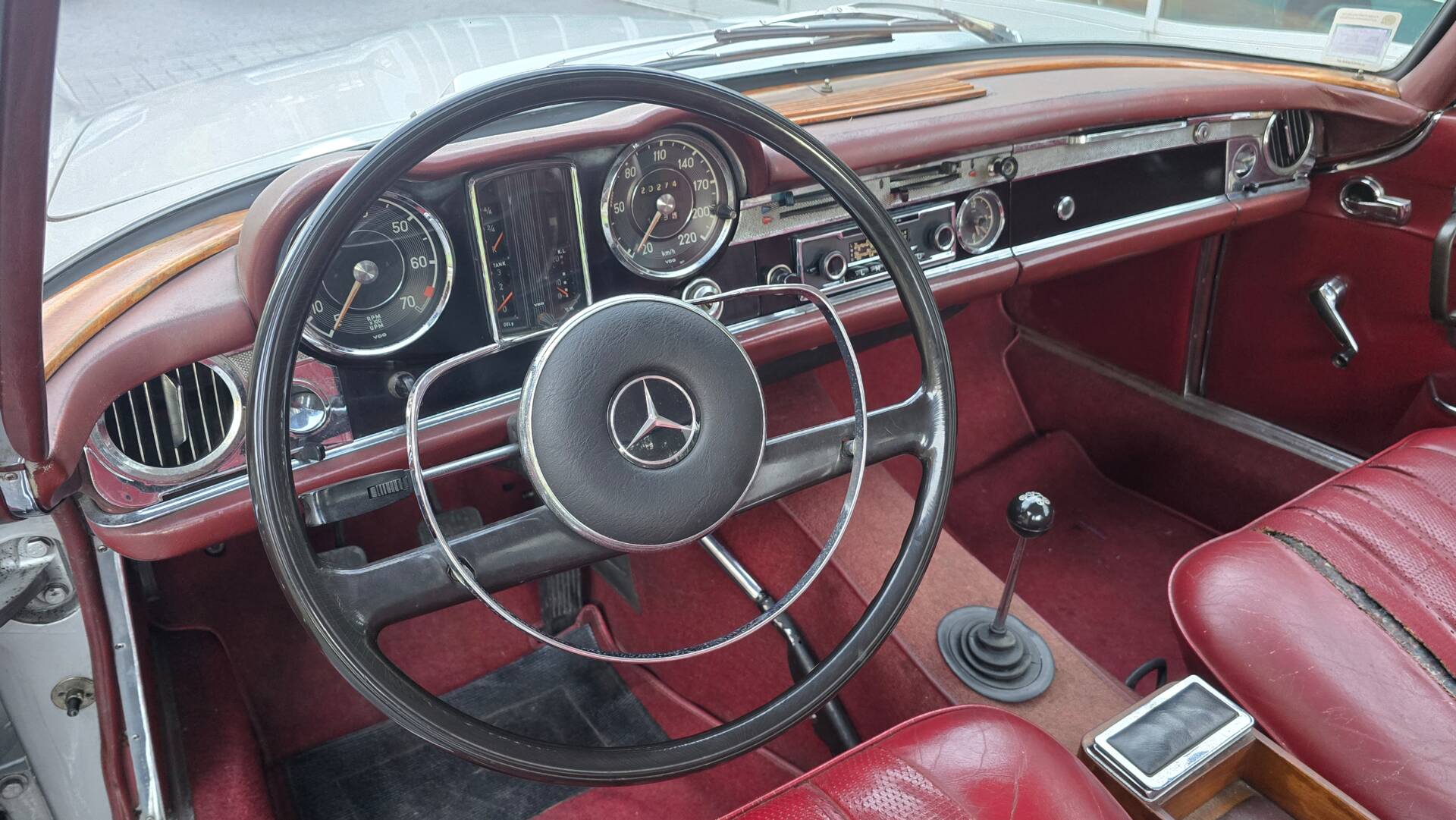 Mercedes-Benz 230SL W113 Pagoda. 1964. Silver Grau 180G color/Original Red Leather. Black Softop. Motor M127981 150CV 6 cyl. Manual Gearbox 4 speed. Matching numbers. Hardtop Becker. Portuguese Register&Documents. Clube Portugués de Automoveis Antigos Certificate. Running and Driving. Sold as is in 69.900€. Complete Picture Dossier available under request.