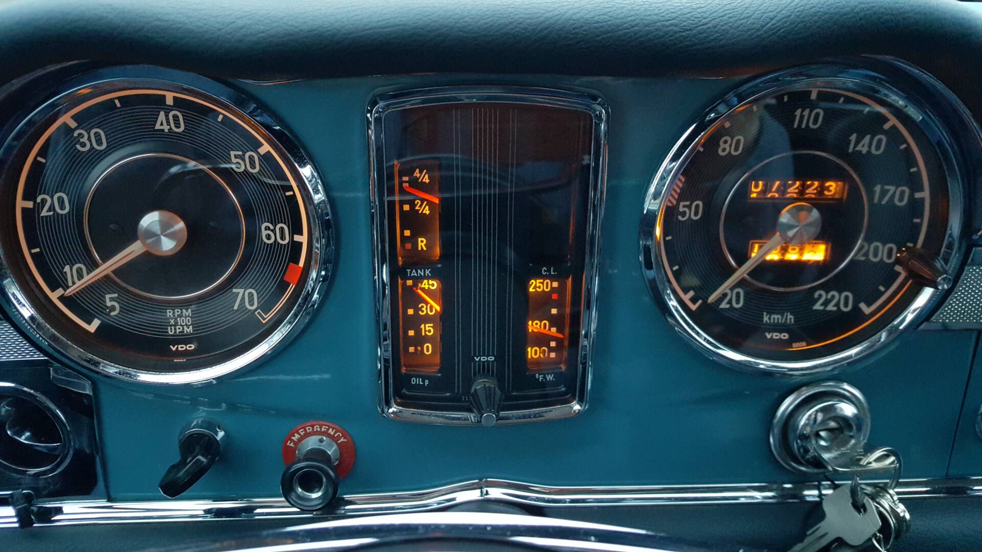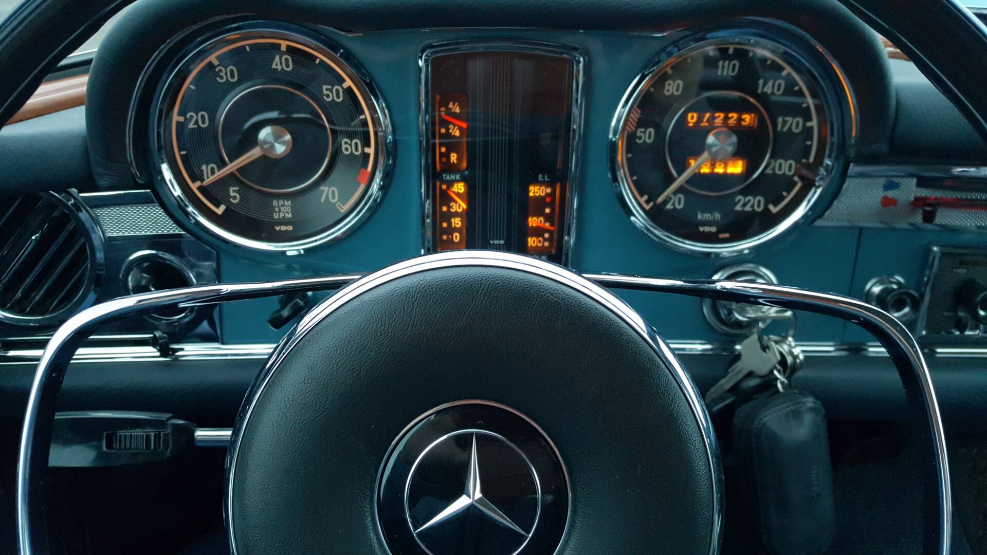 Laut Datenkarte im Dezember 1966 vom Band in Sindelfingen gerollt und dann als optisch europäische Version nach „California“ verschifft. 43Jahre bis 2009 im sonnenverwöhnten Kalifornien verweilend. In dieser Zeit von etwa 3 Haltern verwöhnt und von Geevers Classic-Cars NL zurück nach Europa geholt. Ich habe sie oder eher sie hat mich dann im Sommer Juli 2009 entdeckt und es war Liebe auf den zweiten Blick. Hellblau mit dunkelblauem Faltdach, 2-farbigen Felgen/kleiner Radkappe und WW-Reifen