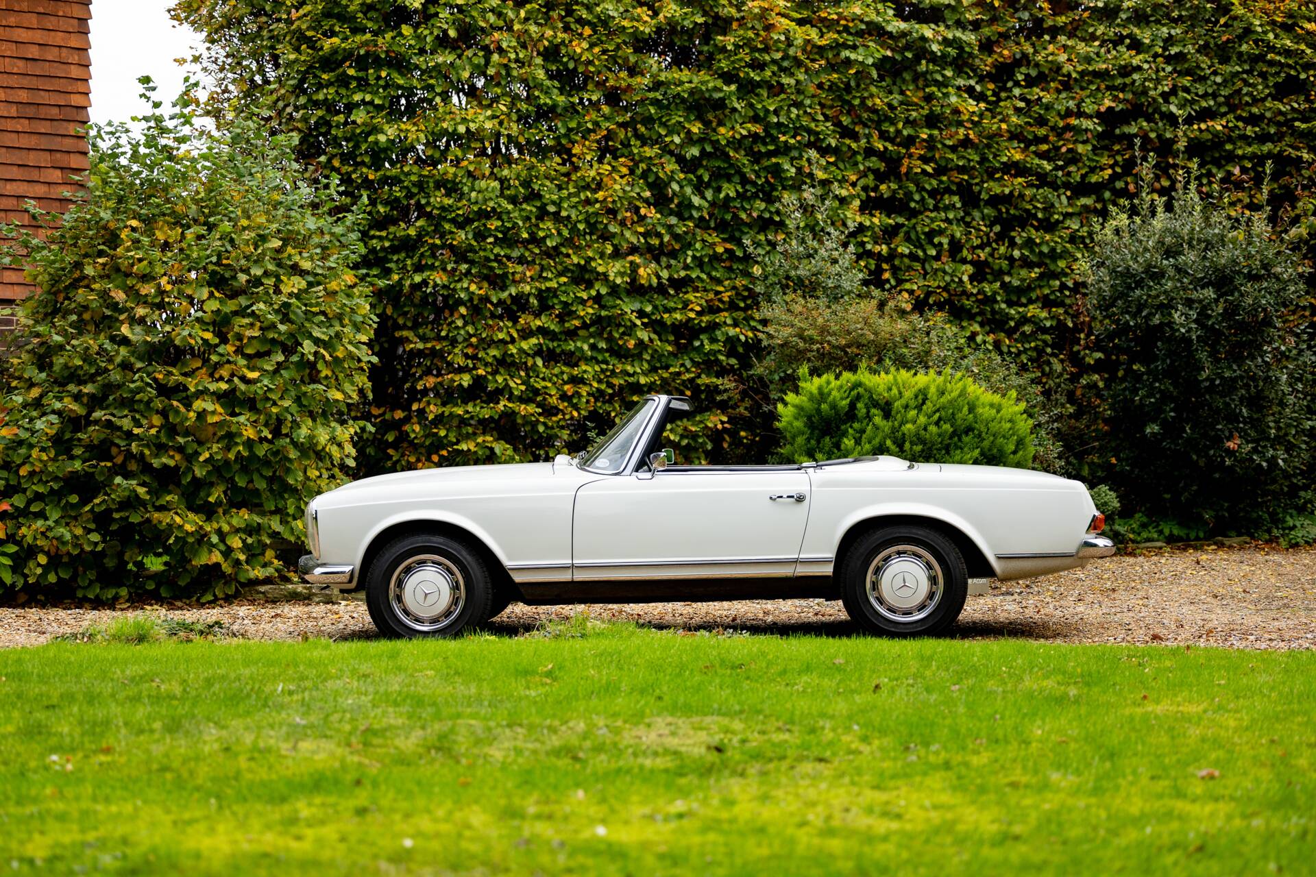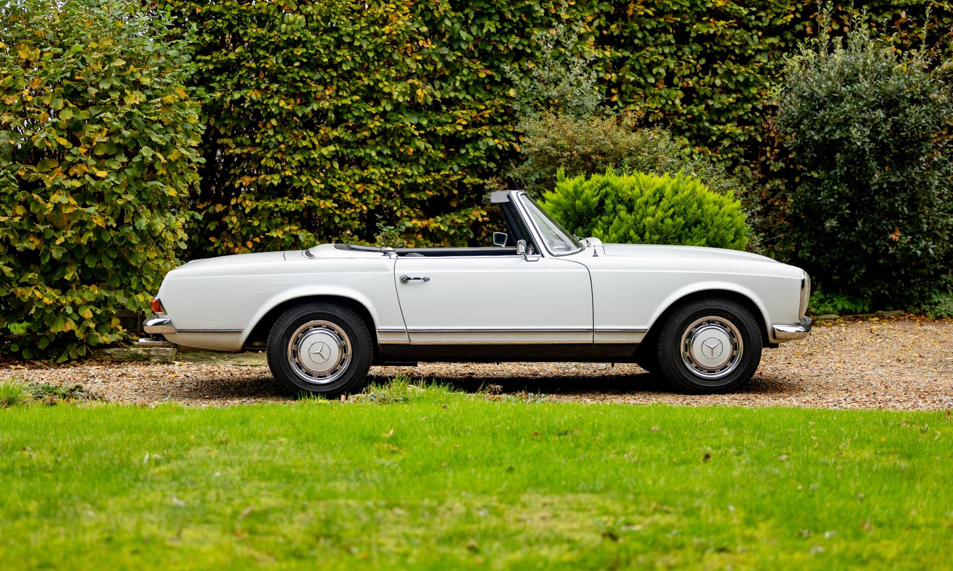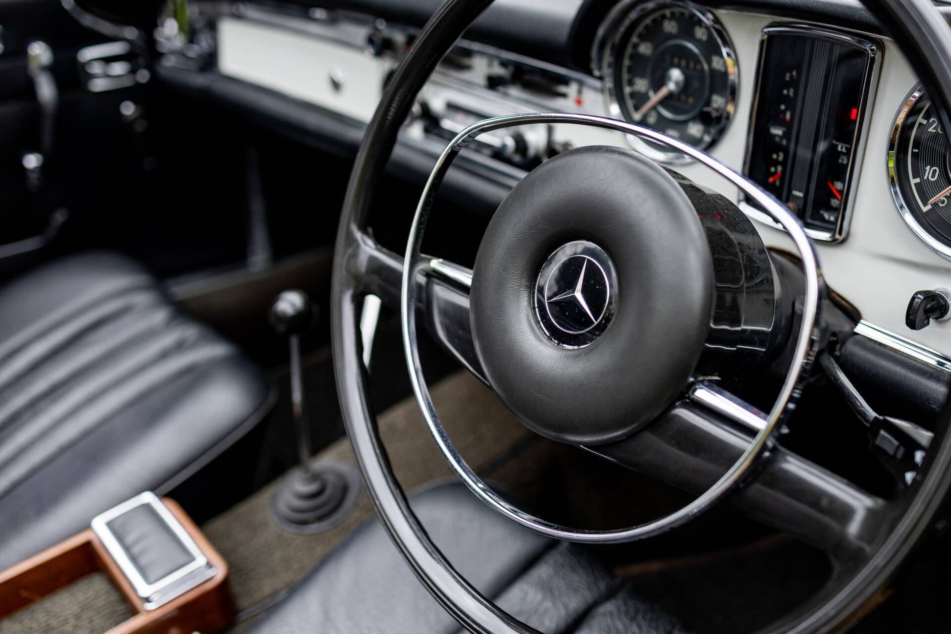 The Mercedes-Benz 280 SL was introduced in December 1967 and continued in production until February 1971. An all new design by Paul Bracq to replace the 190 SL and 300 SL Roaster. The 280 SL had a powerful 2.8 litre version of Mercedes inline-six and used Bosch fuel injection. To save on weight, the bonnet, boot lid and tonneau cover were all composed of aluminium. The nickname 'Pagoda' was quickly adopted thanks to the slightly concave roof on the optional removable hardtop that resembled a pagoda roof. The comparatively short and wide chassis, combined with an excellent suspension, powerful disc brakes and radial tyres gave the W113 superb handling for its time. These roadsters also have one of the most beautiful bodies produced in the 1960s. Thanks to their robust inline-six and their luxurious Mercedes interior, they are wonderful cars to be driven and enjoyed. The styling of the front paid homage to the legendary 300 SL with its characteristic upright Bosch 'fishbowl' headlights and simple chrome grille, dominated by the large three-pointed star in the nose panel.