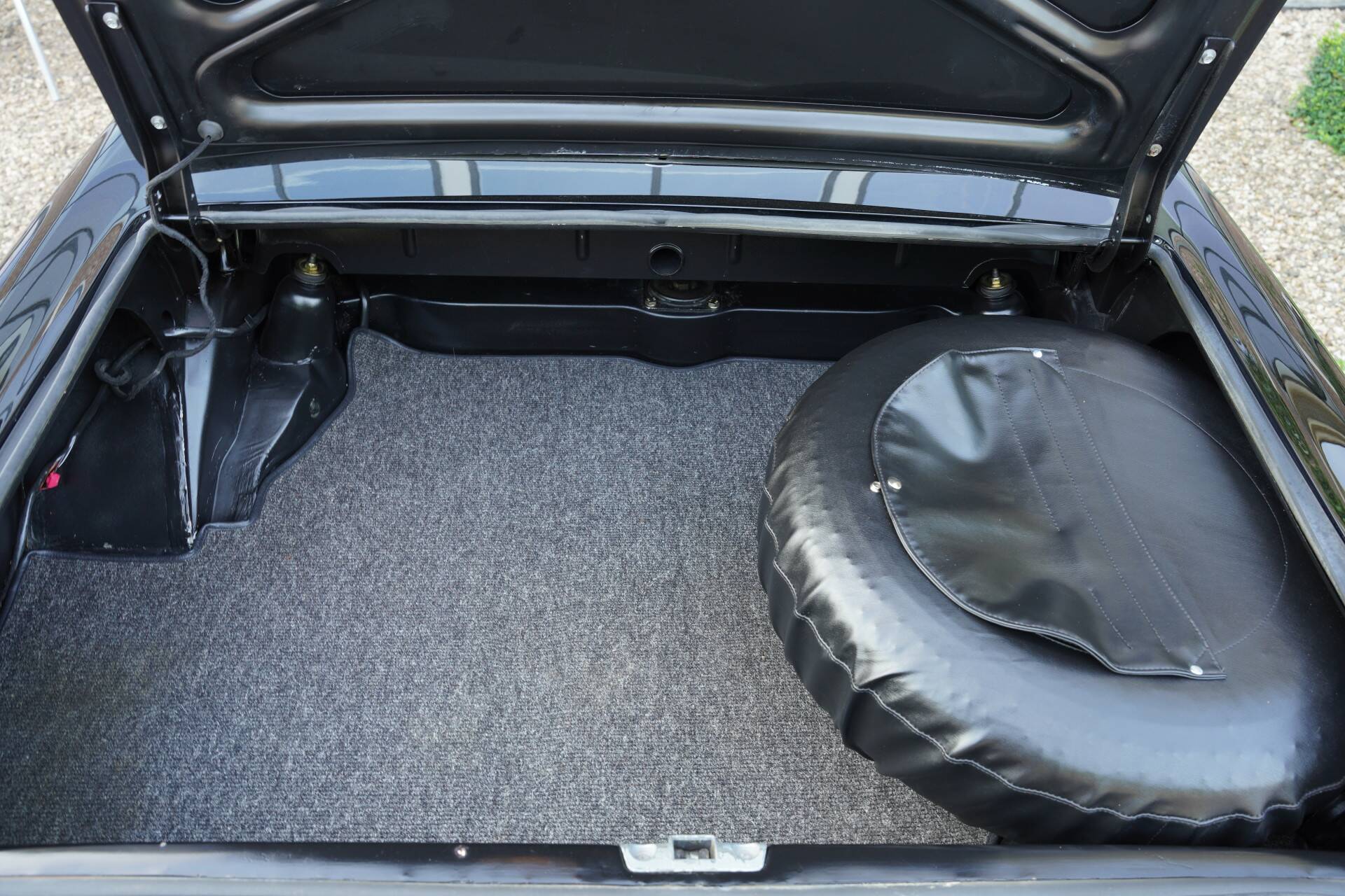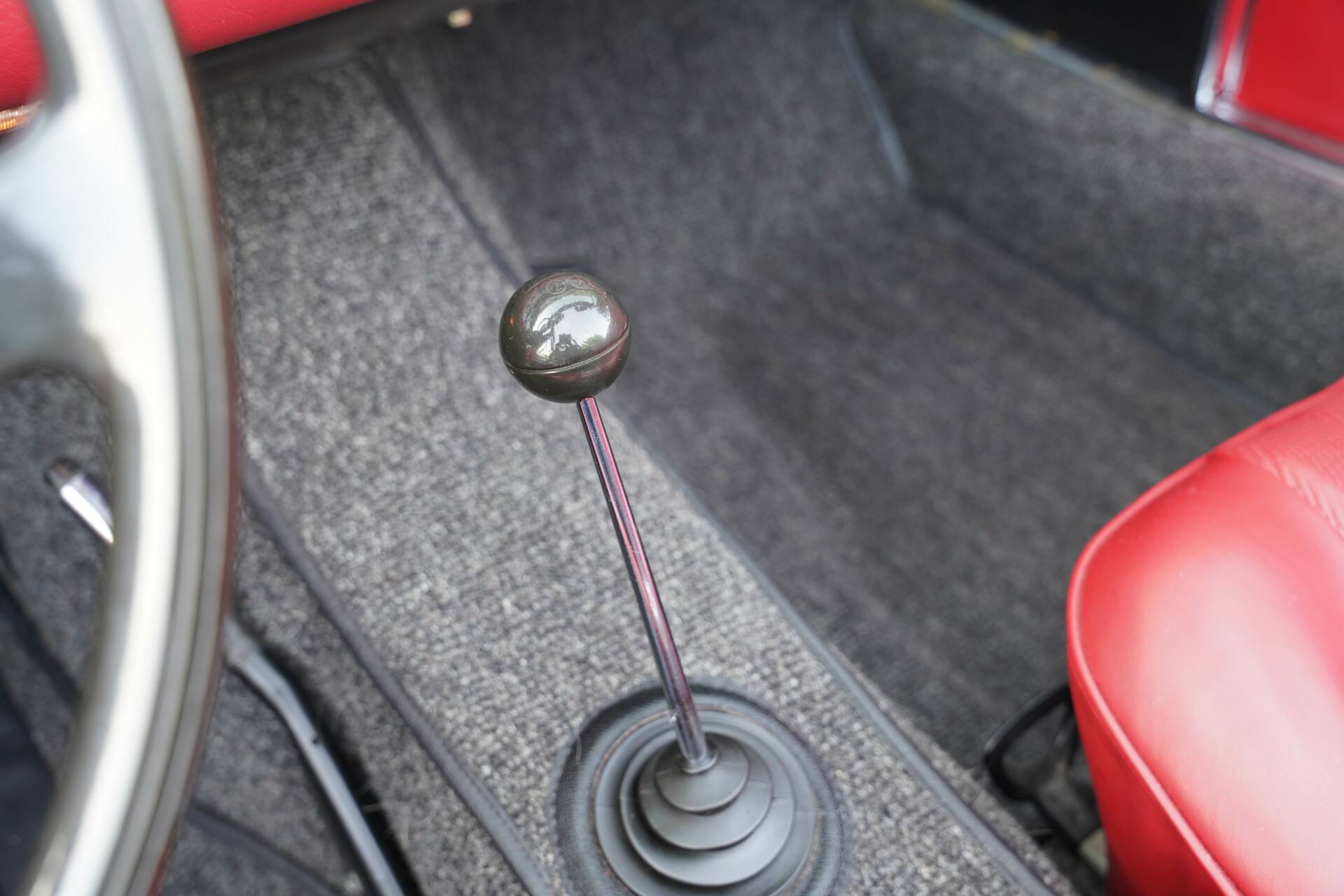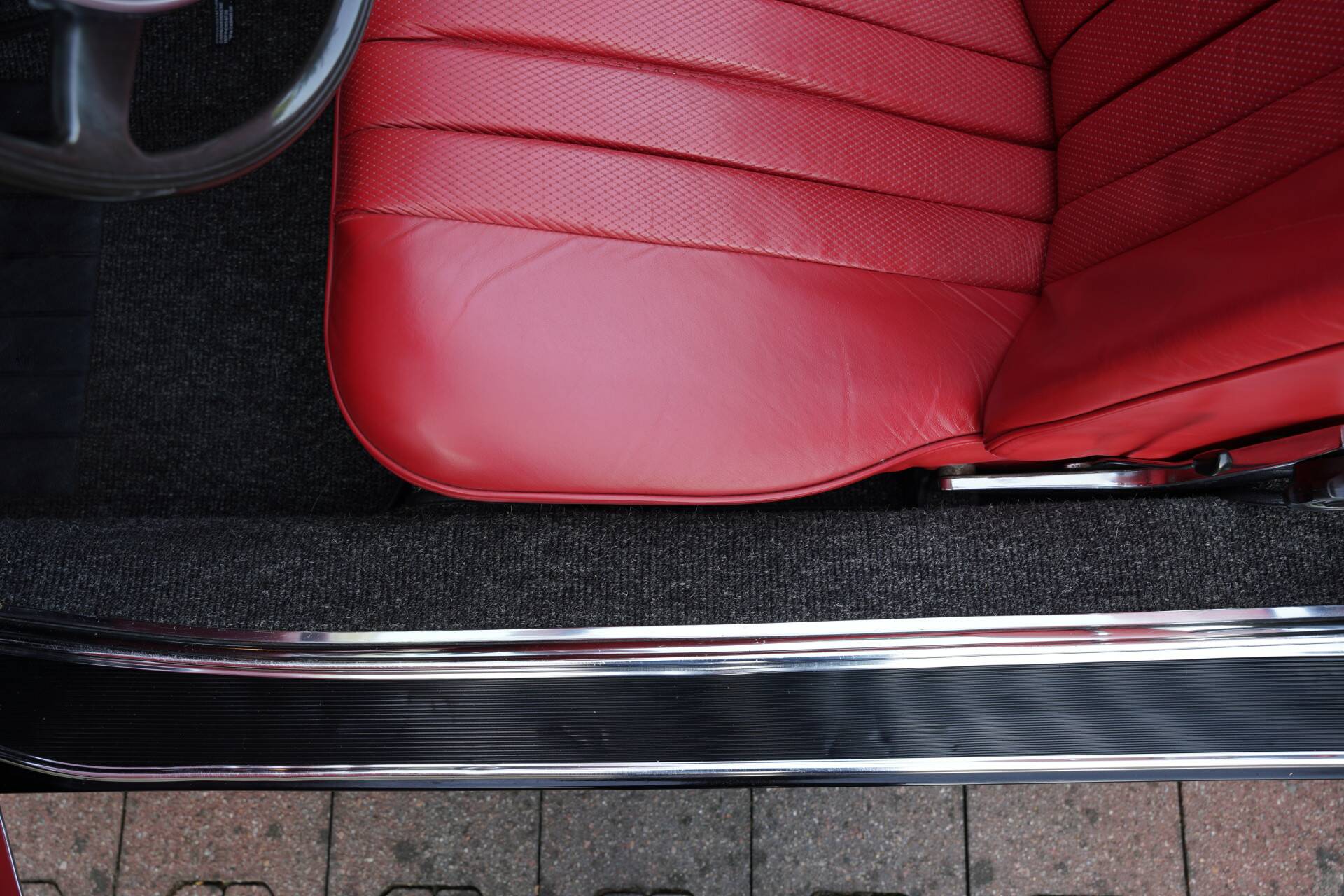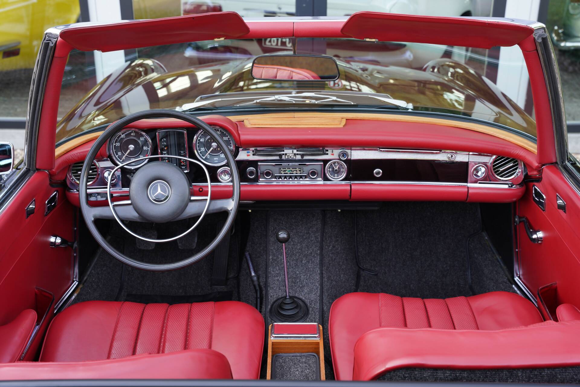 For the true connoisseurs: yes, the V-marks on the front fenders are present. This particular Pagoda comes with a manual gearbox, the enthusiast's choice. And in the all-time classic color combination of black over deep red leather, it’s nothing short of striking.