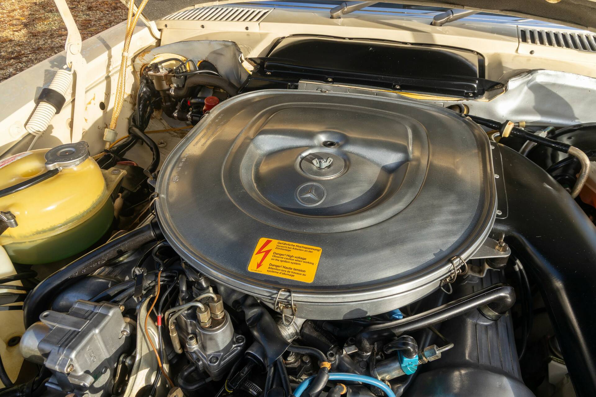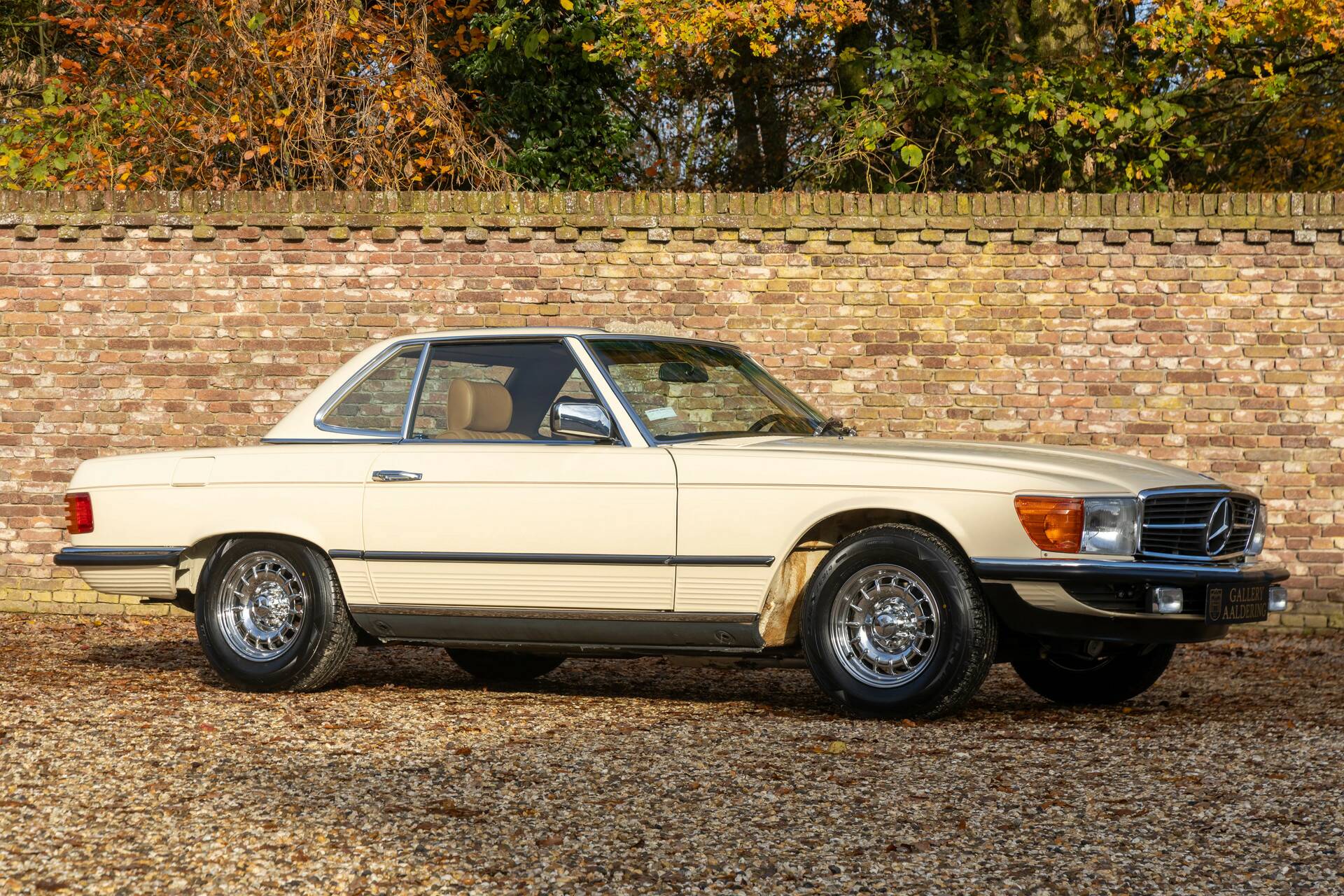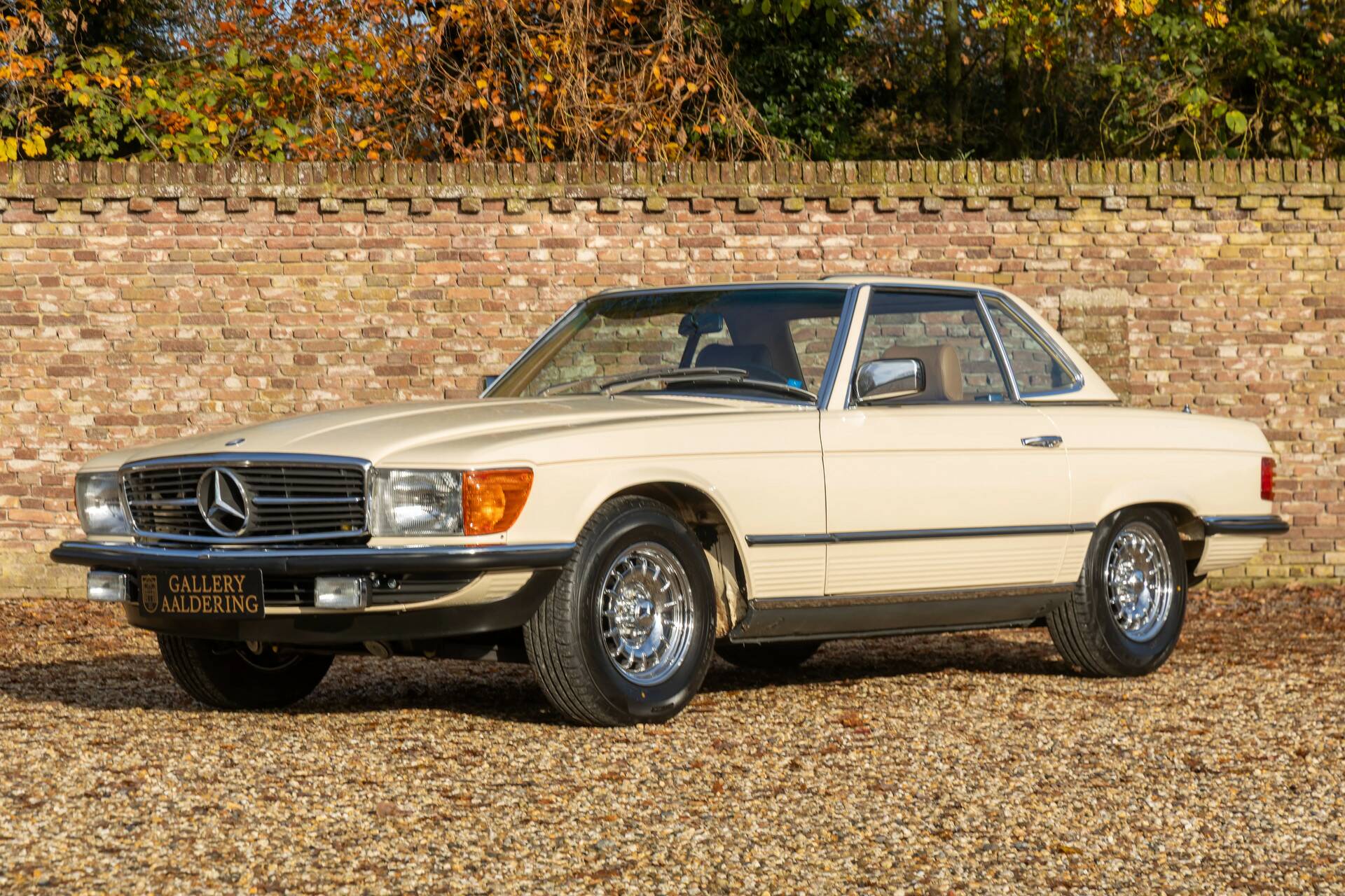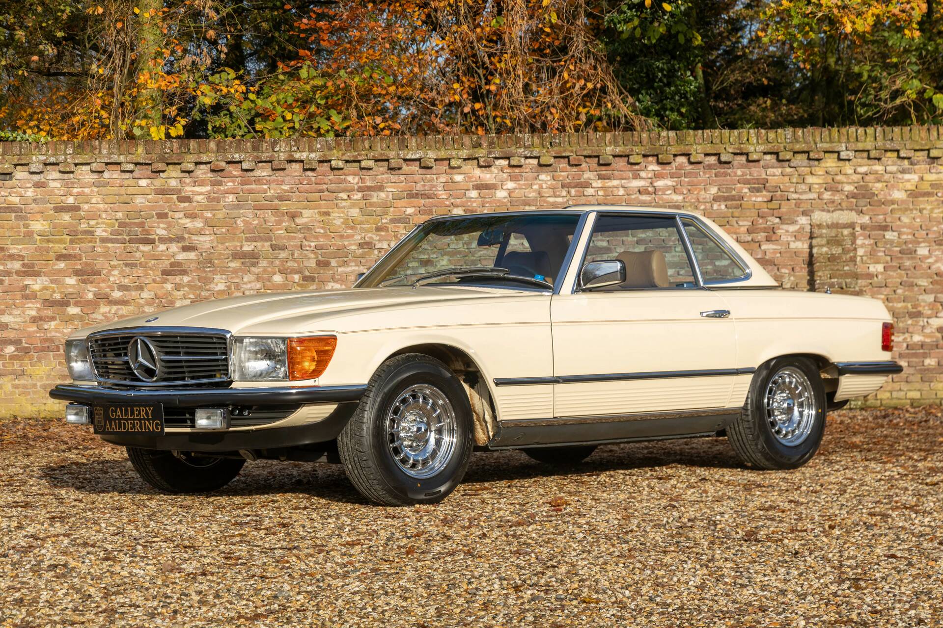 The color combination is a story in itself: finished in subtle yet distinctive Light Ivory, paired with a Palomino MB-Tex interior that shows virtually no signs of wear. It’s exactly the kind of specification that defines the early-1980s 380 SL—refined, understated, and absolutely timeless. Step inside and you immediately feel that unmistakable Mercedes aura: the solid click of the door, the restrained luxury, the materials that—over four decades later—still retain their original quality.