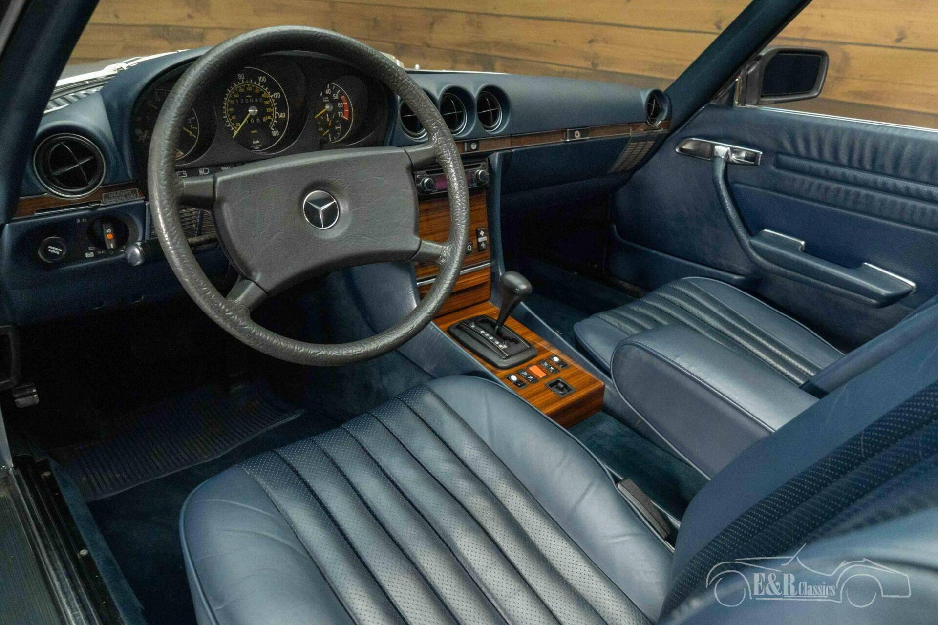 Qua uitstraling is dit een zeer smaakvolle uitvoering. Het lichtblauw metallic lakwerk combineert prachtig met de chromen spaakwielen, wat de auto een luxe en klassieke uitstraling geeft. Het donkerblauwe interieur sluit naadloos aan bij het exterieur, met mooi bewaard gebleven lederen bekleding en stijlvolle houtaccenten op het dashboard en de middenconsole. Het geheel vormt een harmonieuze en hoogwaardige presentatie, precies zoals je van een luxe roadster uit deze periode mag verwachten.