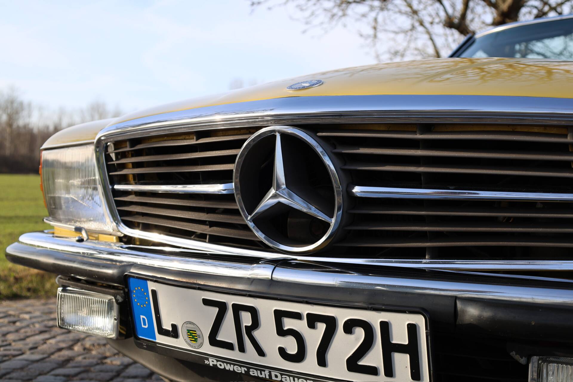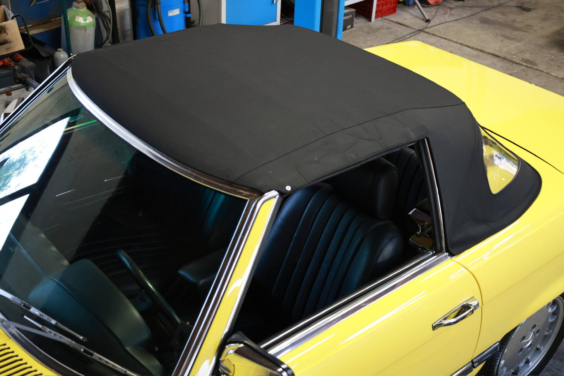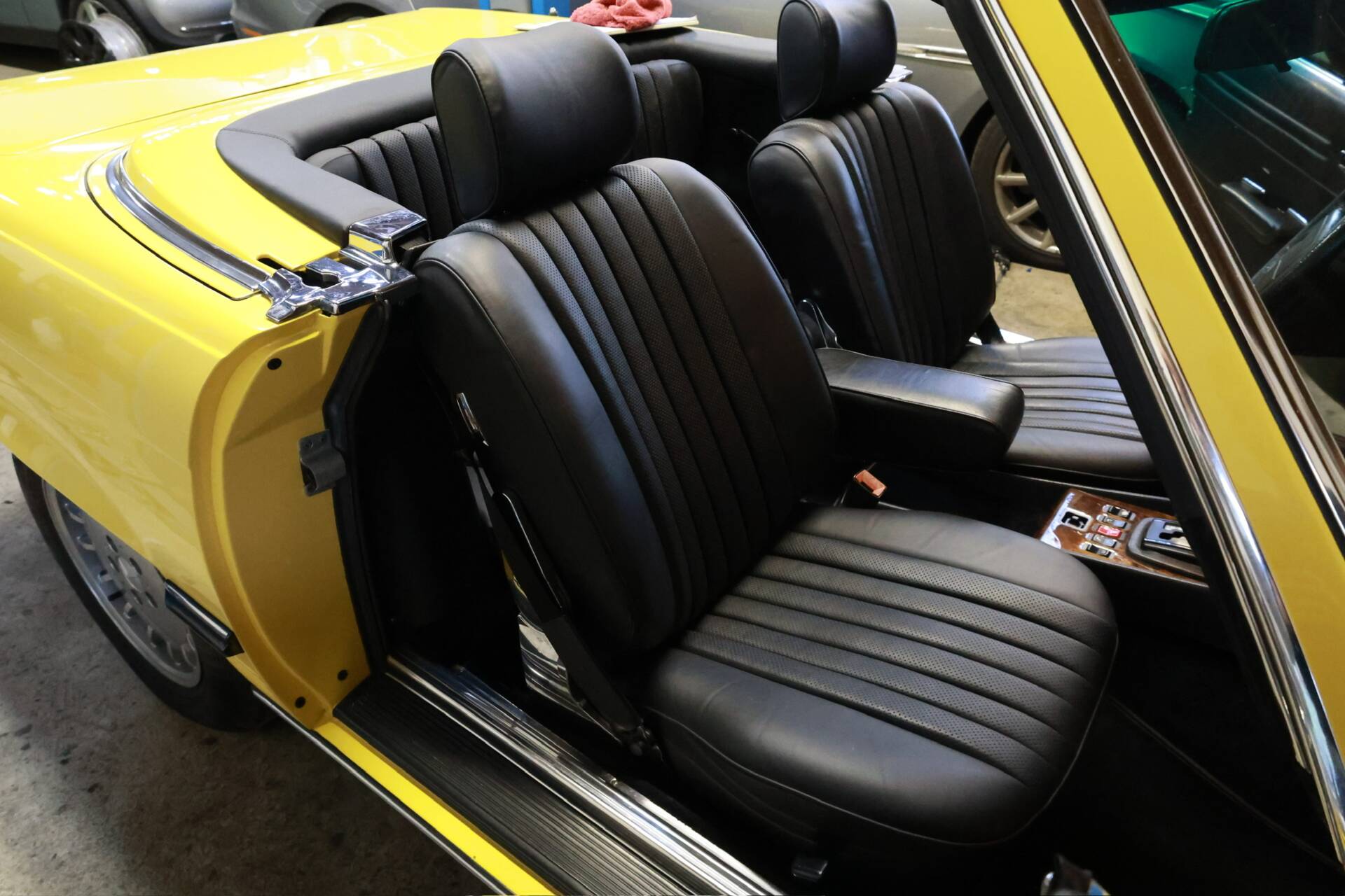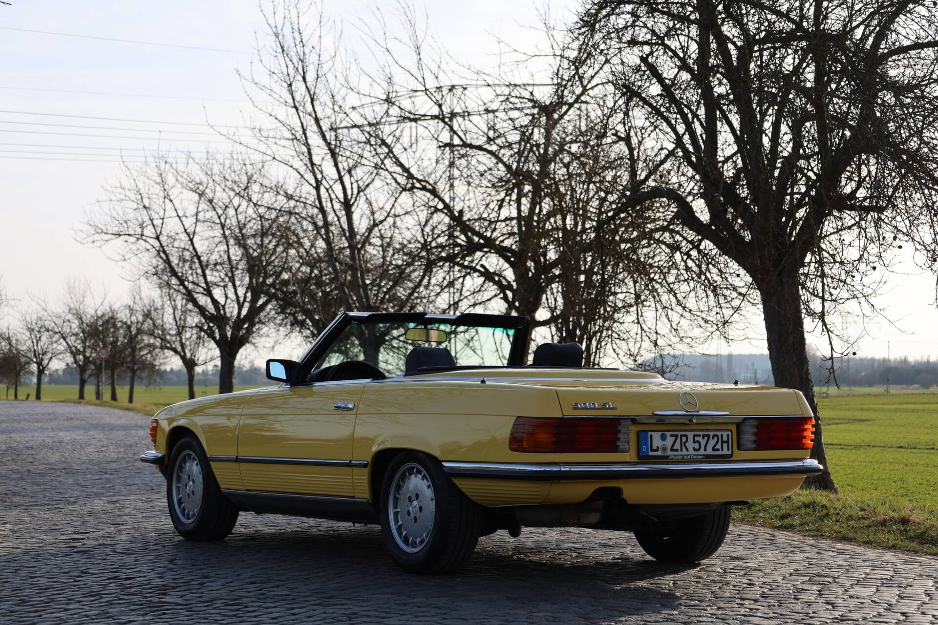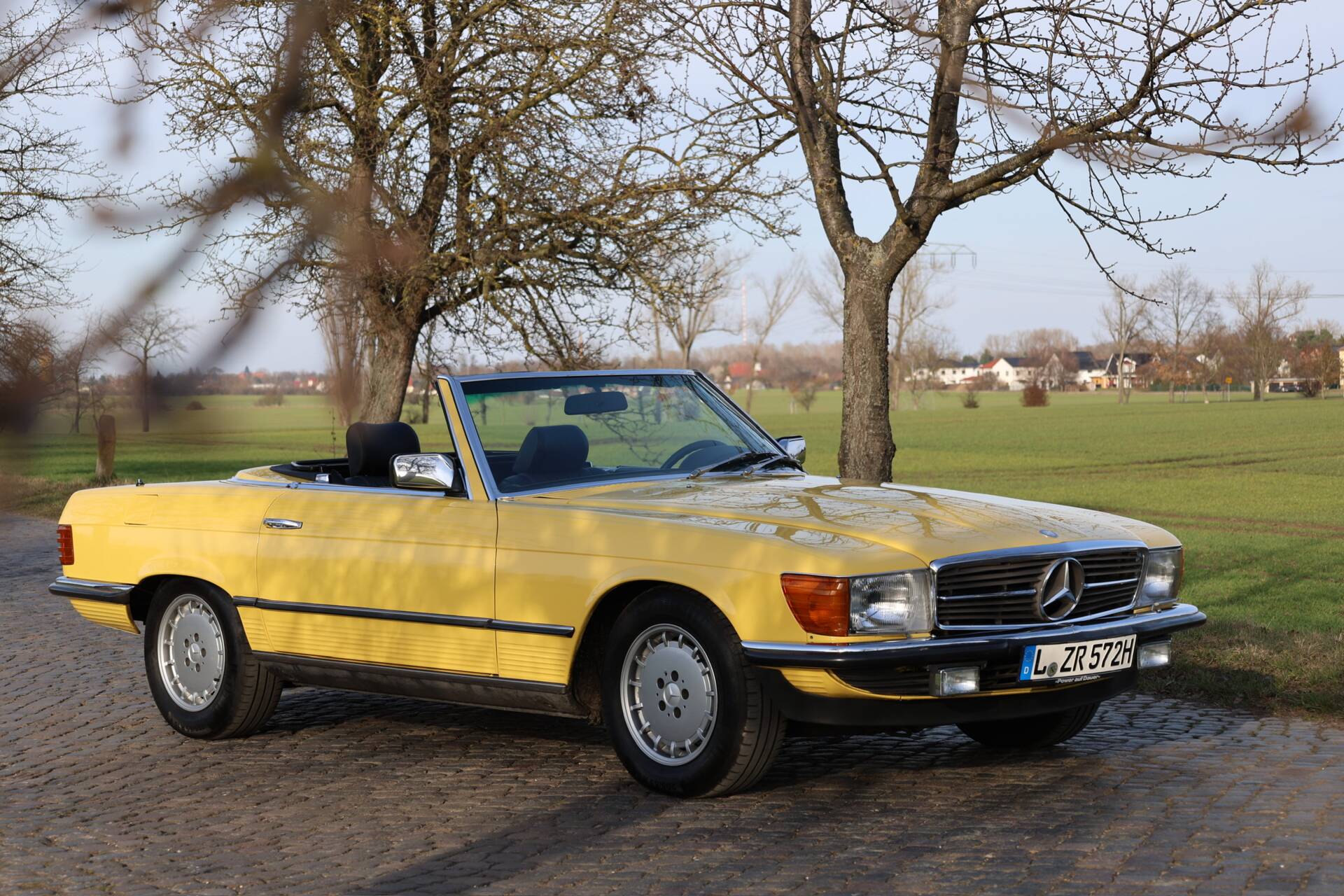 Zum Verkauf im Kundenauftrag steht ein Mercedes-Benz 500 SL der Baureihe R107 in markanter Farbkombination mit gelber Lackierung, schwarzem Verdeck und Leder Nappa anthrazit.
