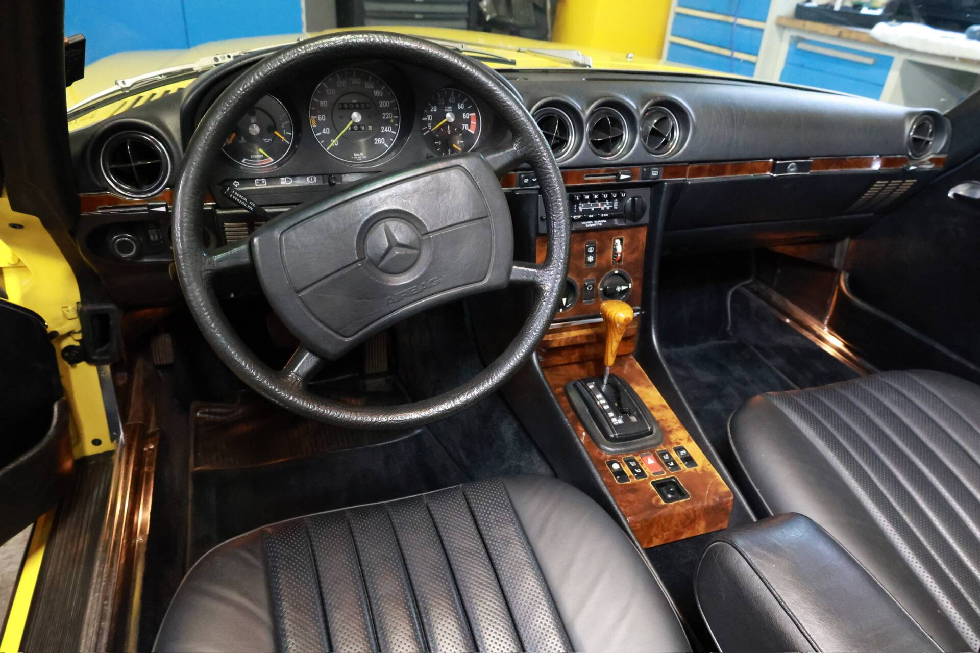 Zur werksseitigen Ausstattung zählen unter anderem Klimaanlage, ABS, Fahrerairbag, Sitzheizung für Fahrer und Beifahrer, Radio Becker Mexico Kassette, automatische Antenne, Außenspiegel rechts elektrisch einstellbar, Scheinwerfer-Reinigungsanlage, wärmedämmendes Glas rundum, beheizbare Heckscheibe, klappbare Mittelarmlehne vorne, Fondsitze für SL-Typen sowie das originale Hardtop.