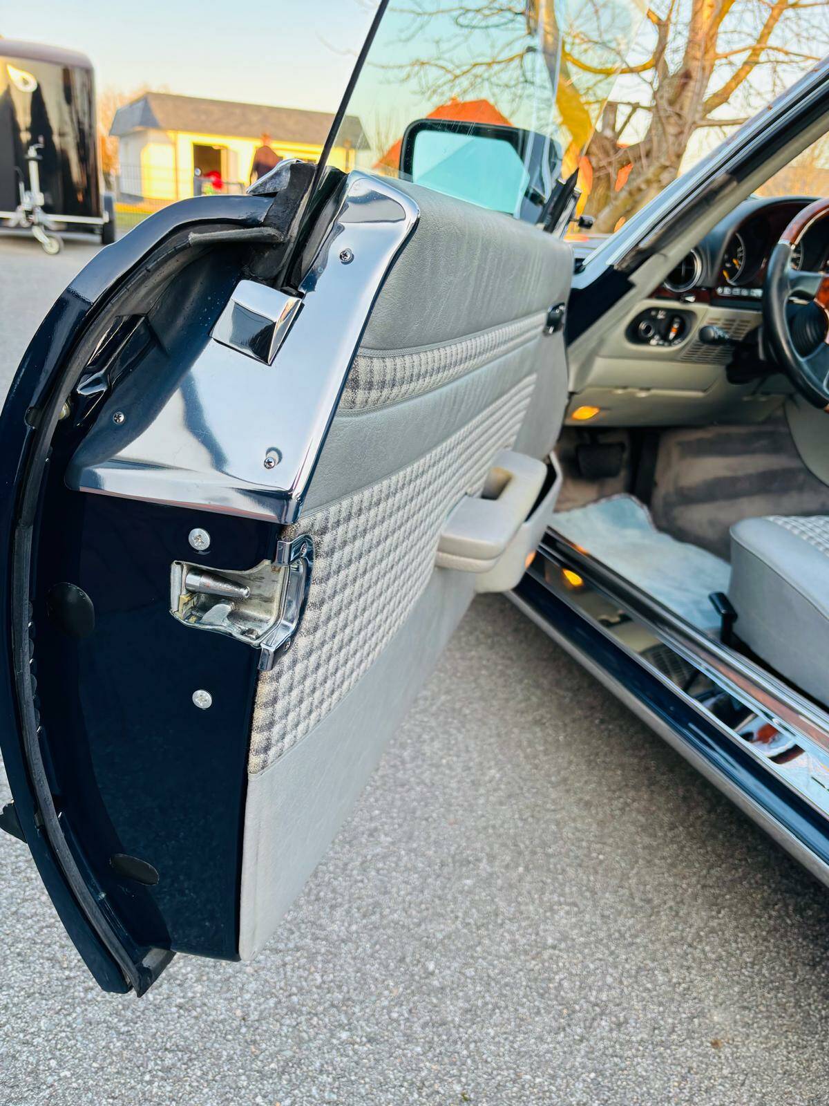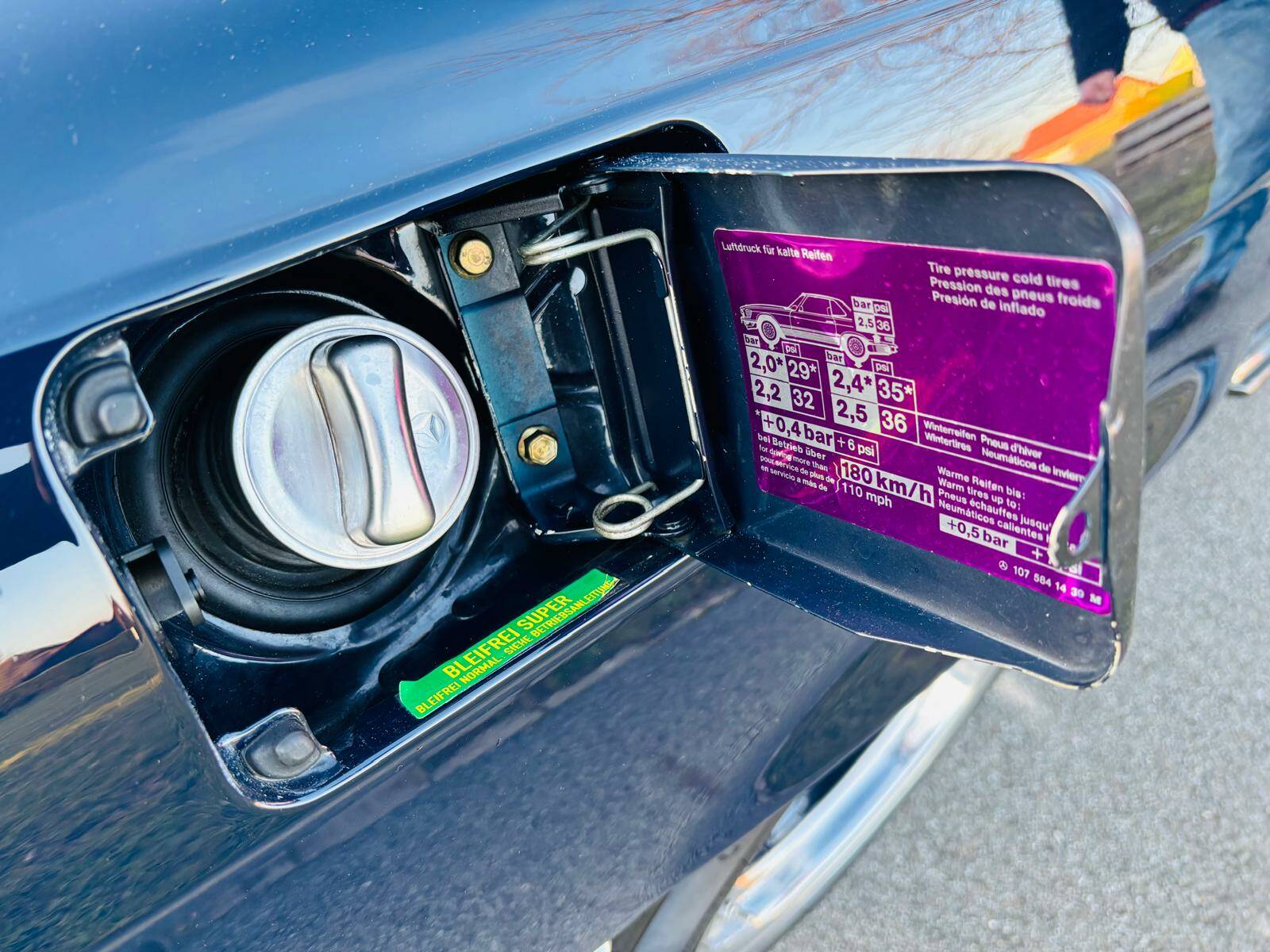 Die Lackierung ist in seltenem Dunkelblau 904 ( Unilack ) und die Innenausstattung ist in einer Stoff / Leder-Kombination aus Karo-Stoff anthrazit und Leder grau ausgeführt.