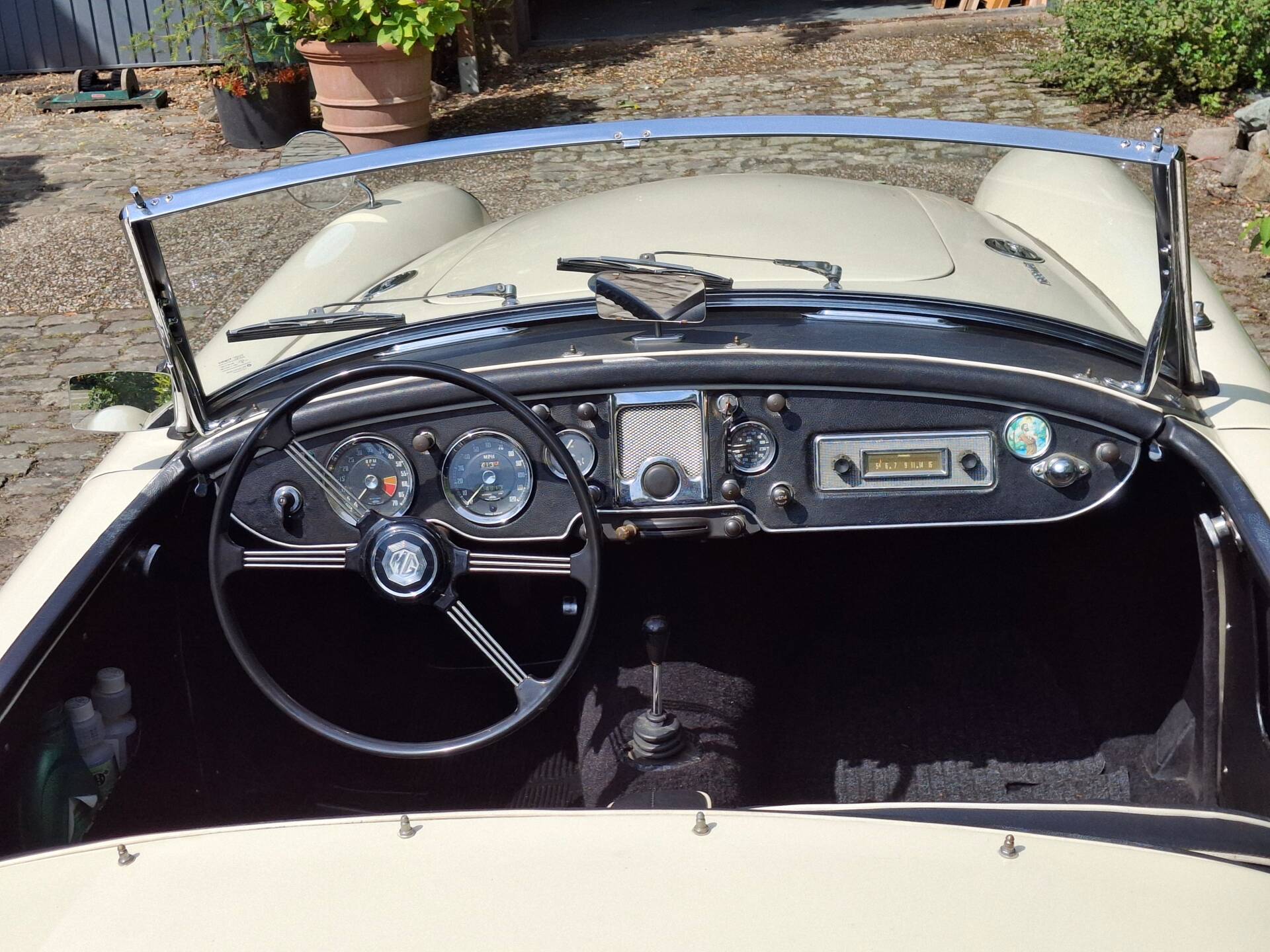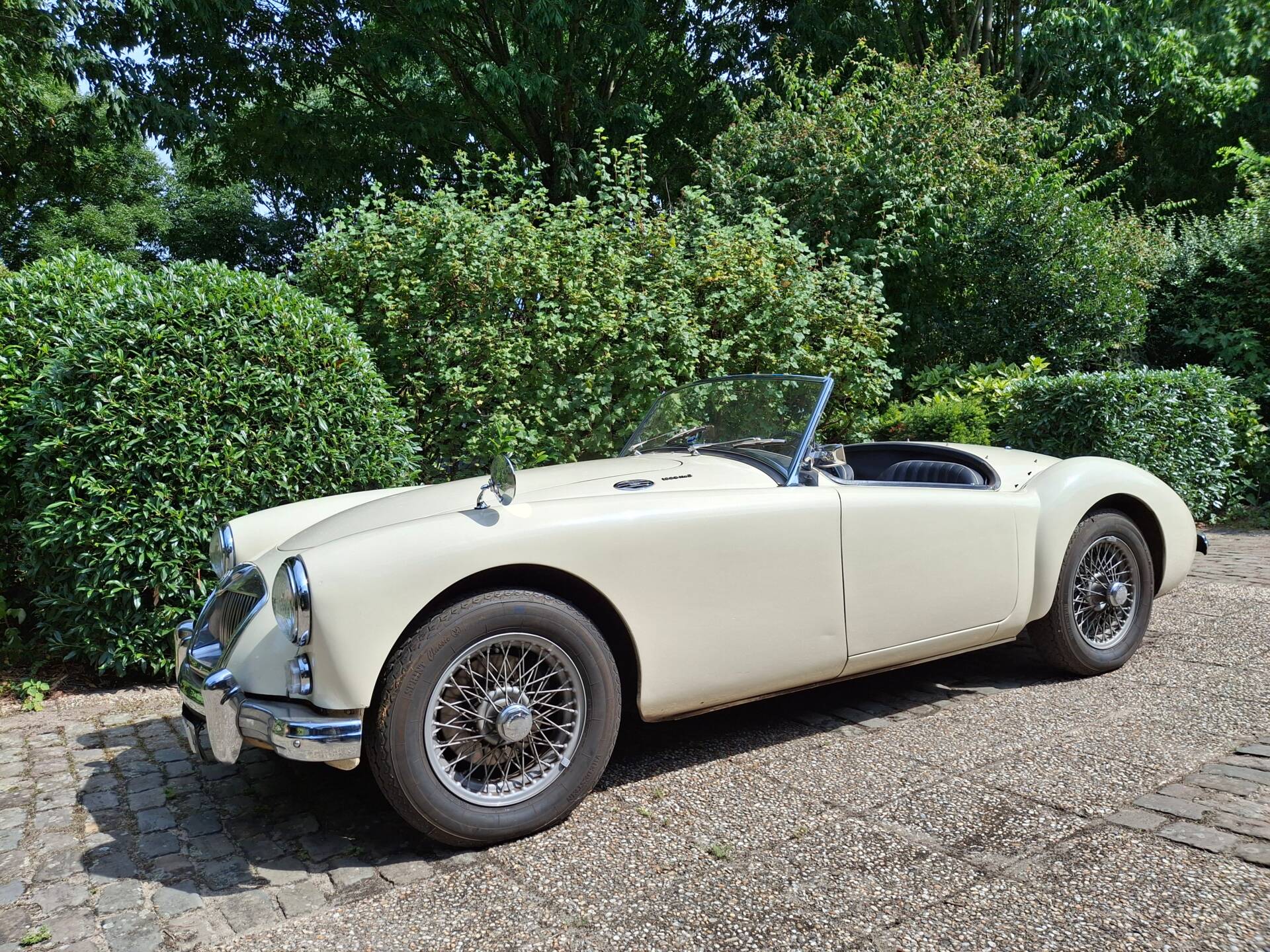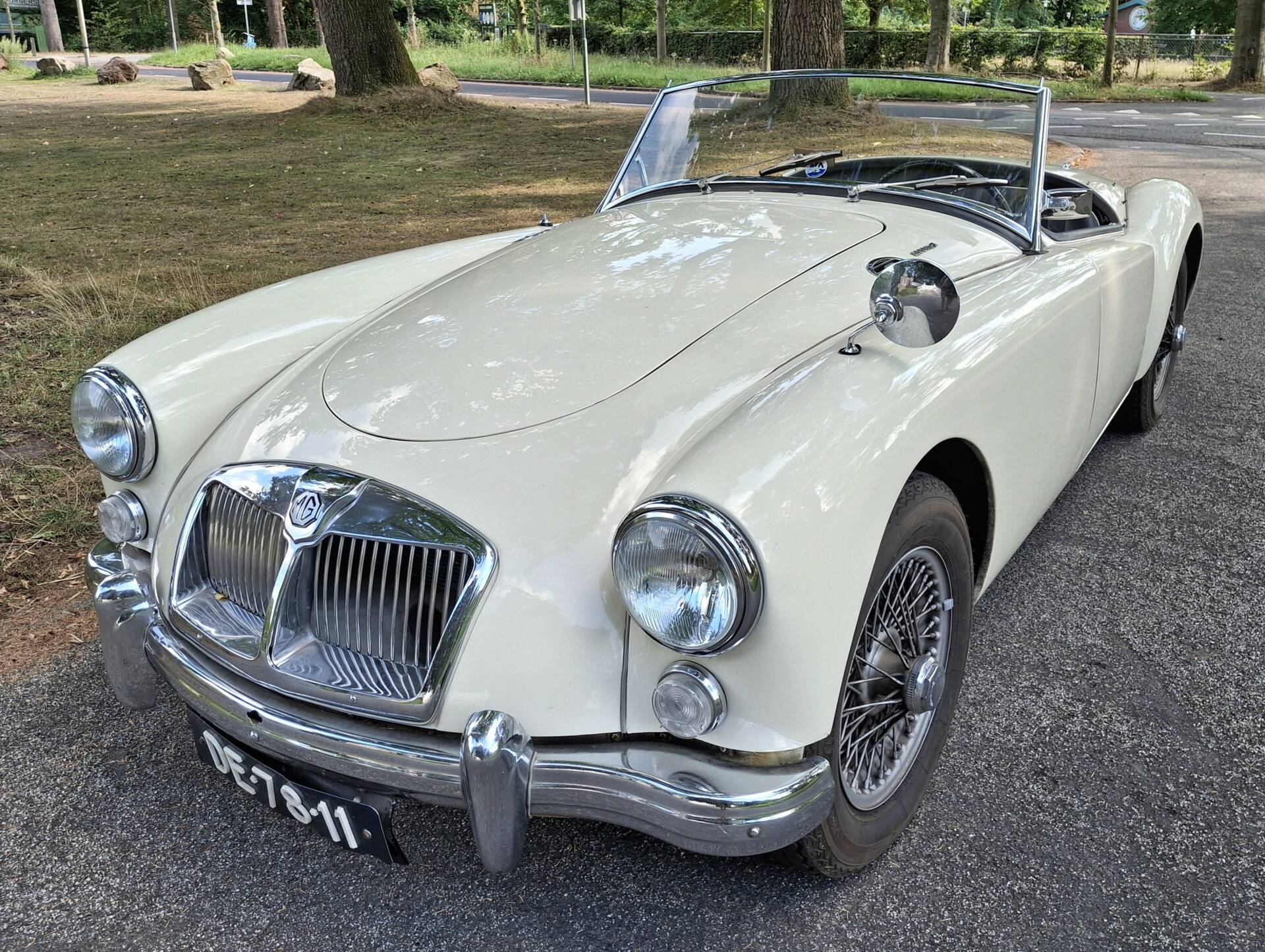 Authentic MG A MkII Roadster in original Old English White colour. Texas import 1991, original left steering wheel. Reassembled in 2000 by first NL owner, with new electricity wiring and floor boards. Since then less than 4900 Miles. Spoke wheels with choice of octagon or winged hub nuts, spare tyre, black vinyl roof and tonneau, black leather upholstery, 12 V battery of 2025, power interruptor. Original instruction booklet and key. Original radio. Original blue license plates.