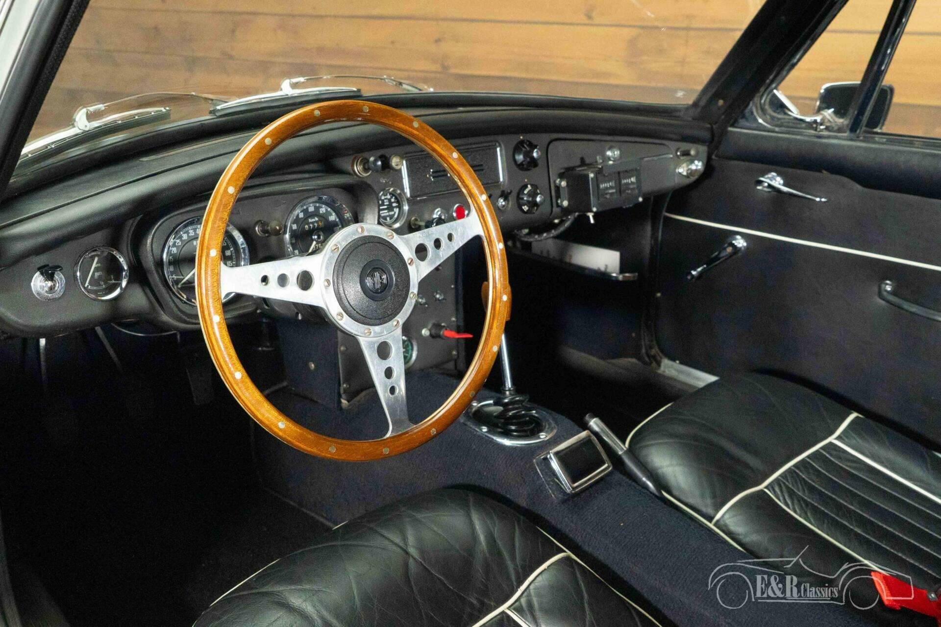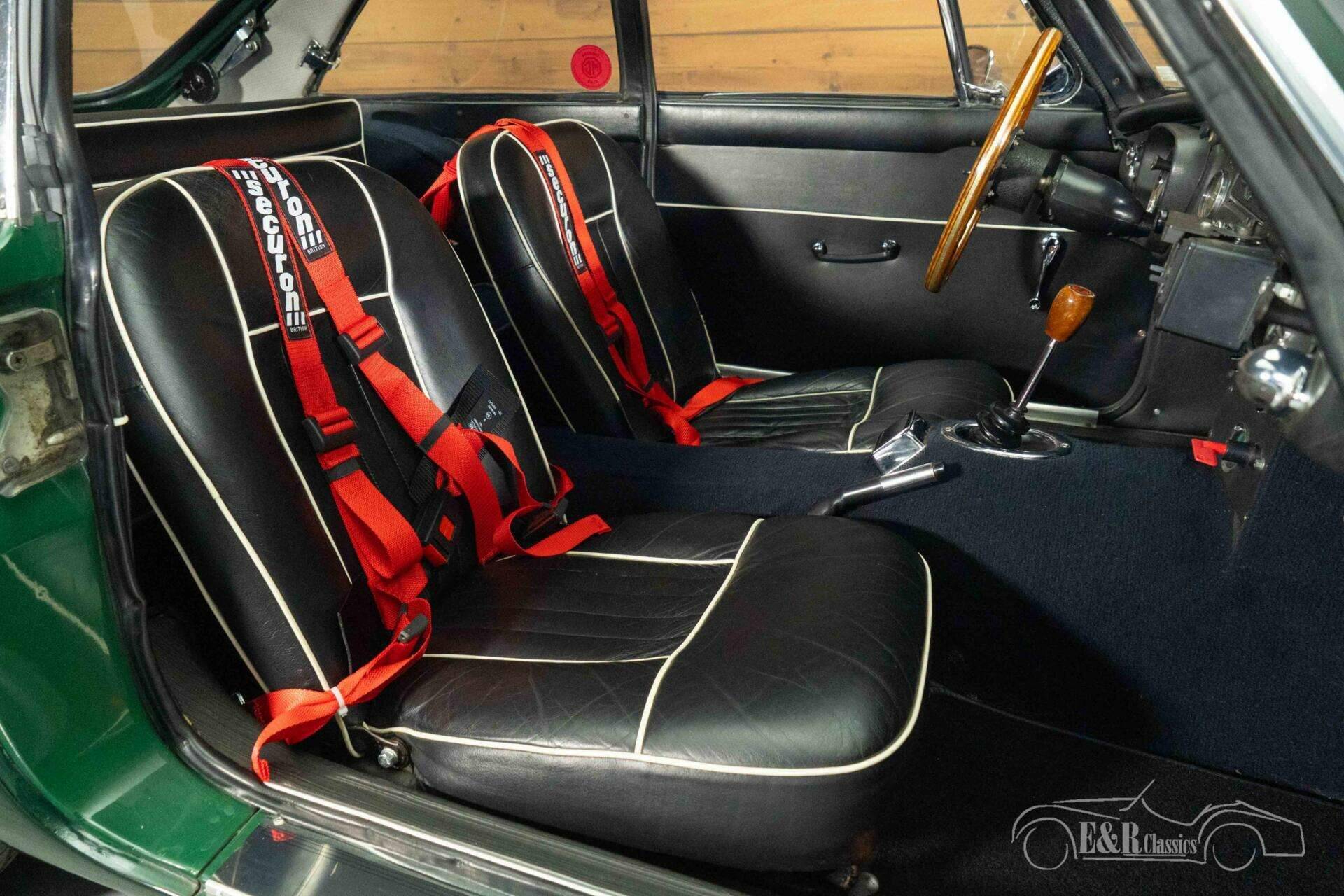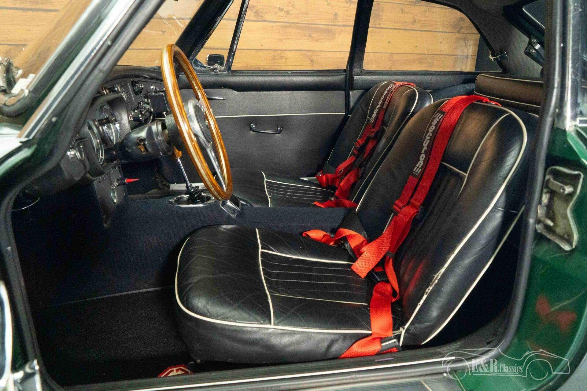 The exterior of this MGB GT is finished in timeless British Racing Green, a color that perfectly suits the character of this British sports car. The bodywork is stylishly accentuated by classic Minilite wheels and extra spotlights at the front, creating a sporty and authentic look. The interior seamlessly complements this with a beautiful vintage-style dashboard and a characterful Monolita sports steering wheel with a wooden rim. The black upholstery with contrasting piping gives the whole a chic and sporty appearance, while the fitted seatbelts provide a subtle modern upgrade. Together, this creates an atmospheric cockpit where classic design and driving experience take center stage.
