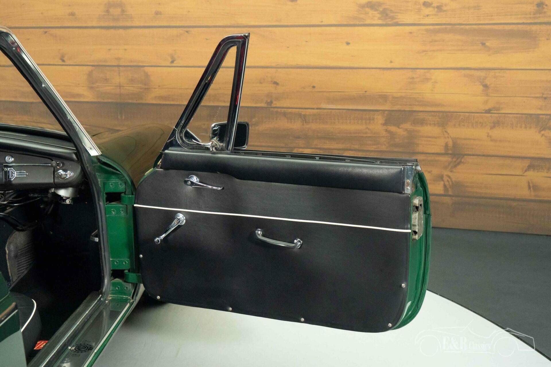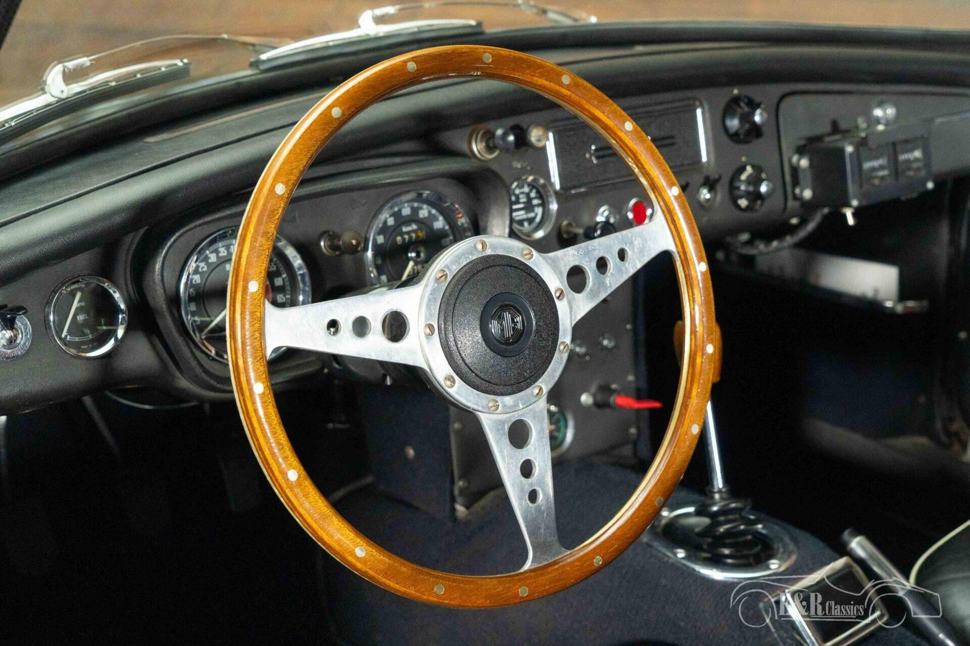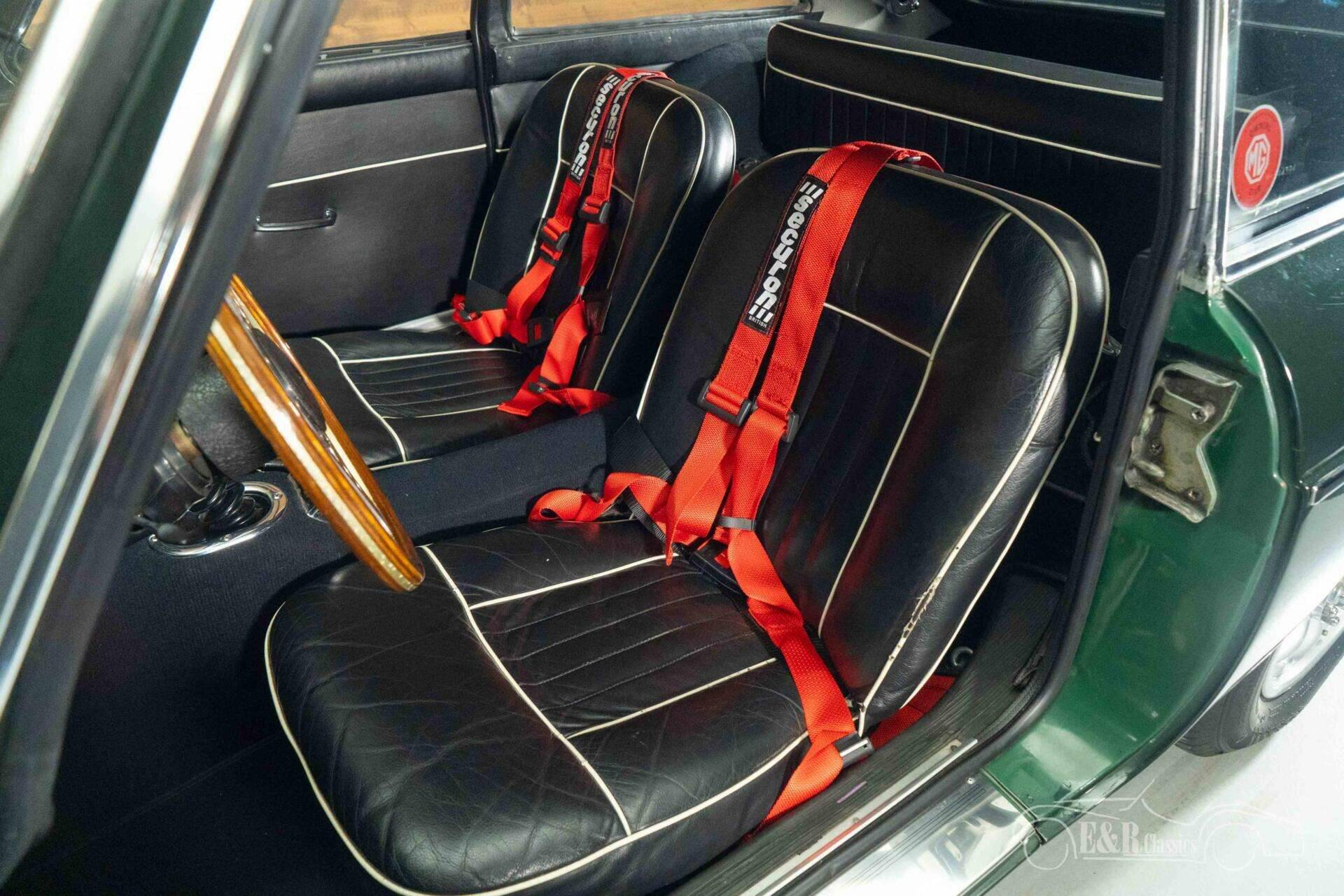 The exterior of this MGB GT is finished in timeless British Racing Green, a color that perfectly suits the character of this British sports car. The bodywork is stylishly accentuated by classic Minilite wheels and extra spotlights at the front, creating a sporty and authentic look. The interior seamlessly complements this with a beautiful vintage-style dashboard and a characterful Monolita sports steering wheel with a wooden rim. The black upholstery with contrasting piping gives the whole a chic and sporty appearance, while the fitted seatbelts provide a subtle modern upgrade. Together, this creates an atmospheric cockpit where classic design and driving experience take center stage.