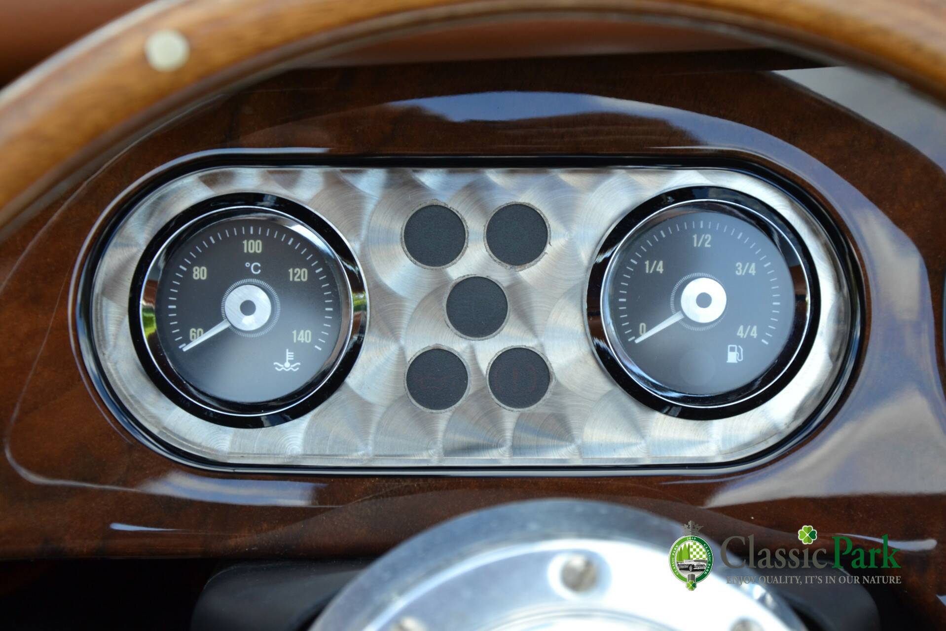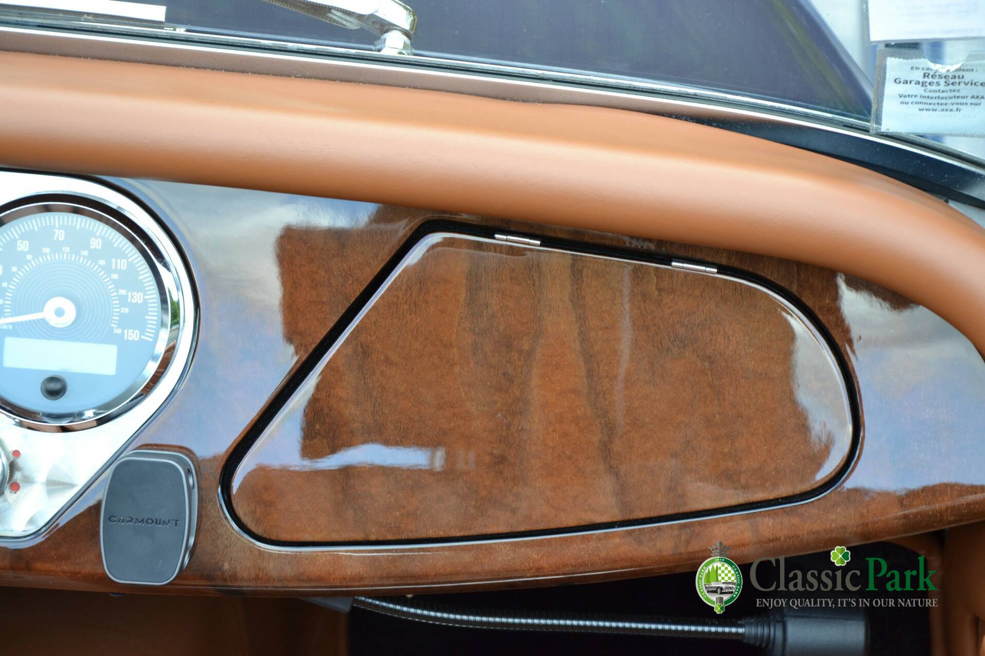 The interior feels fresh and inviting. The Moto-Lita steering wheel, walnut dashboard with aluminum instruments, and high-quality leather create an authentic atmosphere. A radio provides music, and there is space for luggage behind the seats. As a finishing touch, the car comes with a unique aluminum suitcase in the same style as the dashboard.