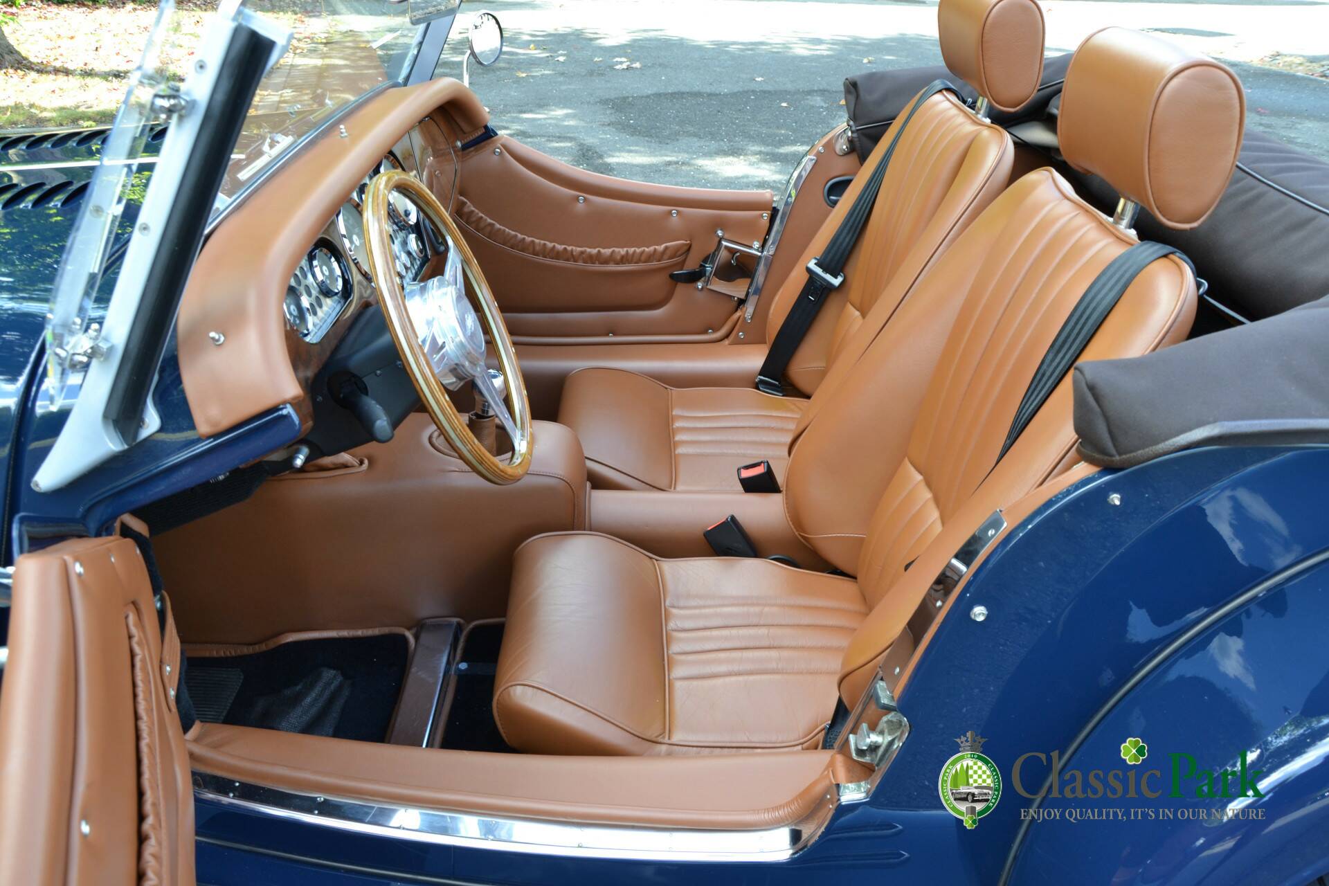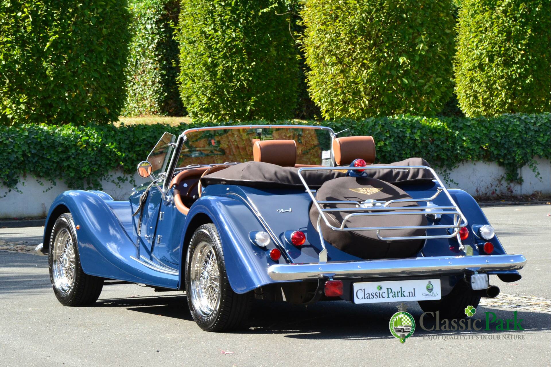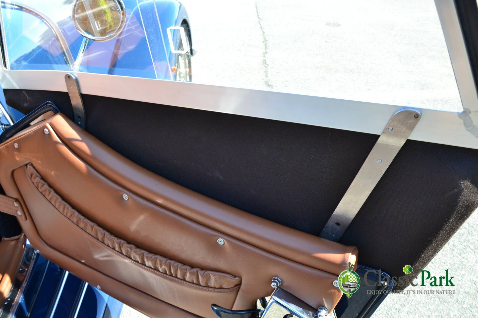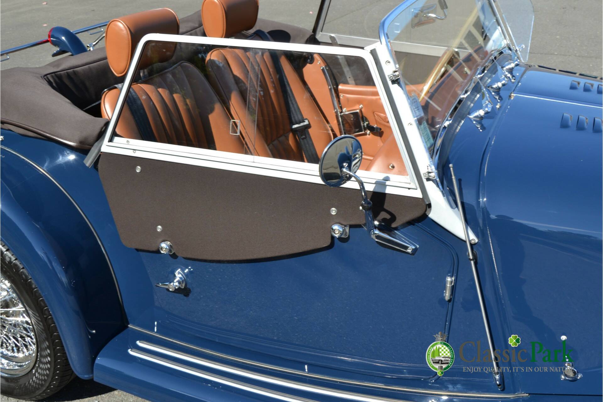 Under the long bonnet lies a smooth 2.0-liter Ford four-cylinder engine producing 156 hp, paired with a five-speed manual gearbox. Reliable, powerful, and refined enough for long European journeys, yet playful on winding roads. This Morgan looks stunning in Navy Blue, beautifully complemented by the brown mohair hood, spare wheel cover, and tonneau cover. The bodywork is straight, free from corrosion or damage, and the paintwork is in excellent condition.