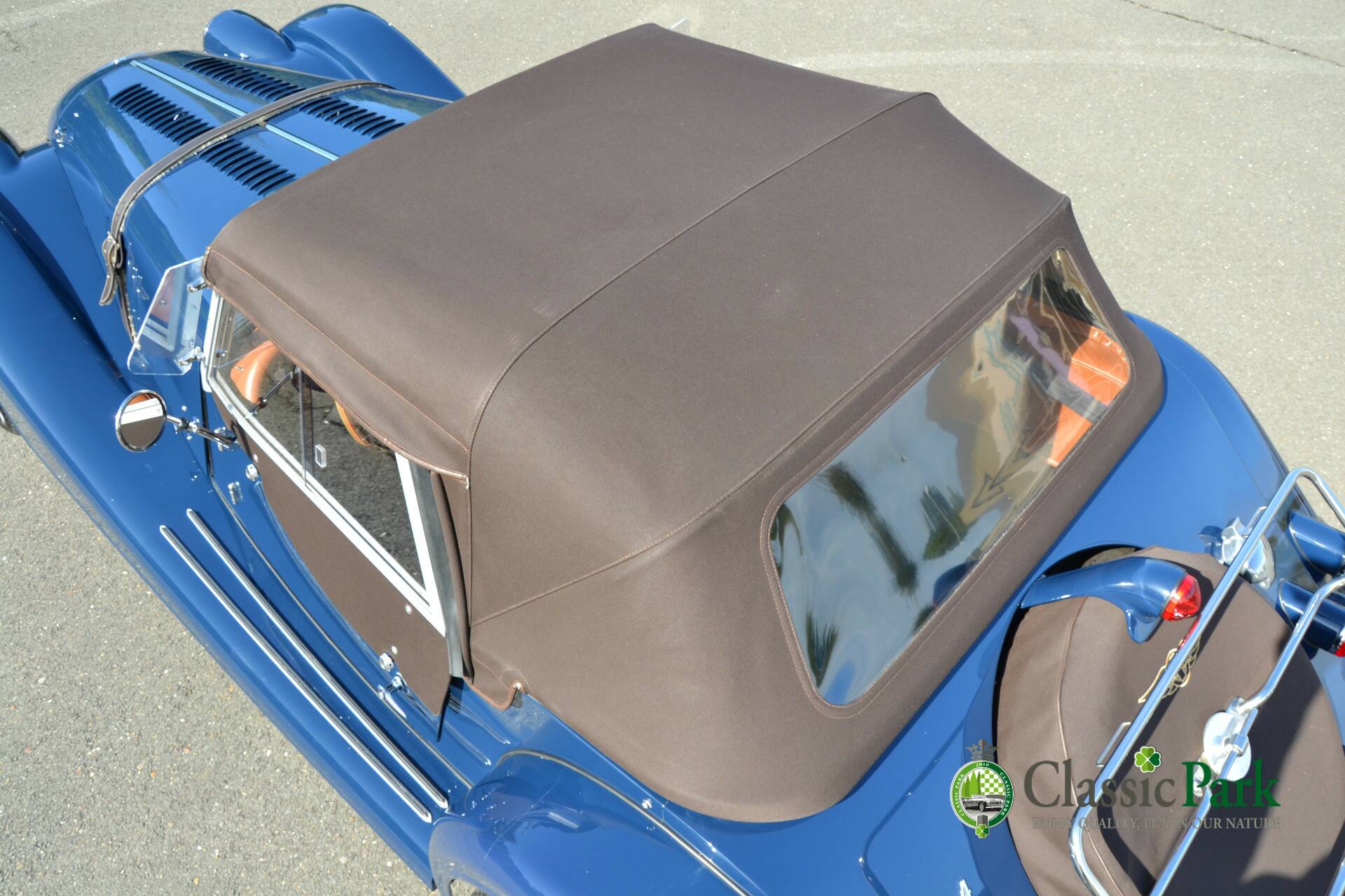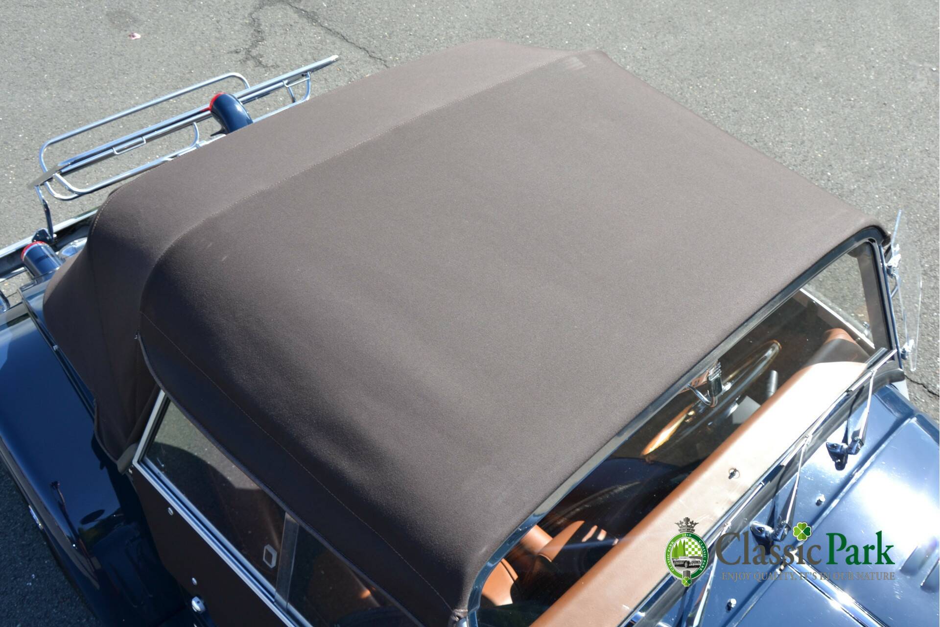 All vulnerable parts have been fitted with high-quality PPF – including the fenders, running boards, and grille. Even the section under the leather bonnet strap is protected with PPF against rubbing marks. The interior has also been fully cared for; the tobacco-colored leather remains in fine condition thanks to regular cleaning and maintenance. The beautiful mohair hood fits perfectly, and the quick-fit soft-top system allows it to be mounted in seconds.