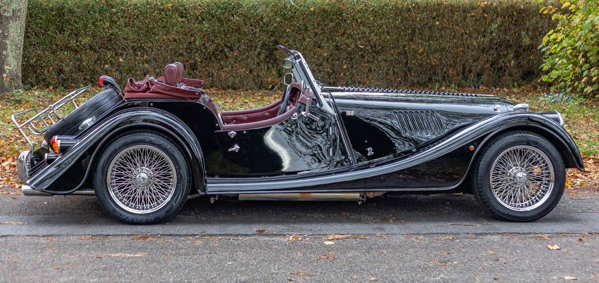 Traditional looking in its gloss Sport Black paintwork, the Roadster has optional 16” chrome wire wheels and overriders fitted front and rear. A 2-tier luggage rack is also fitted, above the spare wheel. The car has a colour-matched Burgundy hood, together with a tonneau cover and bag for the side screens.