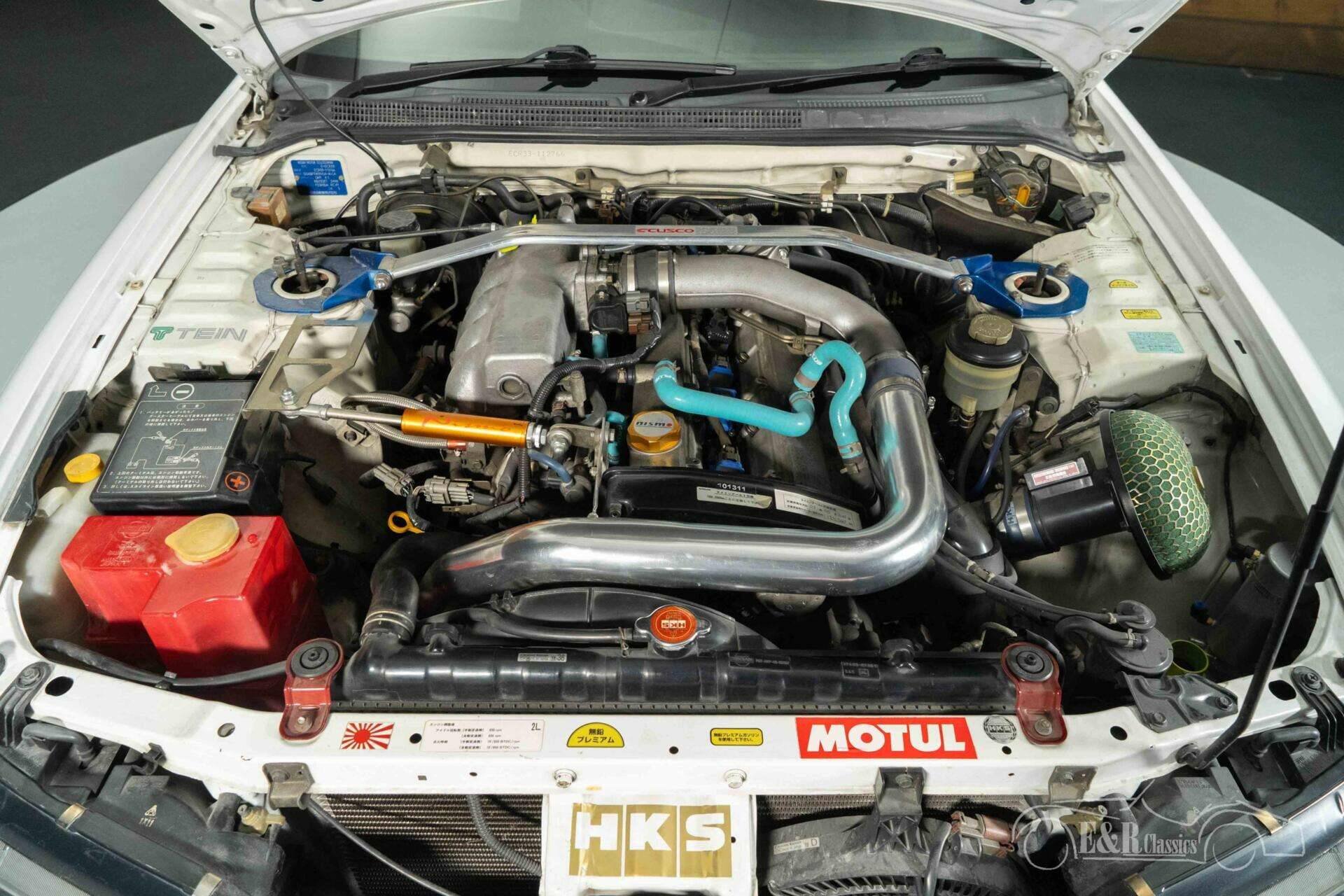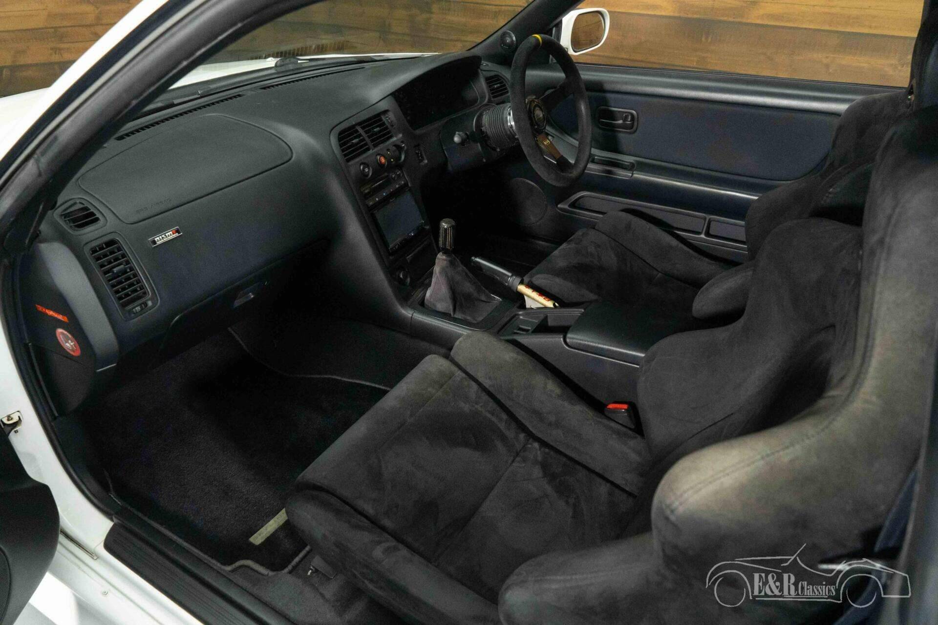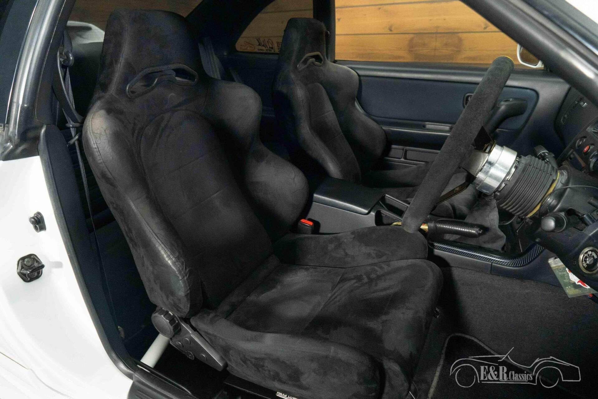 The exterior features original white paintwork and is enhanced by a striking Veilside body kit, giving the Skyline an aggressive and timeless look. The white alloy wheels perfectly complement the sleek overall look. Inside, a black Alcantara interior not only looks sporty but also perfectly complements the car's character. The interior beautifully contrasts with the exterior and exudes that typical JDM atmosphere, where everything revolves around the driver and the driving experience. This Skyline is an impressive sight, both stationary and on the road.