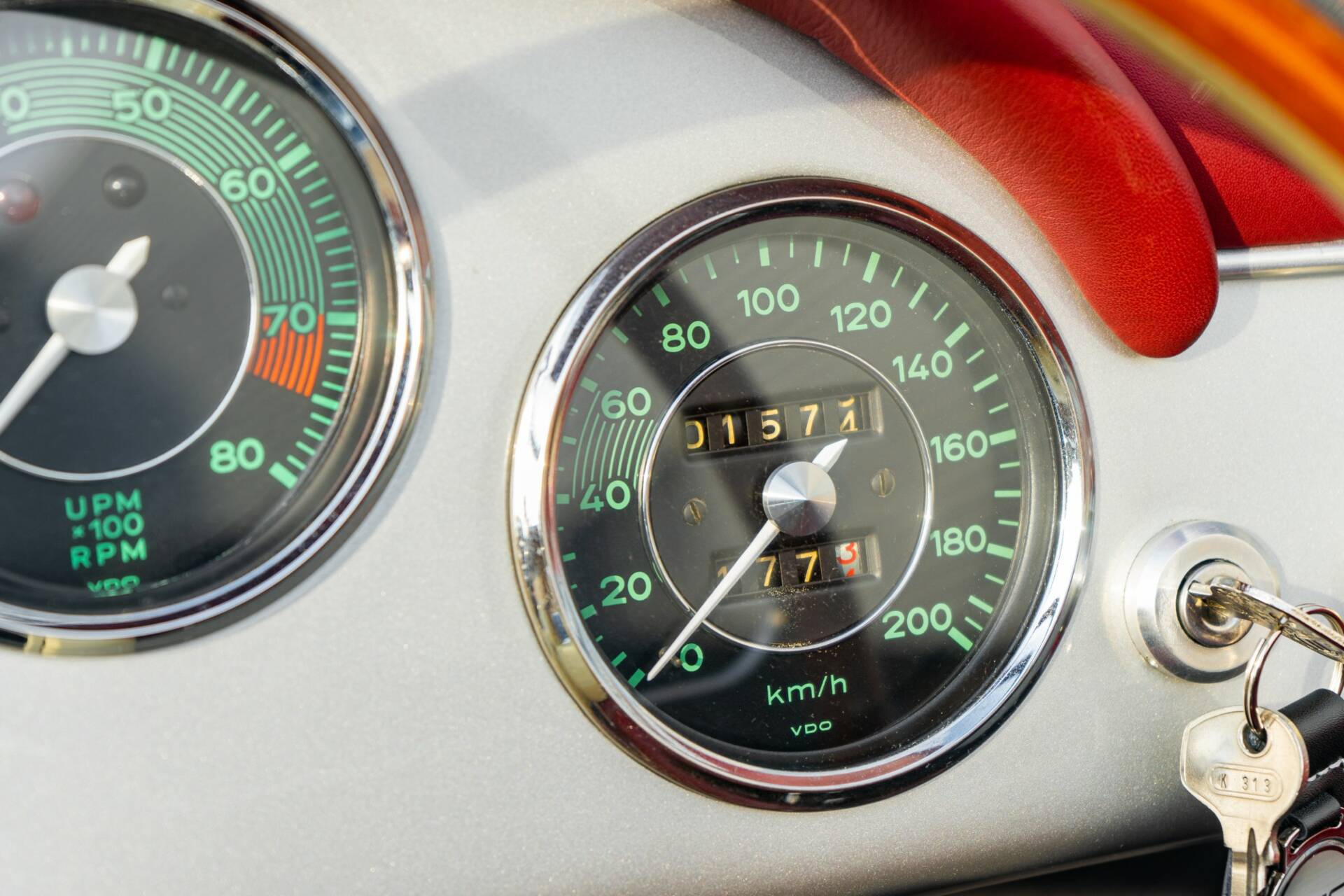 The Speedster is offered with its Reutter Certificate, a copy of the factory Kardex build sheet, jack, full tonneau cover, and the correct Rudge copper hammer. The car starts easily, runs smoothly, and delivers a solid, confidence-inspiring drive. The rare 4.5x15J chrome Rudge wheels (date-stamped and original) are shod with fresh 2021 Vredestein Sprint Classic tyres in 165R15. The odometer shows 1,577 kilometers, believed to be since restoration, and the car has just been serviced, with the previous service carried out in July 2024.
