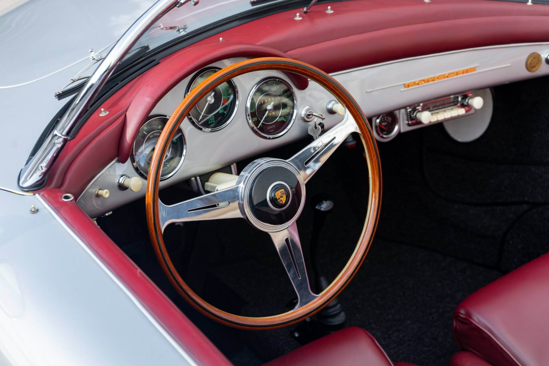 The Speedster benefits from an older, high-quality restoration, which remains in excellent condition today. The work was carried out with great attention to authenticity: original components were retained and carefully restored rather than replaced, while new old stock Porsche parts were sourced where required. The interior features a period Nardi wood-rimmed steering wheel, a Blaupunkt radio, and an auxiliary oil pressure gauge. The VDO instruments were restored, and the brightwork was refinished by specialists. Finished in the classic color scheme of Silver Metallic over Weinrot (dark wine red), the restoration still presents beautifully with only light signs of use.