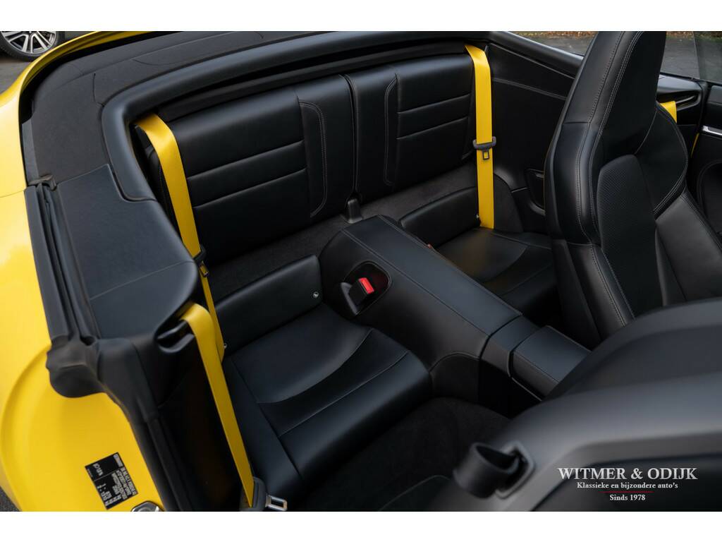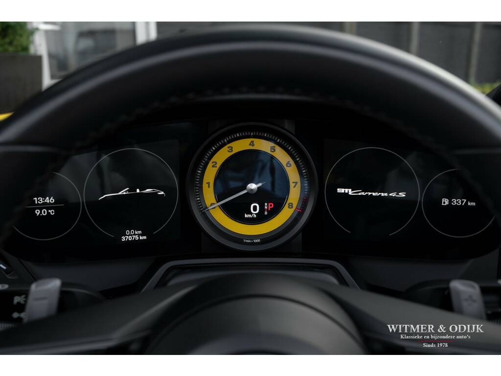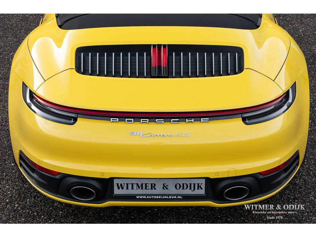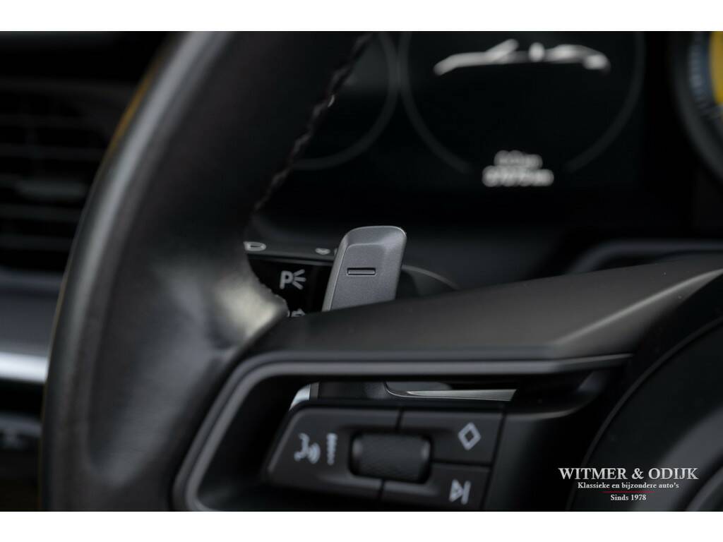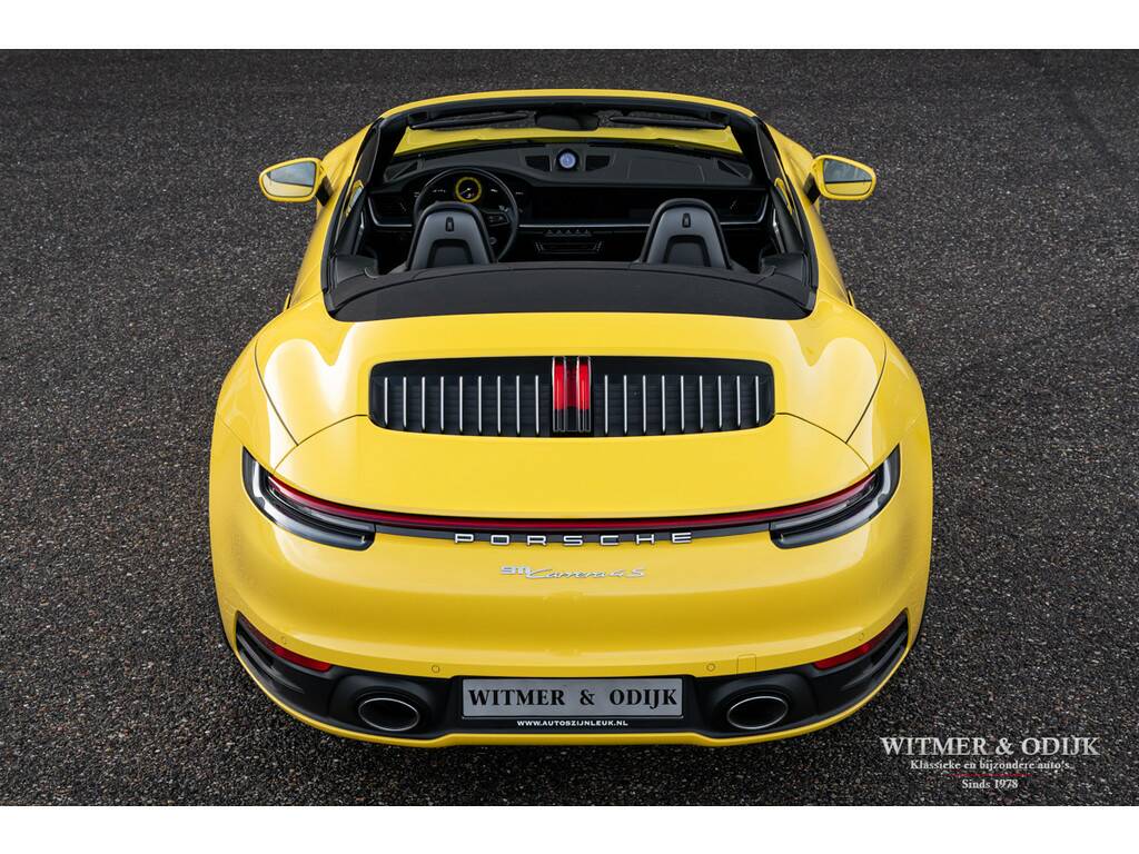 Autofabrikanten gebruiken de meest exotische namen voor de carrosserie kleuren die ze aanbieden. Bij Porsche zijn ze graag wat directer wanneer het om kleur gaat...Racing Yellow! Kan het duidelijker? Niet dat de slechts twee vorige eigenaren het circuit verkende met deze 911. Maar dat we het hier over de beste sport!wagen ter wereld hebben bekrachtigd die kleurnaam nadrukkelijk. Op de foto's komt de auto nog niet half zo sterk voor de dag als dat deze in het echt is, iedere keer als ik door onze showroom loop kan ik mijn ogen niet van deze Porsche afhouden. Met name in deze cabrio versie, met het fraai contrasterende dak en zwarte accenten komt de heerlijk welvende carrosserie zo mooi tot zijn recht. Optisch overigens in nieuwstaat, ook het interieur is als gevolg van de aantrekkelijk lage kilometerstand in topconditie. Voorzien van alle belangrijke opties; zo zijn er o.a. automatische dual zone climat control, regelbare stoelverwarming, meervoudig elektrisch verstelbare stoelen met geheugen, Sport Chrono pakket (met fraai in geel uitgevoerde wijzerplaat), schakelbare sportuitlaat, Porsche Communication Management met navigatie en Carplay, achteruitrijcamera, rondom Parc Distance Control, cruise control, LED verlichting, elektrisch opklapbaar windscherm, Bose soundsystem met subwoofer, multifunctioneel en verstelbaar GT sportstuur, een volledig in leer uitgevoerd interieur, prachtige lichtmetalen velgen 20 en 21 inch, etc. De carrosserie, het cabriodak, de velgen en bumpers, alles is optisch in bijzonder fraaie nieuwstaat. Rijklaar in onze showroom, maak a.u.b. even aan afspraak als u deze 992 Carrera 4S wilt bezichtigen.