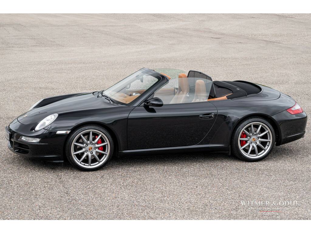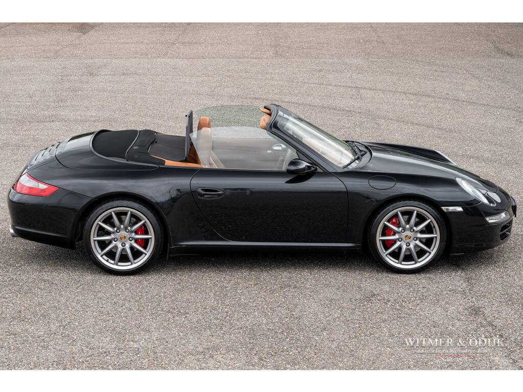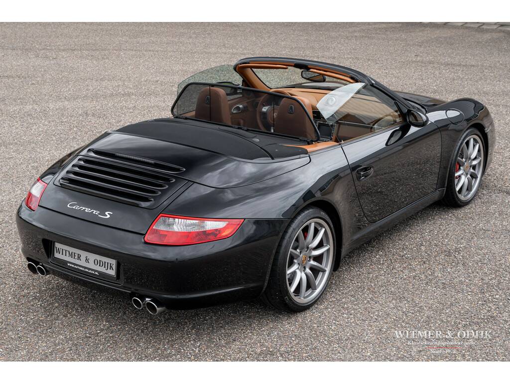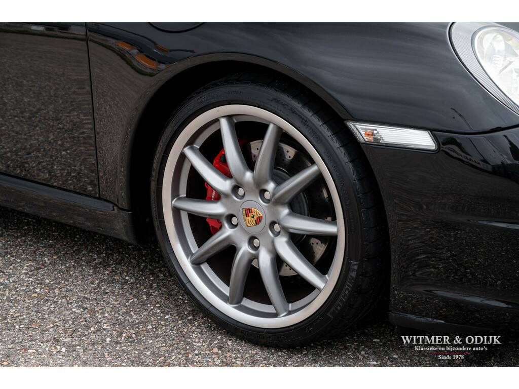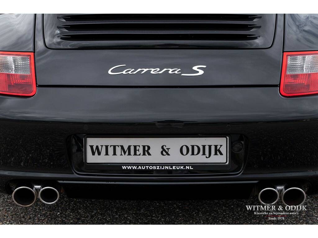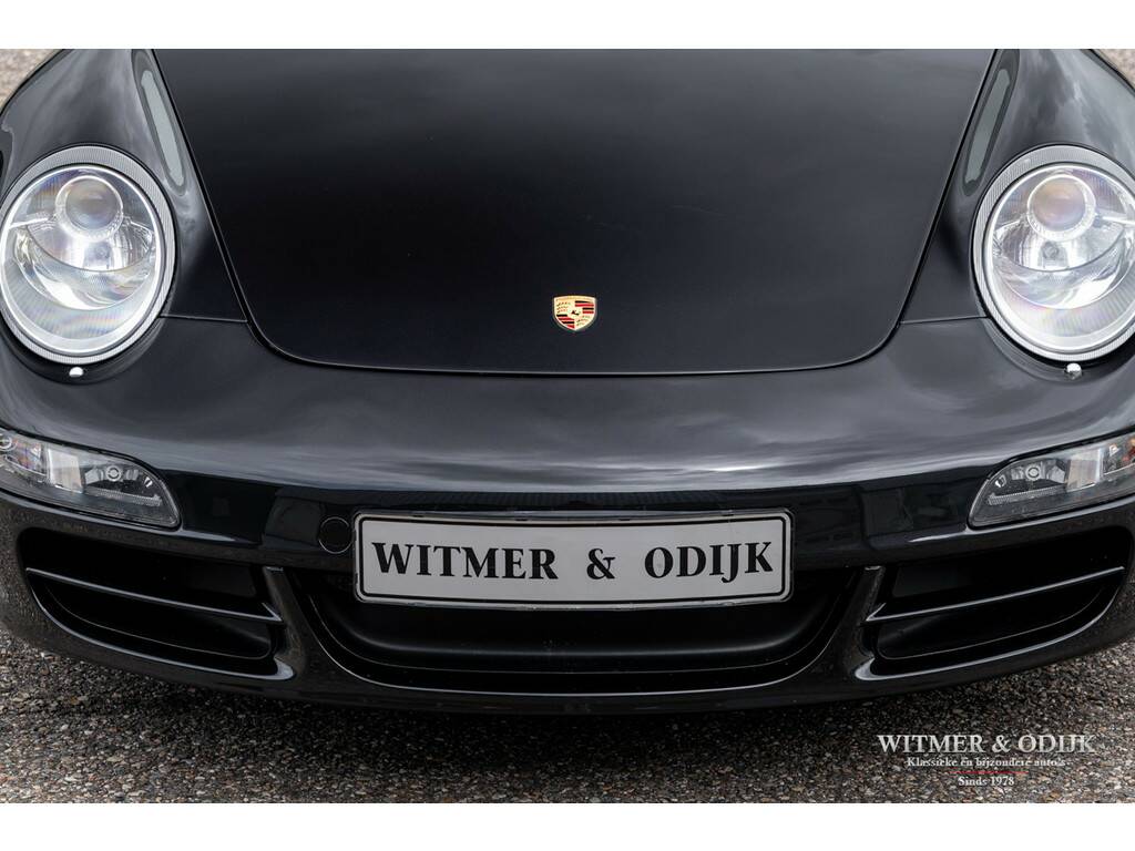 In de 997 herkennen de meeste Porsche liefhebbers de voor hen optimale 911. Terug van weggeweest na de 996 zijn de ronde koplampen, niet te klinisch, niet te groot, niet te poenerig en natuurlijk die heerlijke brede achterpartij. Vooral bij de cabriolet met het contrasterende cabriodak komt die zo goed tot haar recht. Dit in combinatie met de moderne versie van Porsche's watergekoelde zescylinder boxer. In de Carrera S uitvoering levert deze 3,8ltr. motor maar liefst 355pk. Dat lijkt met het dak open dan wel bijna een motorfiets zonder helm... in 5,5 sec. flitst u naar de 100km/u en dat gaat dan pijlsnel door naar 290km/u. Even naar Albert Heijn kan in alle rust overigens. De 997 wordt ook geroemd om zijn allround inzetbaarheid. Deze Carrera S Cabriolet is een prachtige verschijning in Basalt Black Metallic met diep zwart cabriodak. Voorzien van een flinke lijst interessante en goed bij de configuratie van de auto passende opties. Het hier aangeboden exemplaar is voorzien van de handmatige versnellingsbak. De Carrera S versie kreeg ter herkenning van de fabriek rode remklauwen en dubbele uitlaten. De Porsche 997 is een cabriolet die met het dak erop óók mooi is. U bent van harte uitgenodigd dit eens van dichtbij te komen bekijken. Zeer compleet te noemen; Porsche Sport Chrono, cruise control, automatische climate control, elektrische stoelverstelling, boordcomputer, Porsche Communication Management met DVD navigatie en CD wisselaar, stoelverwarming, Parc Distance Control achter, Porsche Active Suspension Management, xenon verlichting, Porsche Stability Management, verstelbaar stuur, opvouwbaar windscherm, een volledig in leer uitgevoerd interieur, Bose luidsprekers met subwoofer, etc. In stijlvol Basalt Black Metallic uitgevoerde originele schadevrije carrosserie. Altijd schadevrij gebleven. Geen waarneembare steenslag en zonder zichtbare gebruikssporen. Ook de bumpers zijn vrij van parkeervegen of beschadigingen. Het zwarte cabriodak heeft geen slijtplekken en is voorzien van een verwarmde glazen achterruit. Het interieur heeft geen vermeldenswaardige gebruikssporen en er is nooit gerookt in de auto. Vloerbekleding onbeschadigd, originele foutloze mattenset aanwezig. Alle hendels en schakelaars mooi schoon en zonder slijtage. Afkomstig van de derde zorgvuldige liefhebber. Origineel in Nederland geleverd door Porsche Centrum Amsterdam. Het betreft hier een mooi origineel, schadevrij en perfect verzorgd exemplaar met een aantrekkelijk lage kilometerstand. Tot zeer recent onderhouden door de Porsche dealer. U krijgt haar mee voorzien van nieuwe APK, garantie en onderhoudsbeurt.