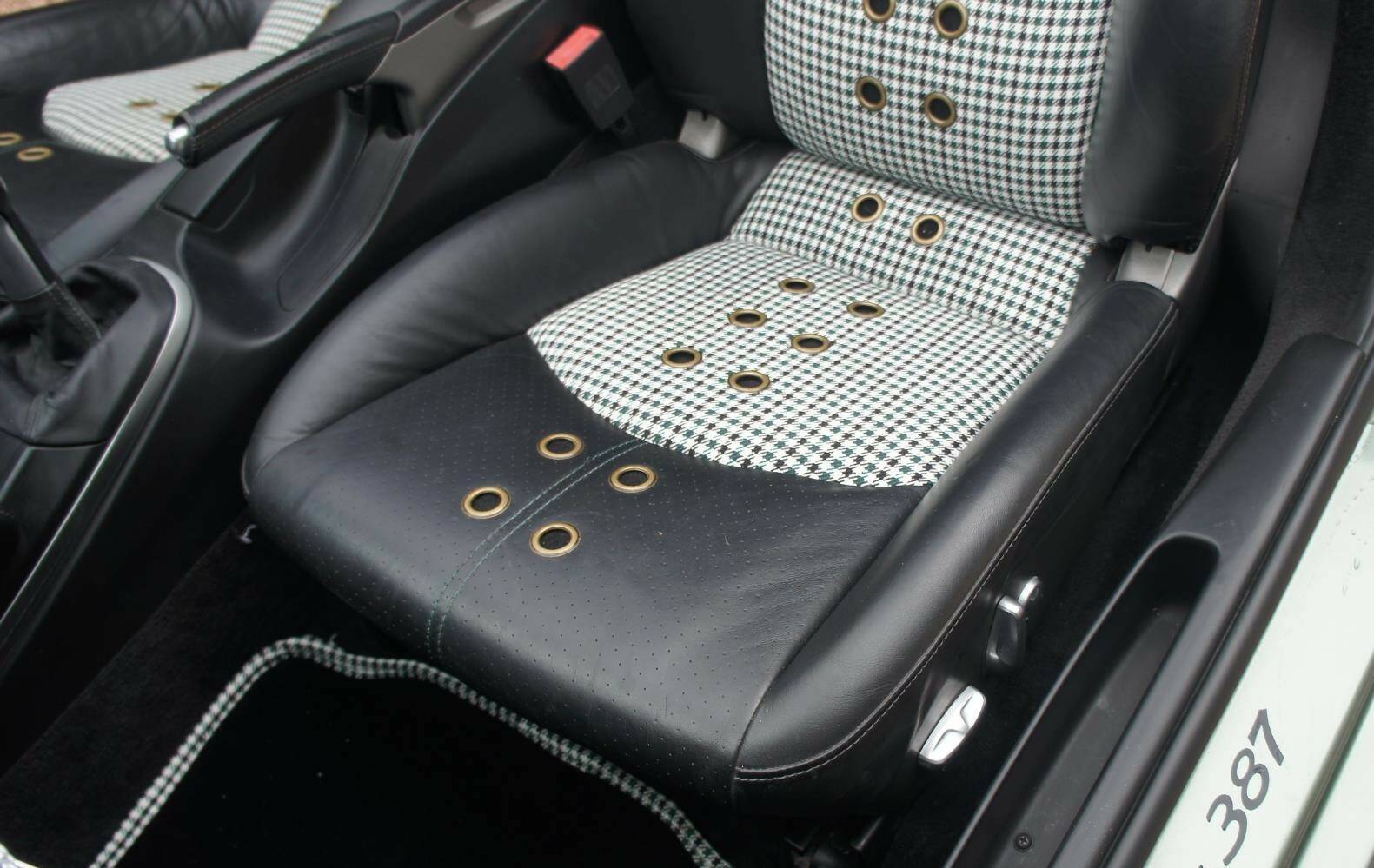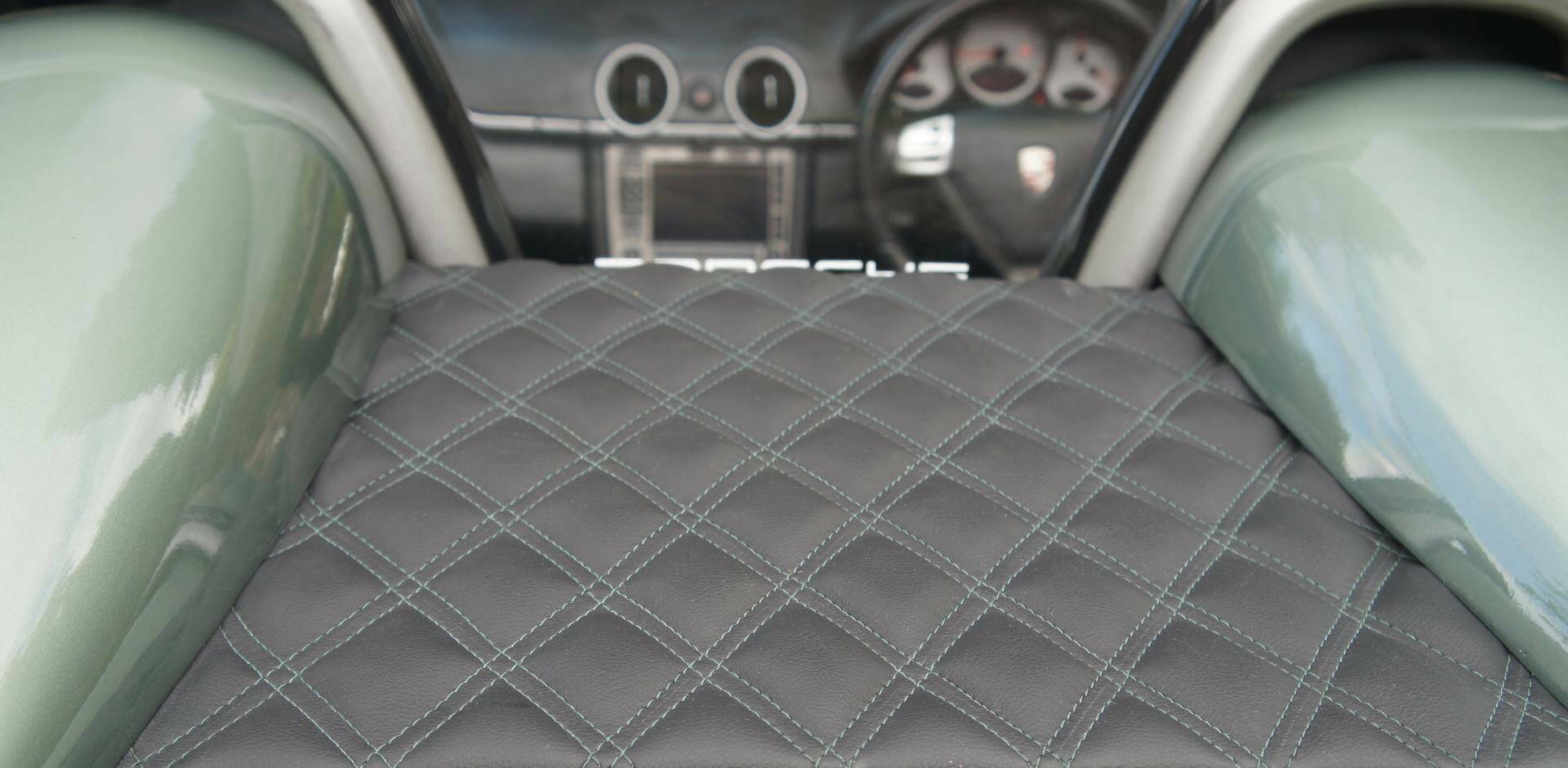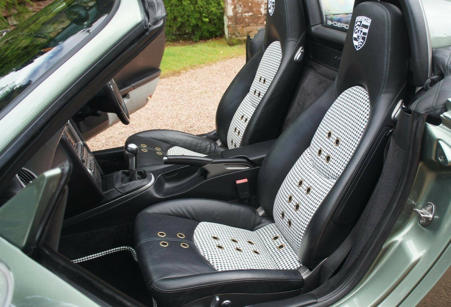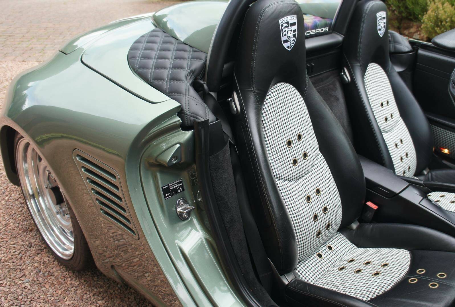 The original Porsche Black Soft-Leather Cabin has been uniquely re-imagined by Viking Interiors, Wirral. Now with a distinct, original, classic interior. Black Half Calf Skin Leather with Classic Porsche Green Pepita Grand Prix Cheque Seats, bespoke, 387 Spyder Floor Mat & matching Door Cards that creates a uniquely, *classic look *within a contemporary, practical cabin.