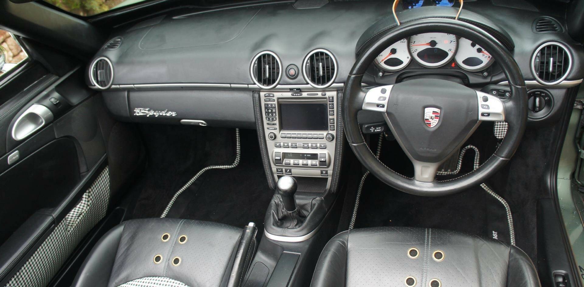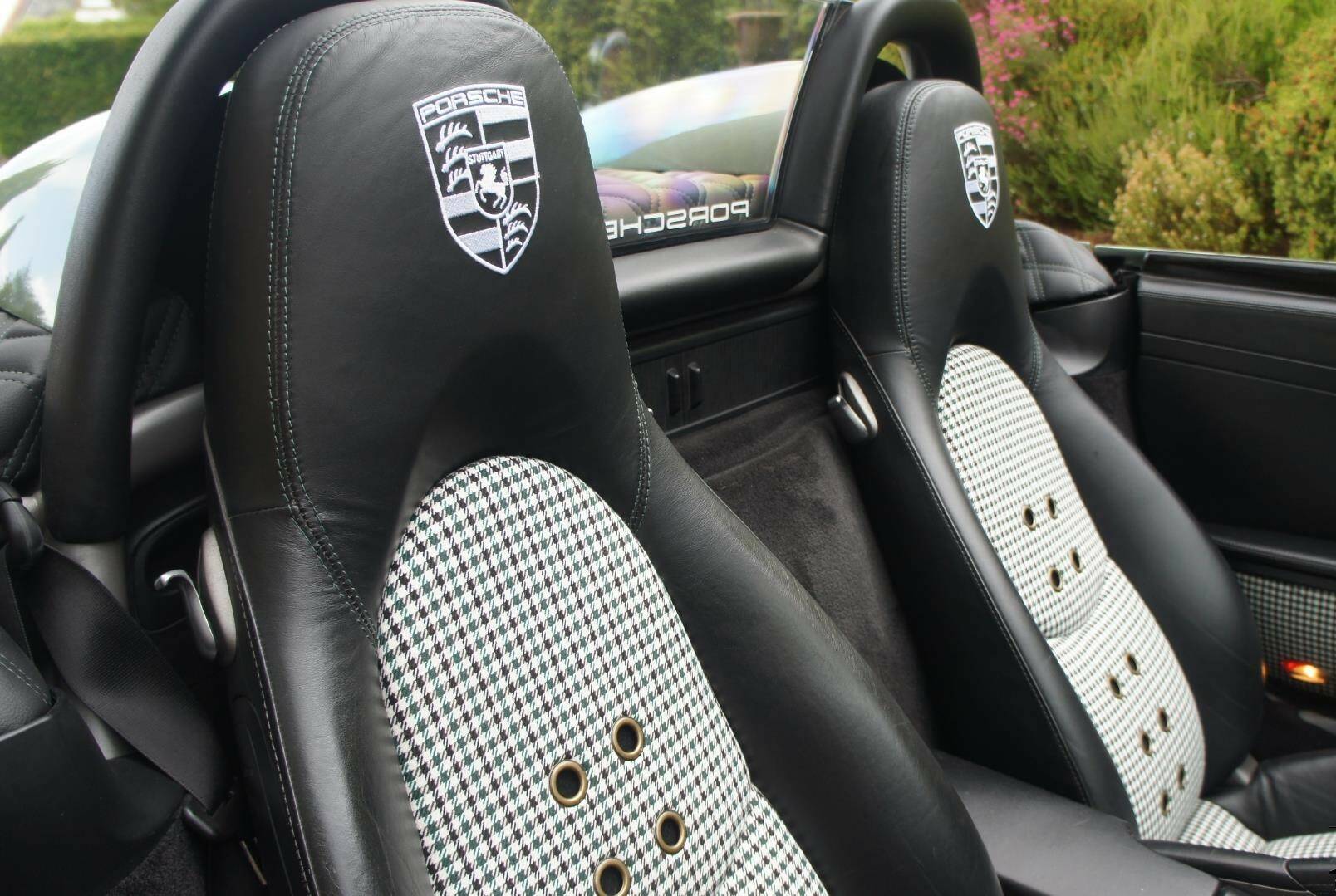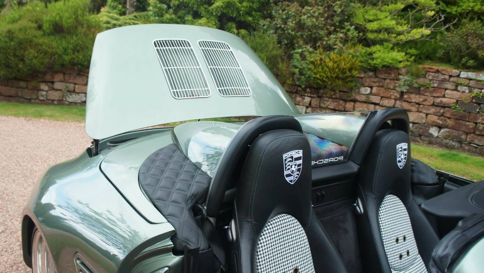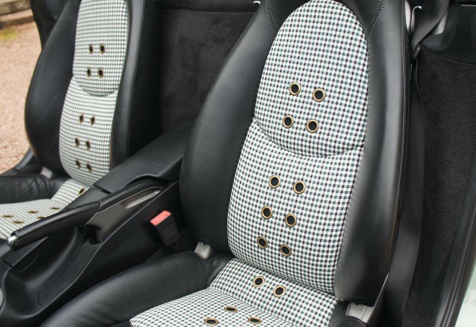 The original Porsche Black Soft-Leather Cabin has been uniquely re-imagined by Viking Interiors, Wirral. Now with a distinct, original, classic interior. Black Half Calf Skin Leather with Classic Porsche Green Pepita Grand Prix Cheque Seats, bespoke, 387 Spyder Floor Mat & matching Door Cards that creates a uniquely, *classic look *within a contemporary, practical cabin.