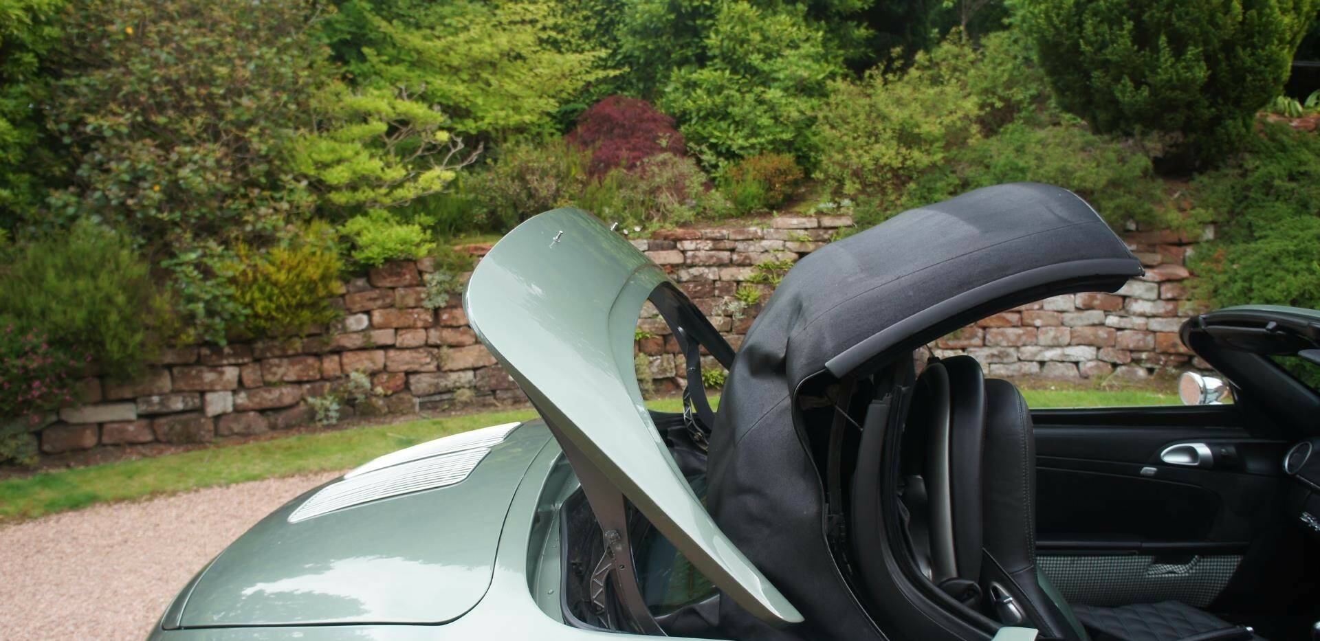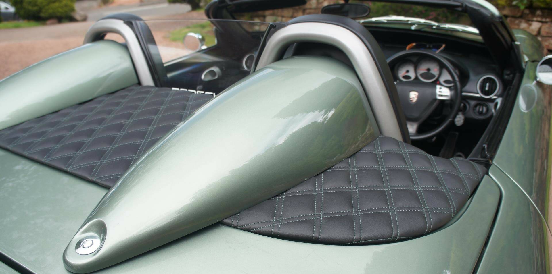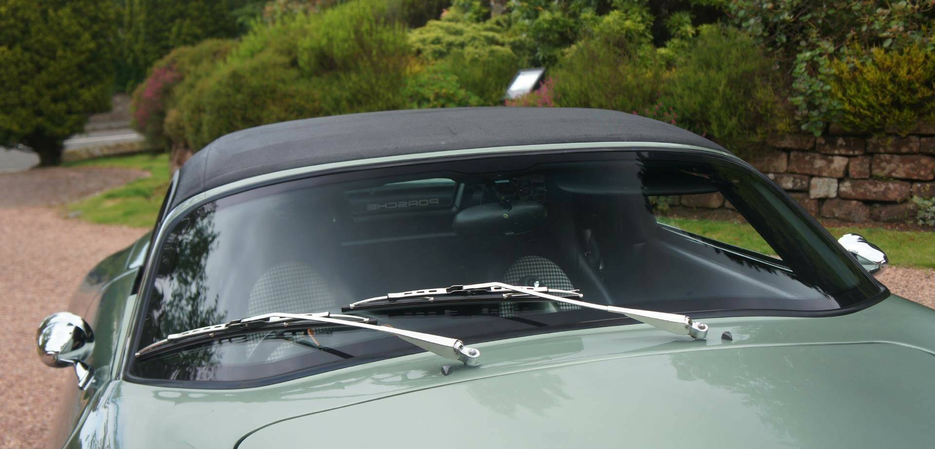 A stunning, bespoke, interior is further enhanced by distinctive, ‘vintage, distressed brass’ breathable Eyelets similar to those now *signatured *by Singer Porsche, plus; White, Embroider, Porsche Head Rest Crests, Green Stitched Sports Seats, to match the green Pepita Grandprix cheque and Bentley Style, Diamond patterned, rear speed turret shelves. All of which is quickly & easily detached, to be neatly stored within a spacious rear boot when the fully electric roof is activated. The roof is in excellent shape, reconditioned, ‘**Car Cleaning Guru’ **3 months ago Recolouring a Faded Fabric Top with Renovo.
