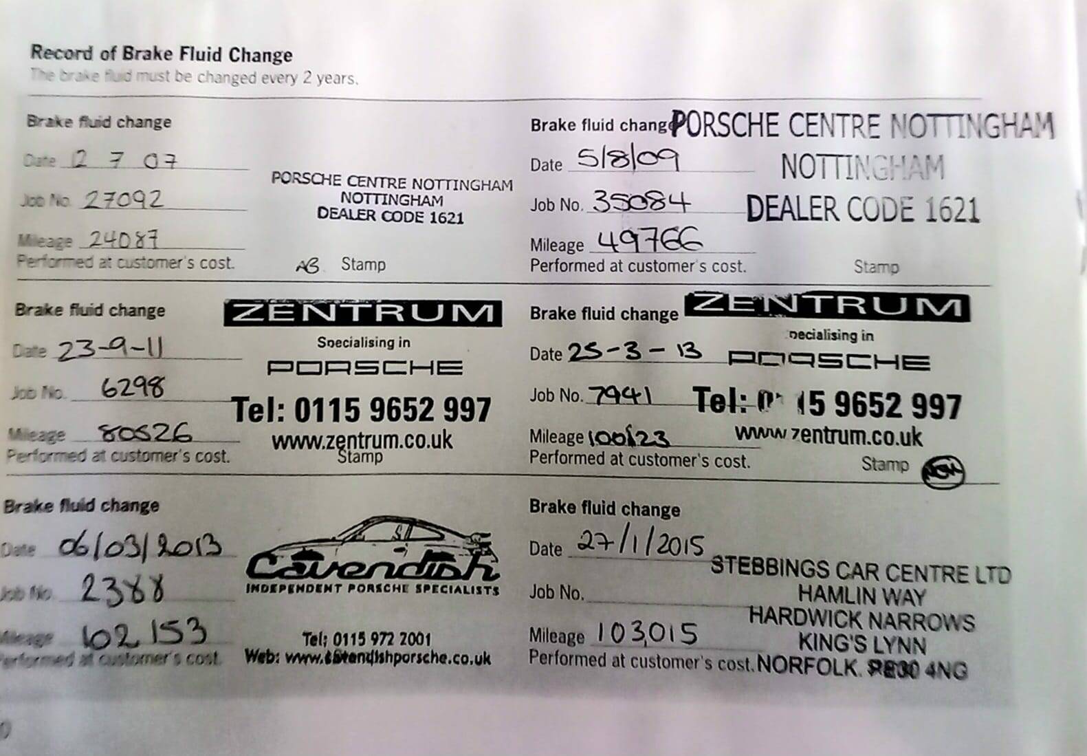 12/07/2007 – Brake fluid Change Porsche Centre Nottingham – Miles 24,087
