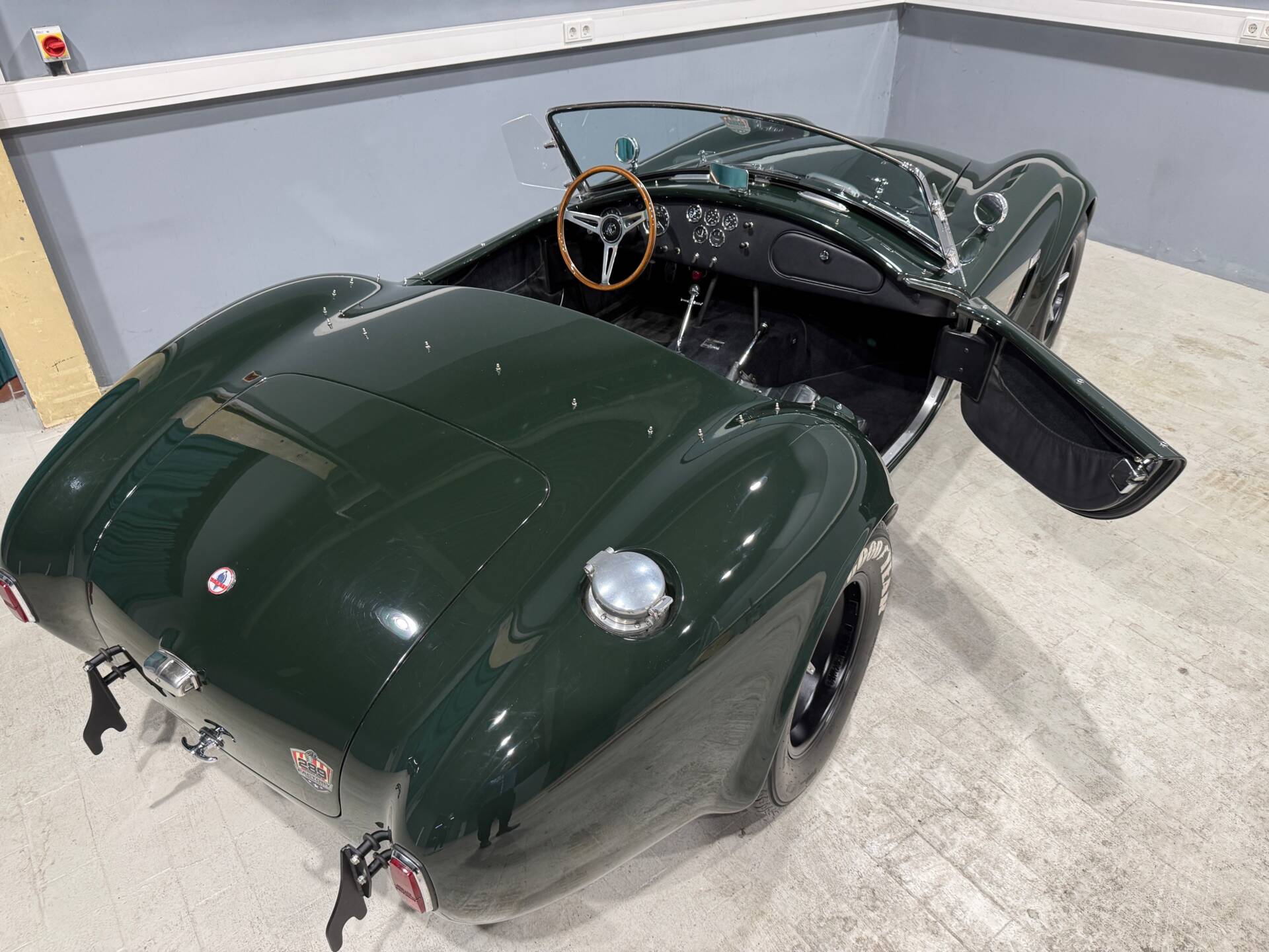 SHELBY COBRA 427 S/C STREET by ERA, Ford FE390 (6.7 ltr.) V8 Bigblock Benzinmotor mit 313 kW (500 PS), Holley Sniper Efi Vergaseranlage, Manuelles 4-Gang Toploader Getriebe, Aluminiumfelgen 15“ Halibrandt-Style in schwarz mit Zentralverschluß-System, Spax-Fahrwerk einstellbar, Avon-Bereifung, 2 Kirkey Aluminium Rennsitzschalen, Holzlenkrad, Smith Classic-Instrumente im Original-Look incl. Reverse Tachometer, Cobra le mans Aluminium Ventildeckel, Classic Raydot Aussenspiegel….