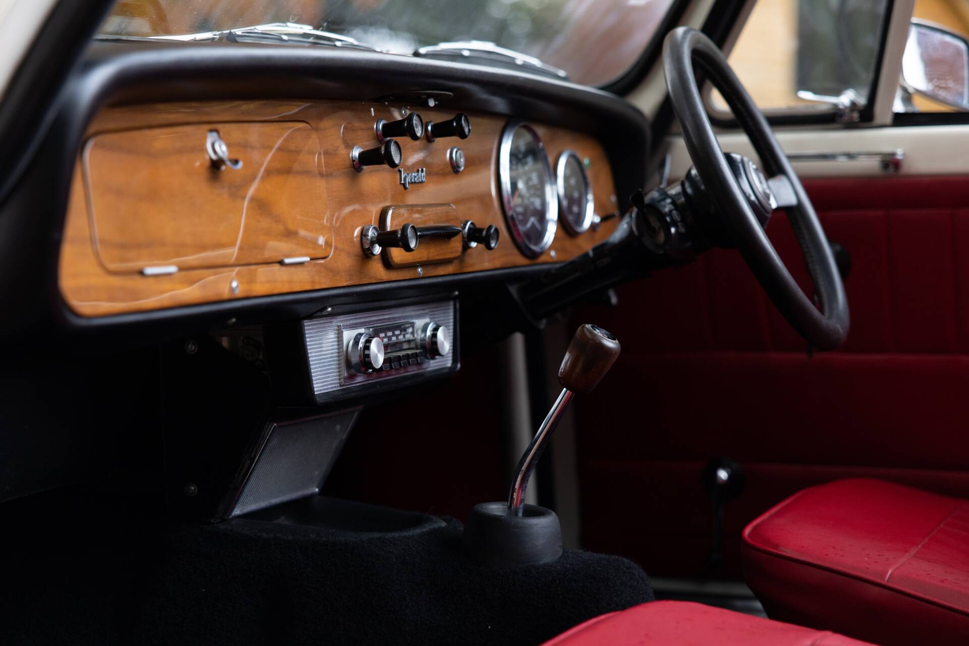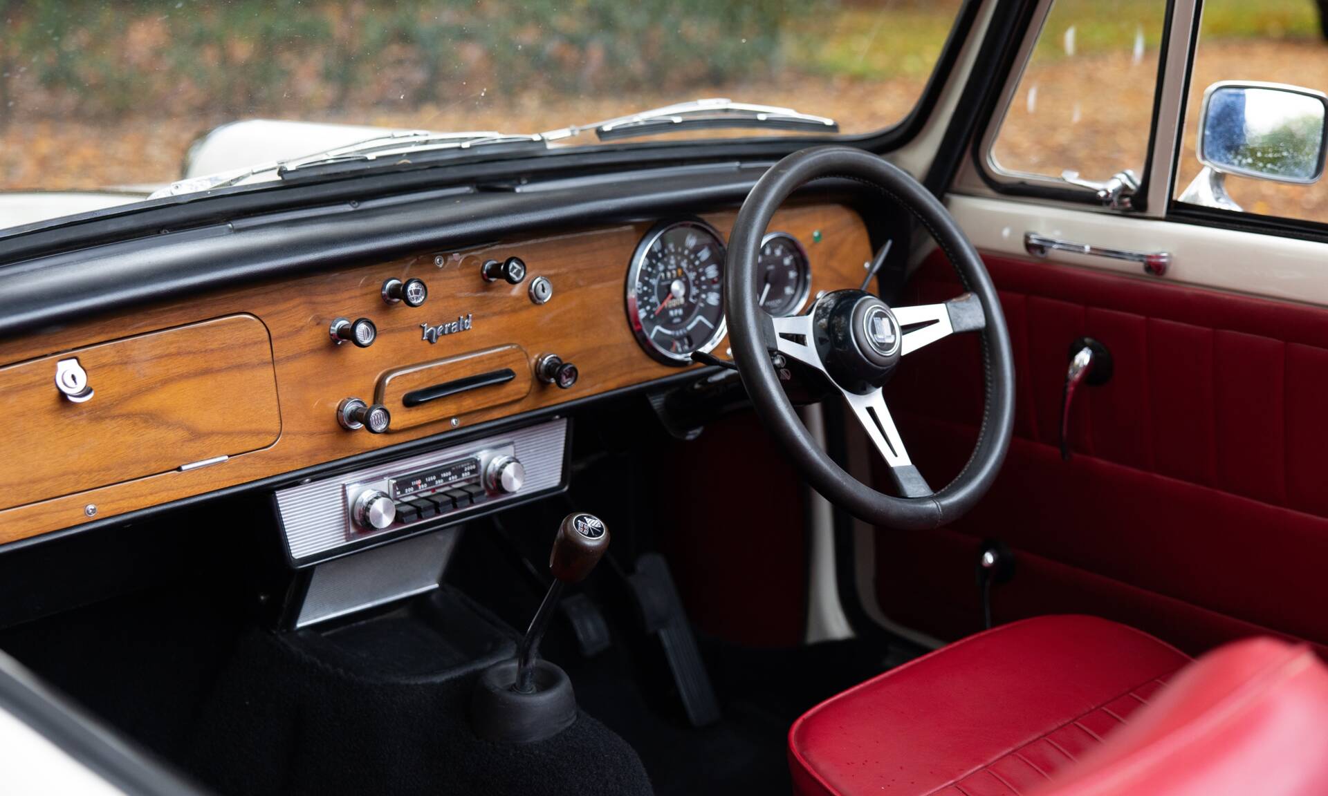 This rather special Triumph Herald Convertible was first registered on 10th February 1967.The original sales invoice shows the car was supplied by Brook Lane Garage, Ferring-on-Sea, Sussex to W.B. Shaw Esq. of Preston, Sussex. The specification states, “One new Triumph Herald Convertible with heater and disc brakes finished in N. White with red vynide trim and Black Soft Top complete with equipment as per Maker's specification”. All this, including purchase tax, delivery charge ex-works, anti-freeze, number plates, road fund licence, undersealing and four gallons of petrol, cost £763-12s-0d. The Herald stayed within the same family until 1993. In 2000, a comprehensive restoration began aiming for concours standards.