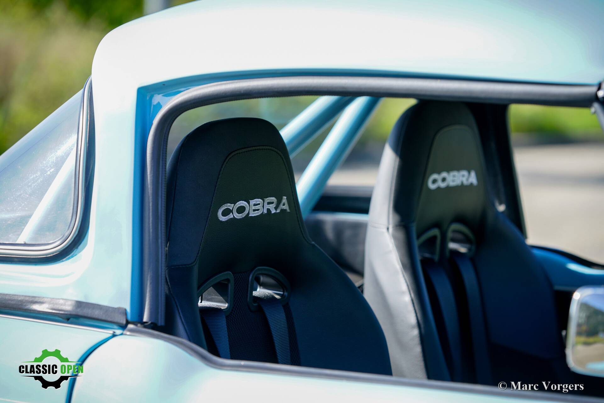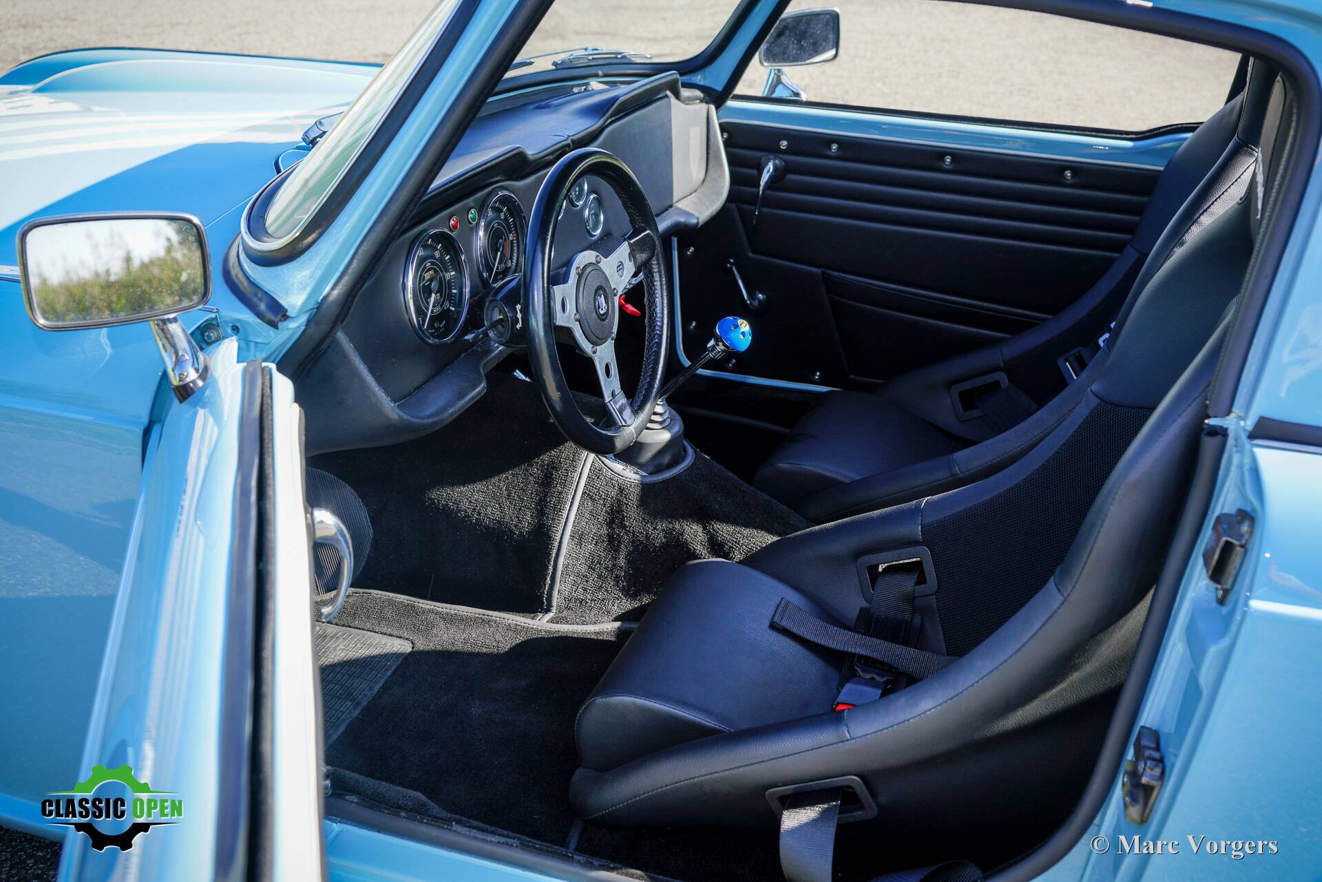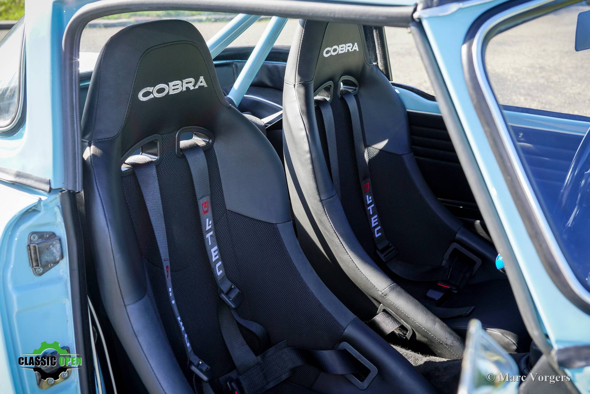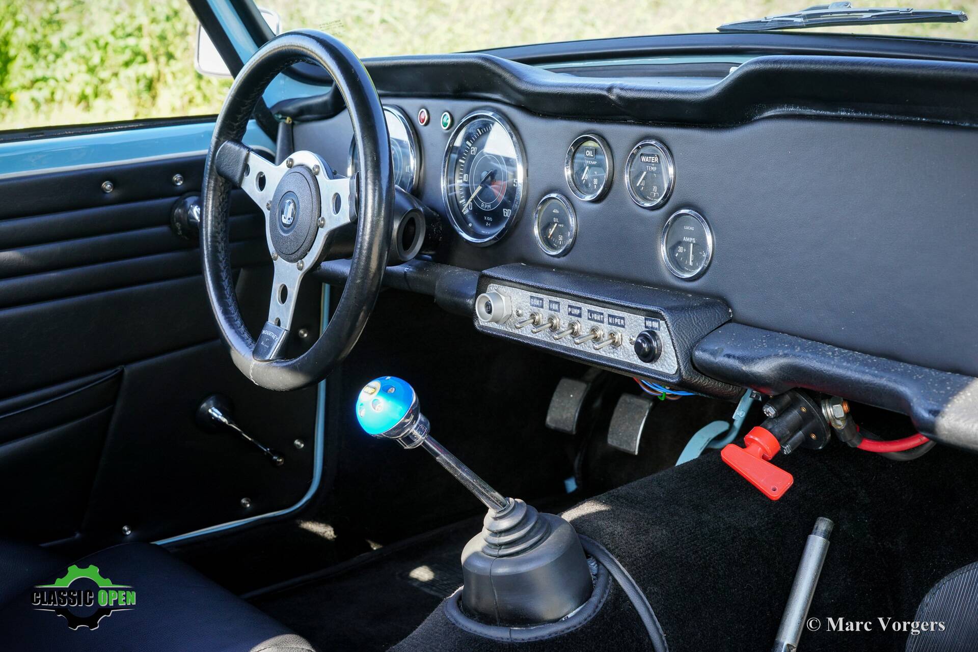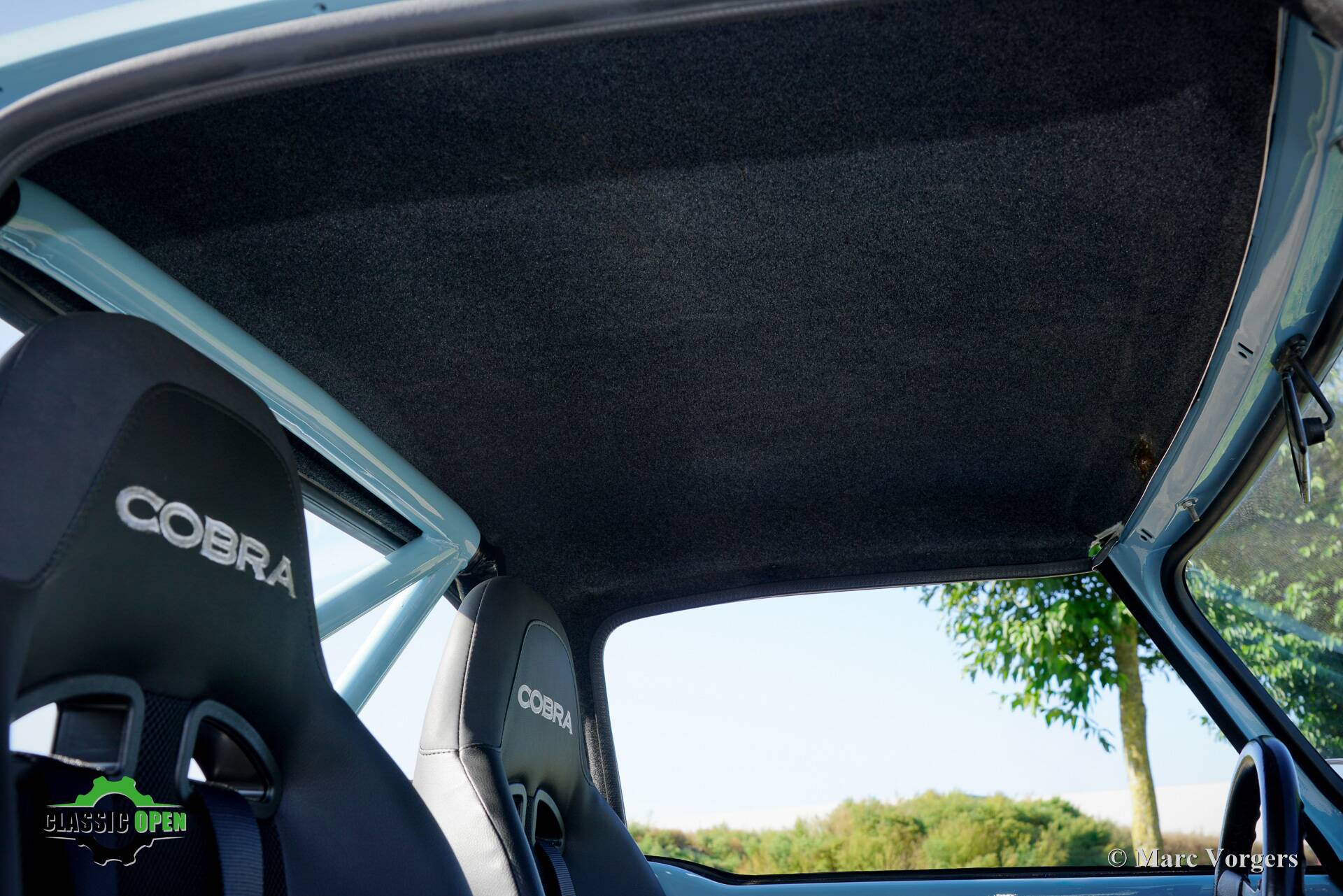 Not a ‘hard core’ racing interior but a carefully upholstered interior with black trim and headlining, superb Cobra bucket seats, four-point safety harnesses, a half roll cage behind the seats, a special MotoLita sports steering wheel with a smaller diameter and a thick leather covered rim.