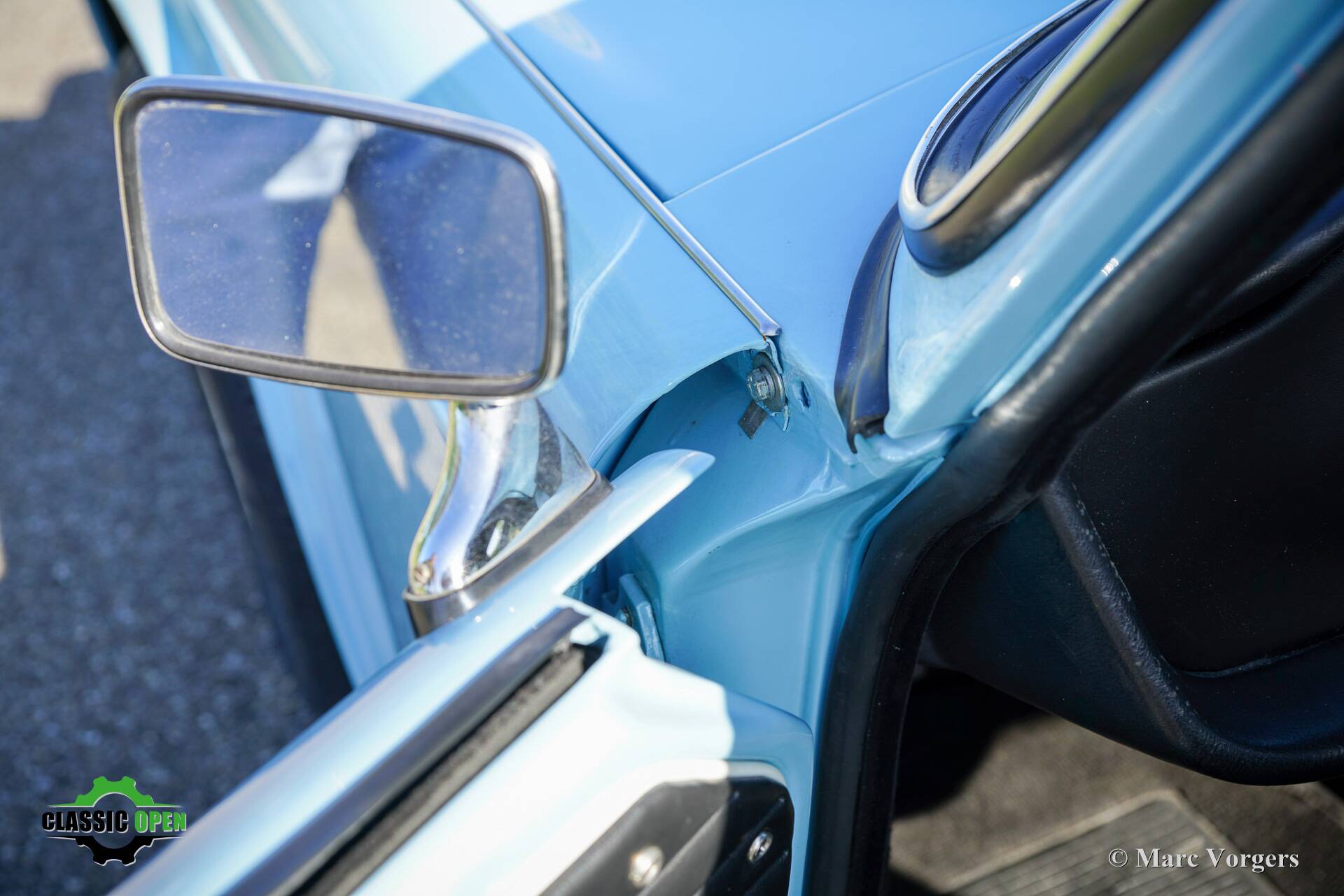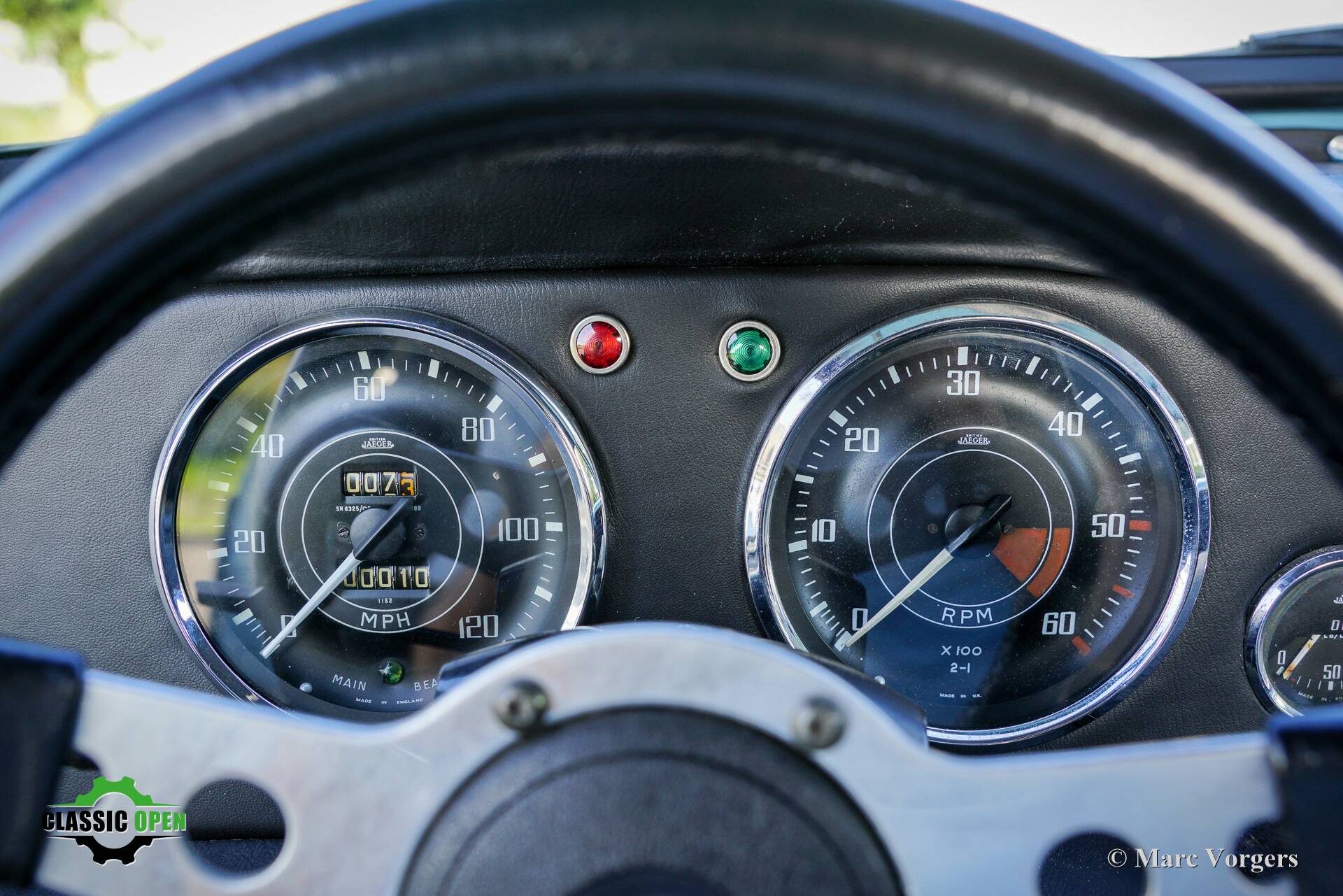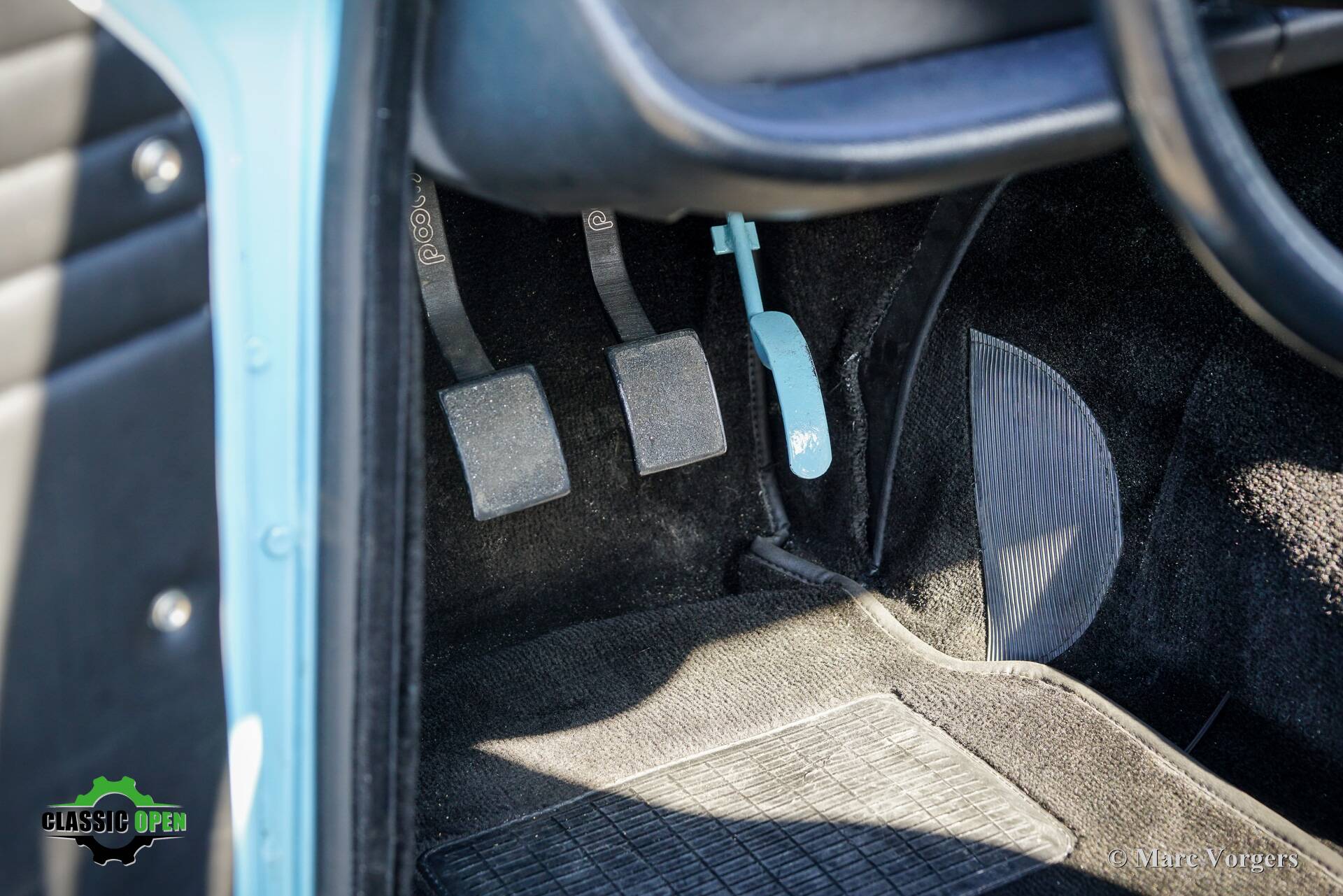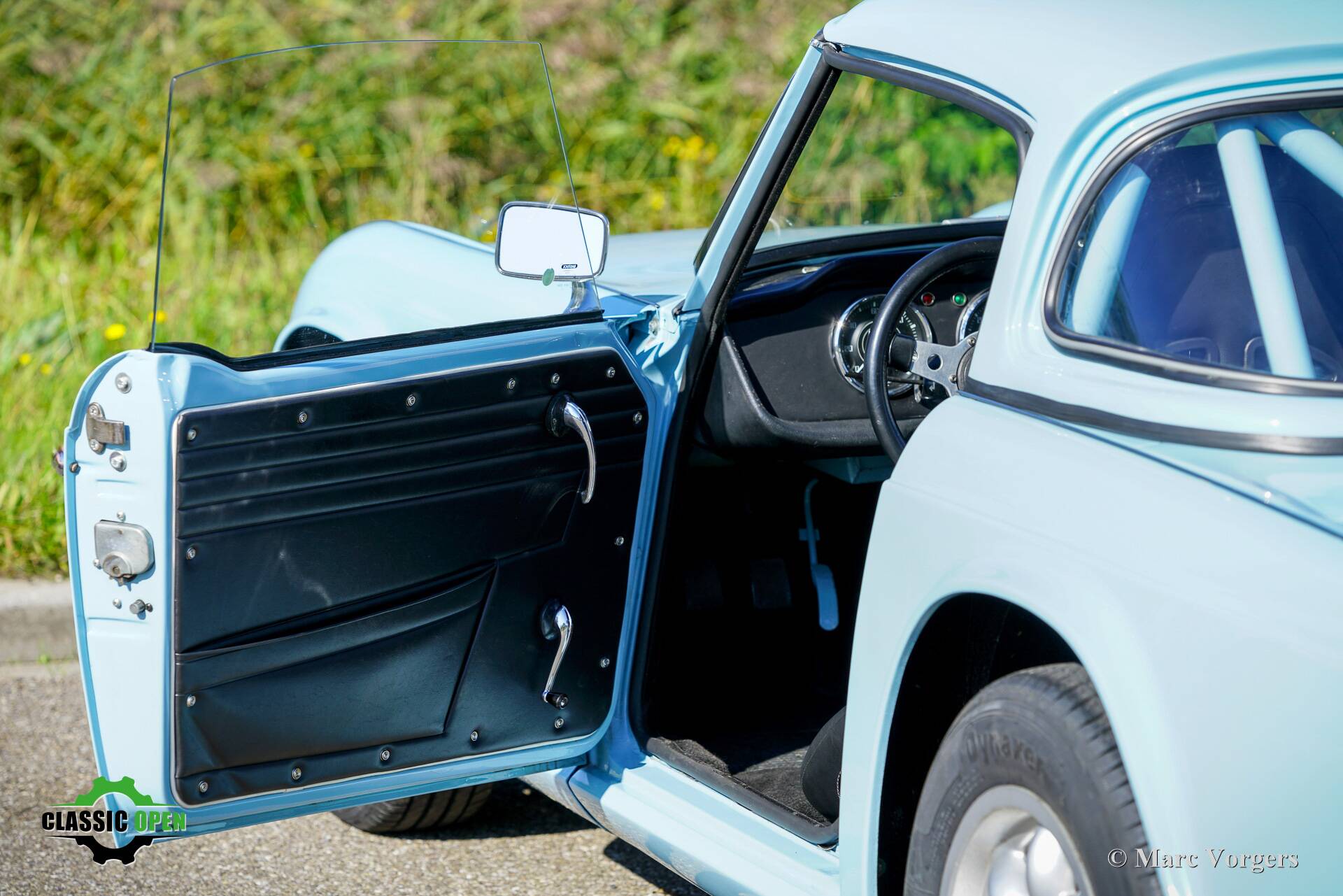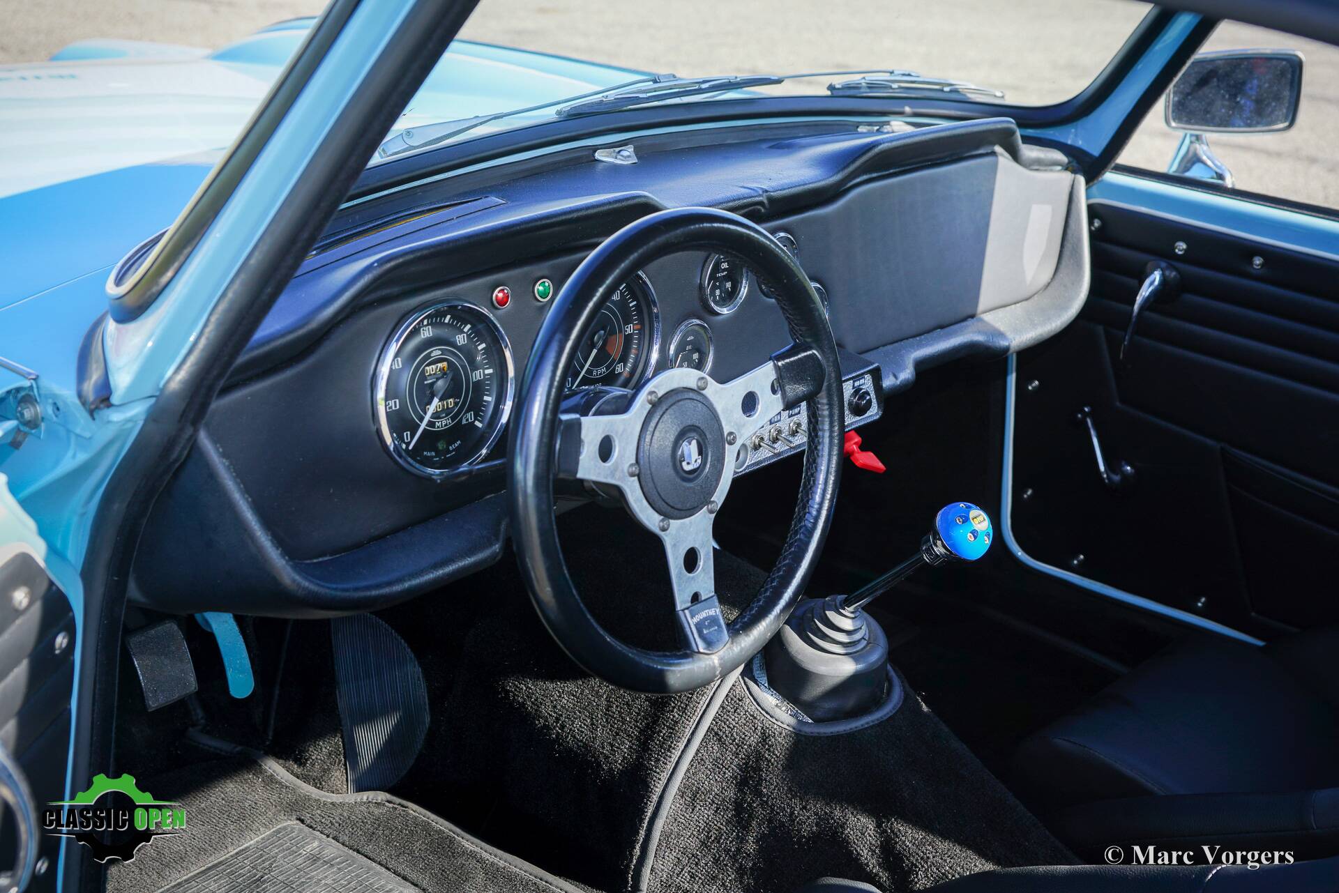 Not a ‘hard core’ racing interior but a carefully upholstered interior with black trim and headlining, superb Cobra bucket seats, four-point safety harnesses, a half roll cage behind the seats, a special MotoLita sports steering wheel with a smaller diameter and a thick leather covered rim.