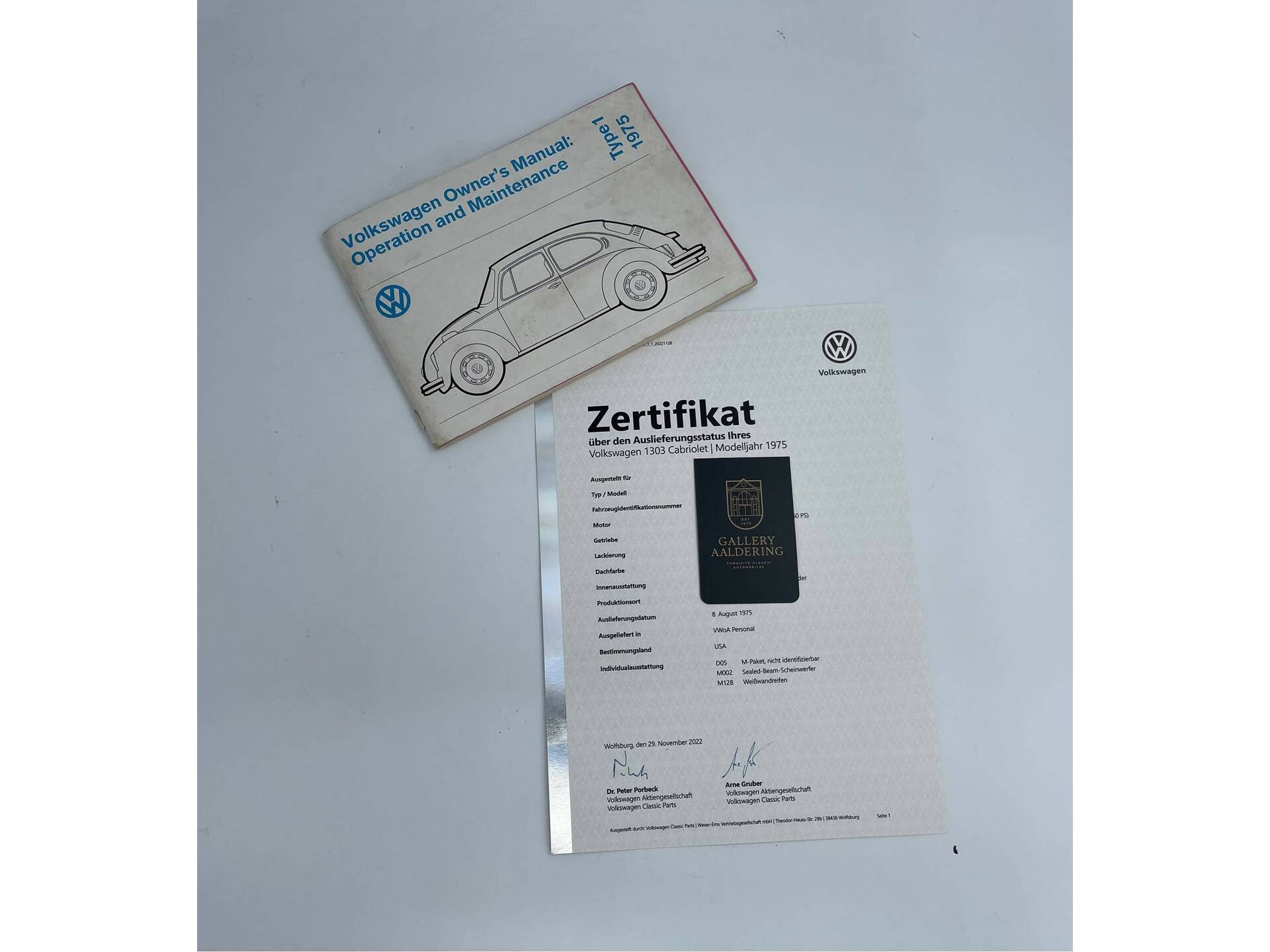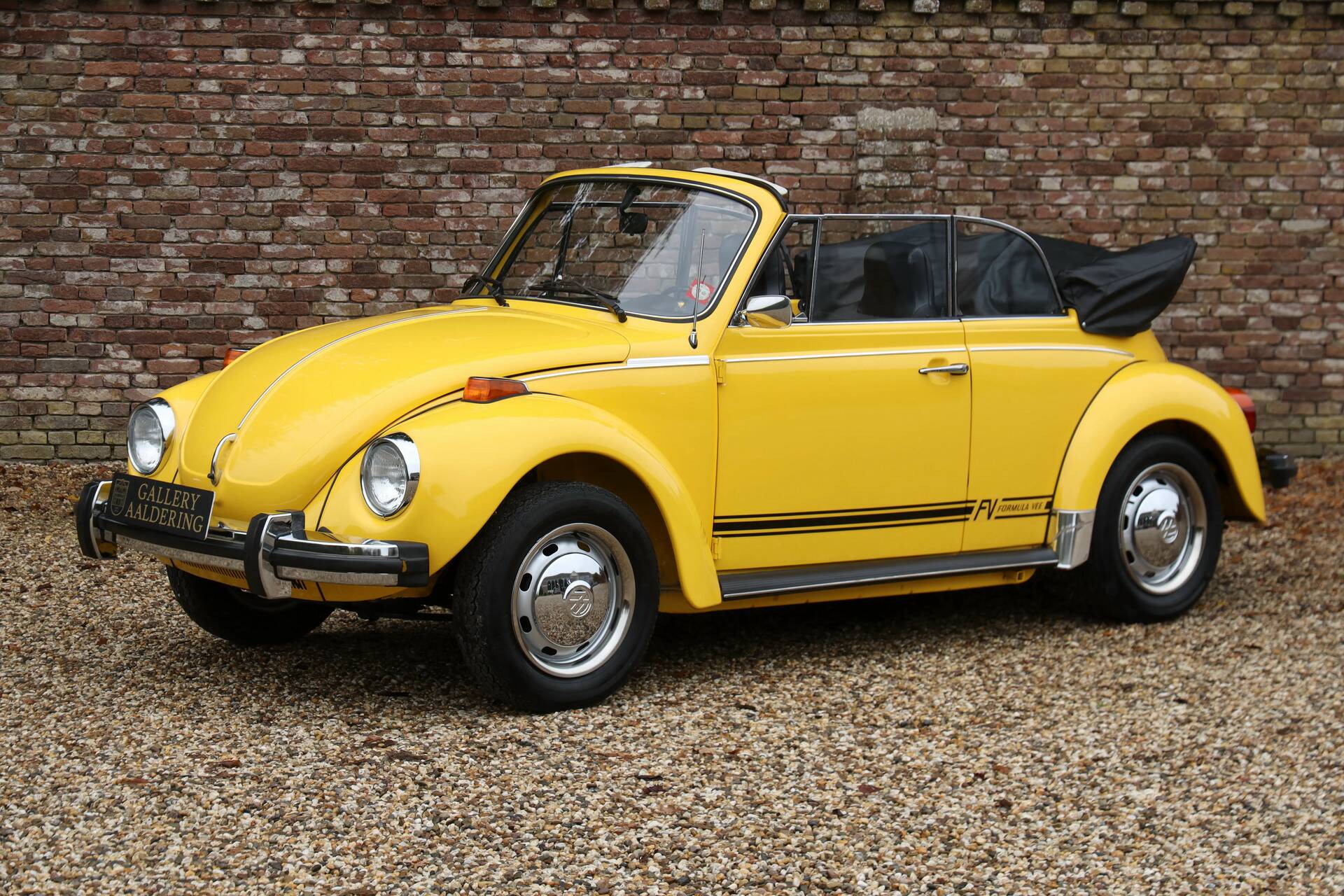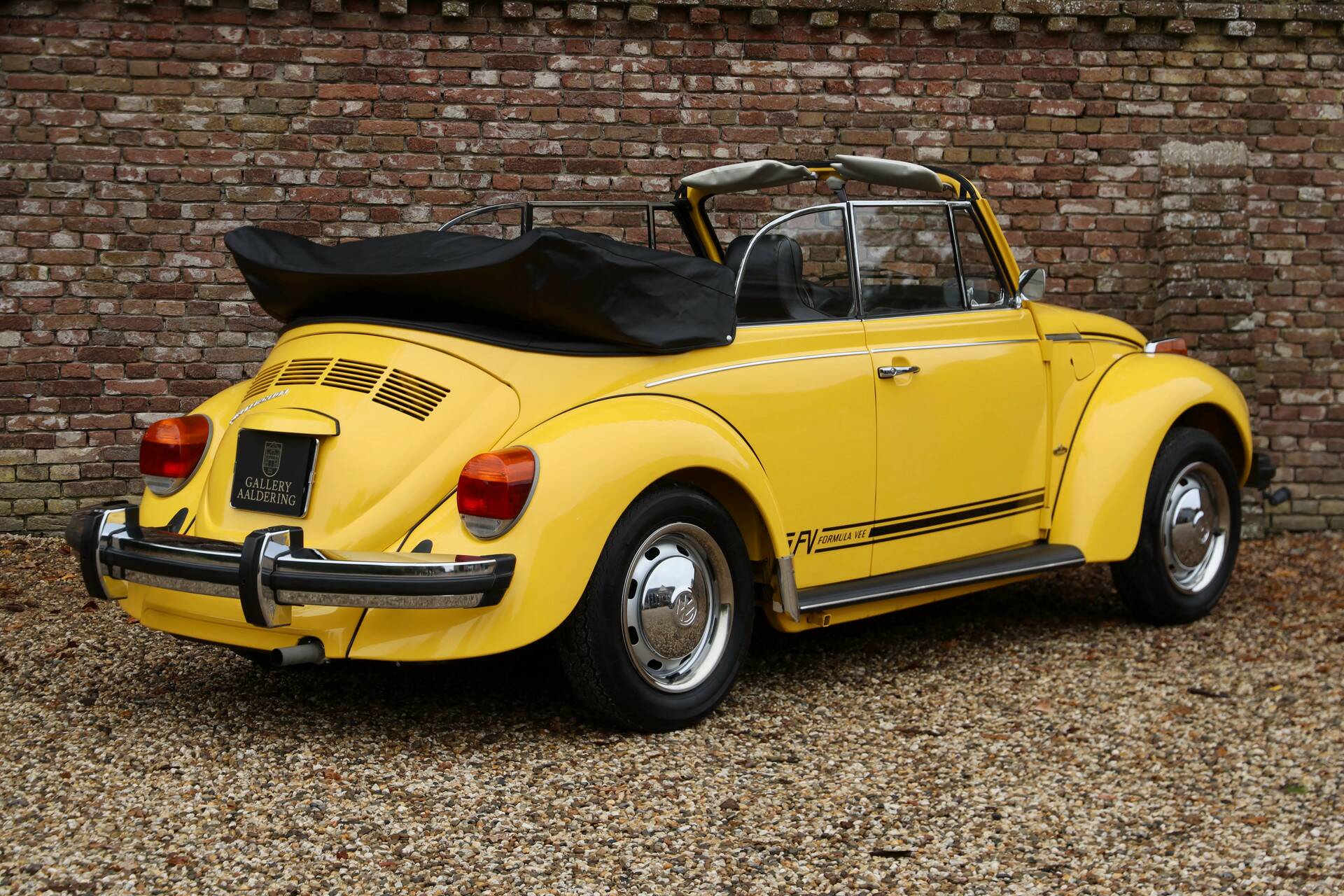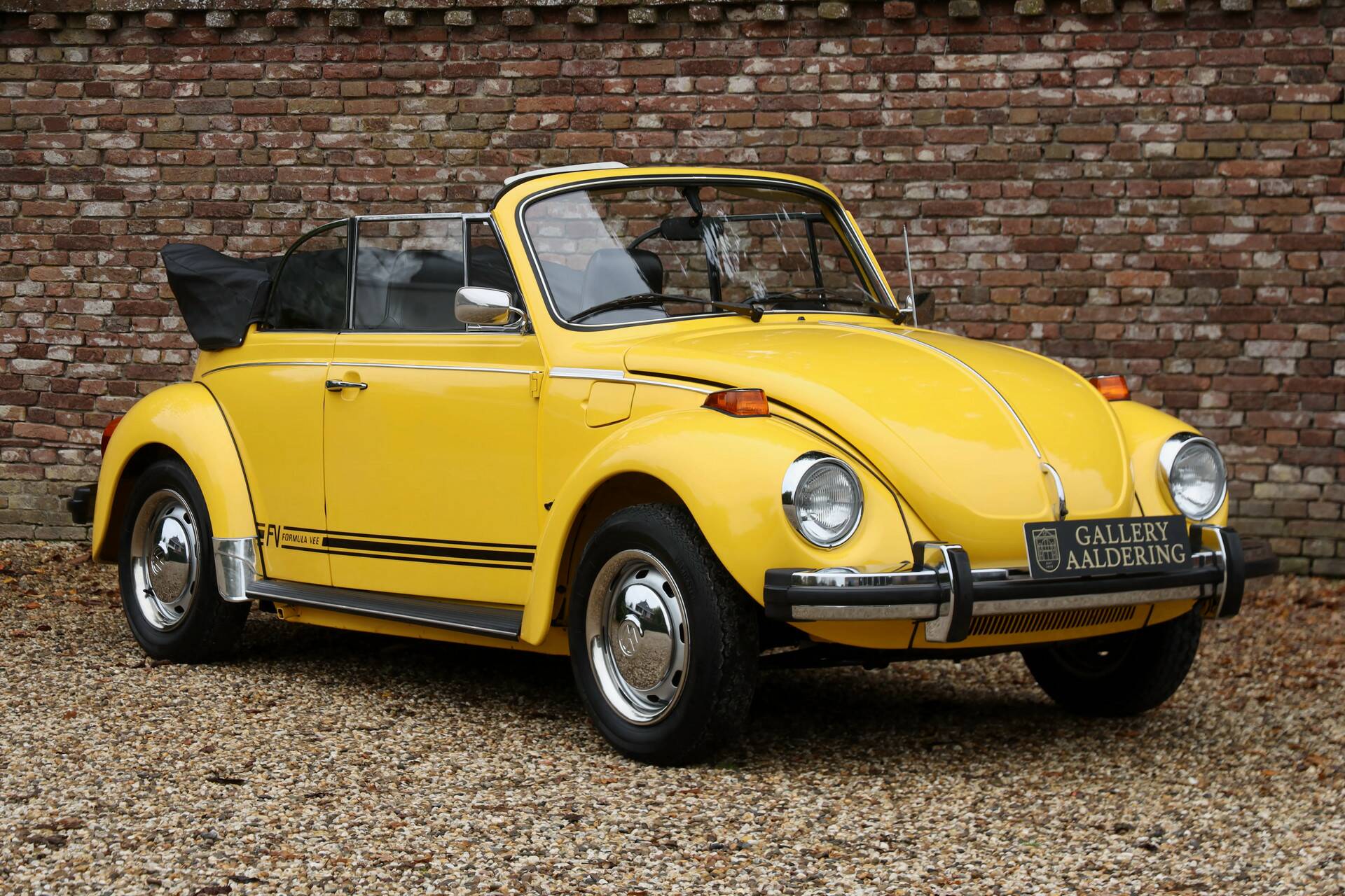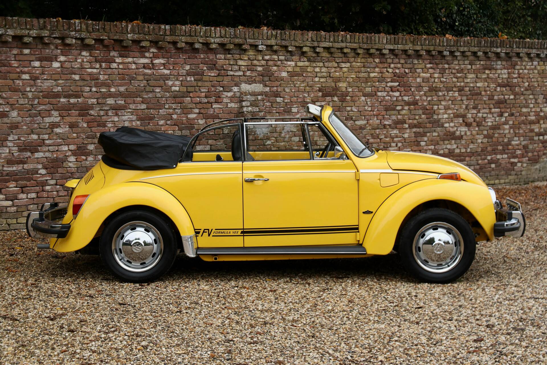 Volkswagen Beetle 1303 Convertible Formula Vee "4.410 mls" ORIGINAL! First paint! An exceptional and well-preserved Beetle Convertible in "new condition", First coat of paint applied after measurement, Offered with owner's - service manual and VW Classic "Zertifikat", Lovely presented with "Formula Vee" striping, New condition is definitely not an overstatement, Livery in "Sonnengelb" with black interior,