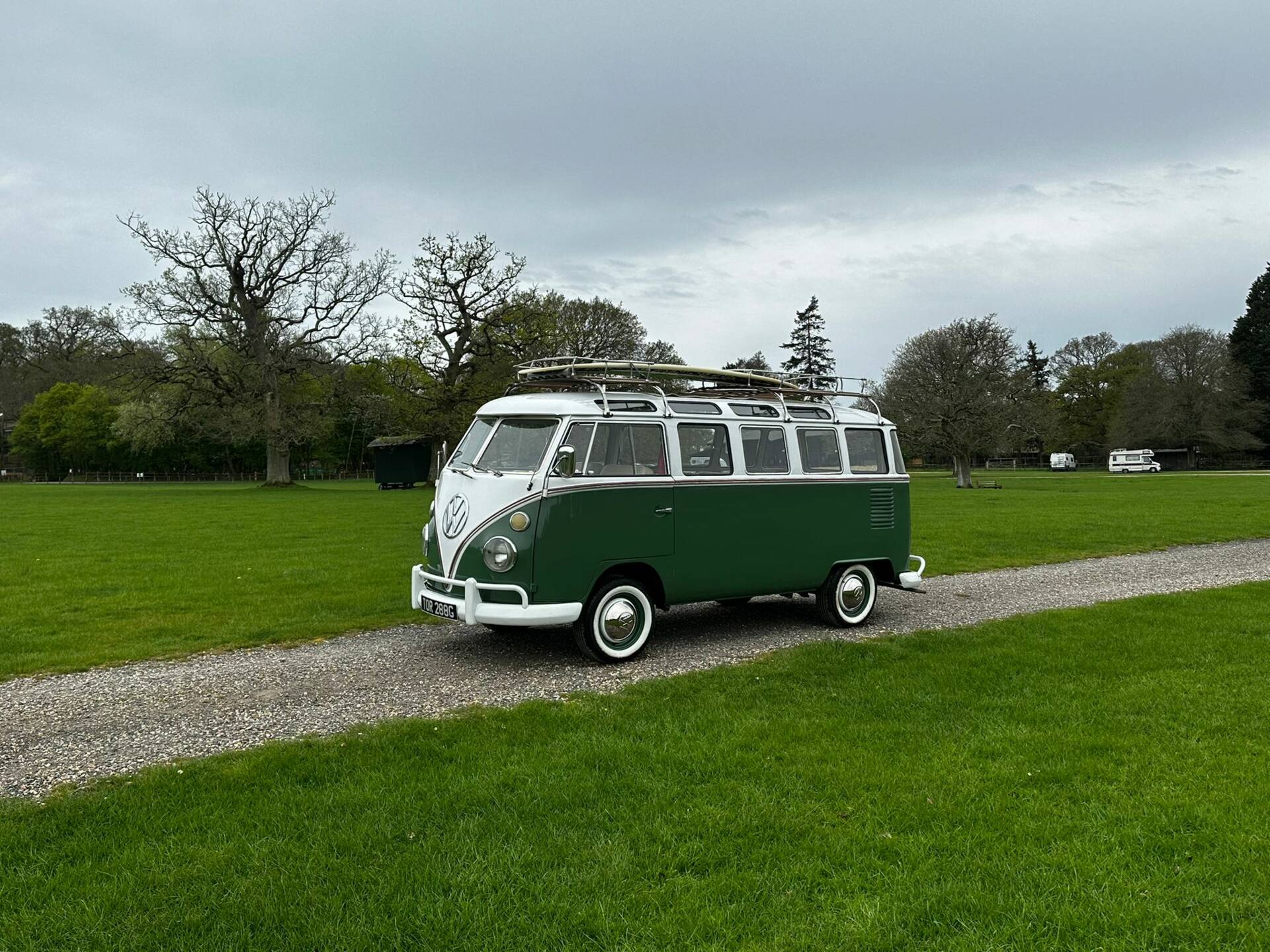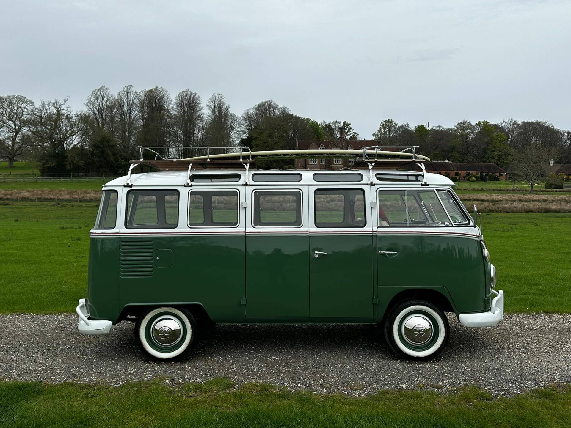 Imported from Brazil in 2010, this classic Kombi is a great example of an iconic split screen bus and is in lovely condition throughout. Finished in green and white with a beige interior, it features three bench seats, sunroof, opening front windows, and front seat belts. Extras include roof racks with surfboard.
