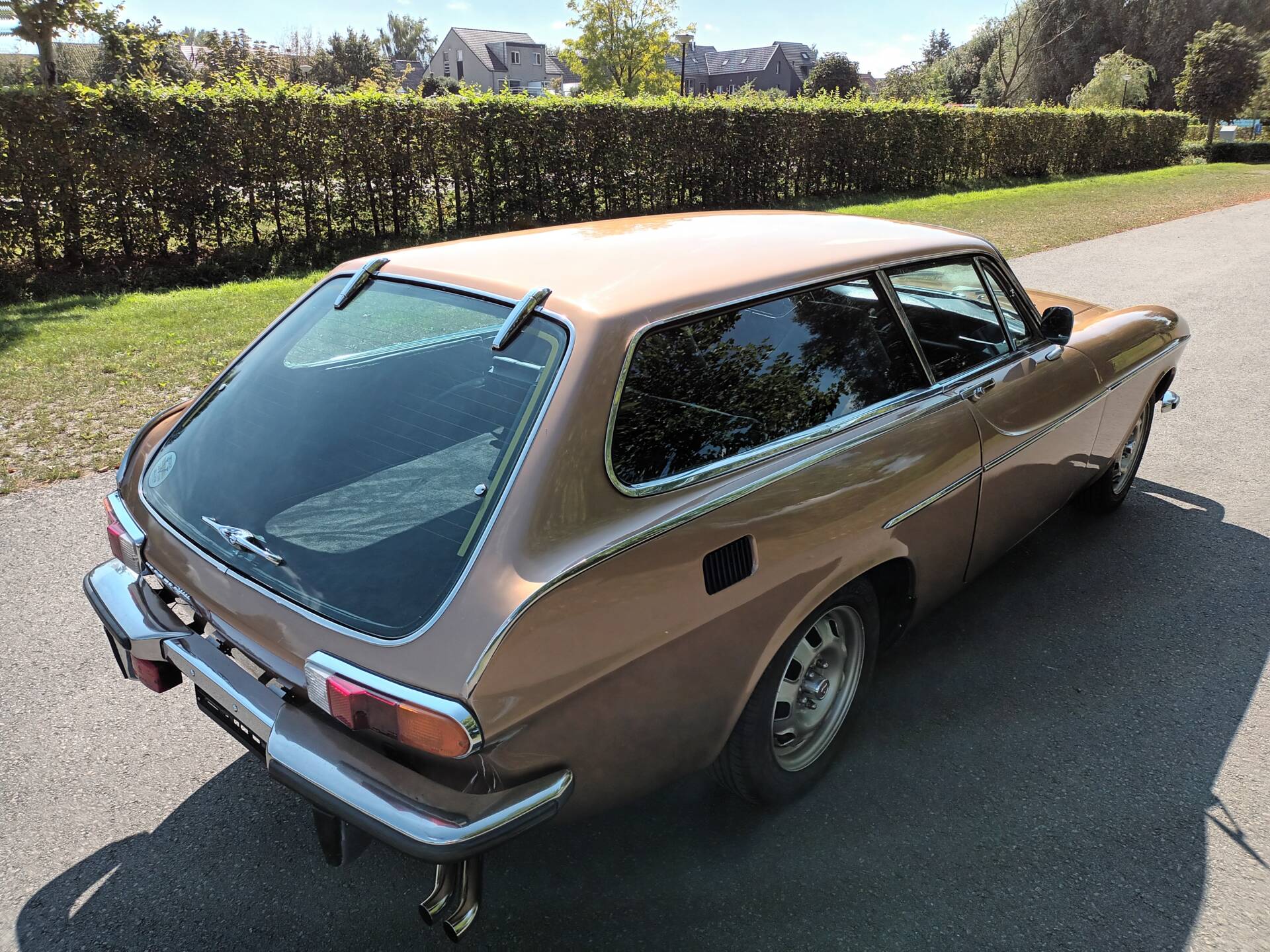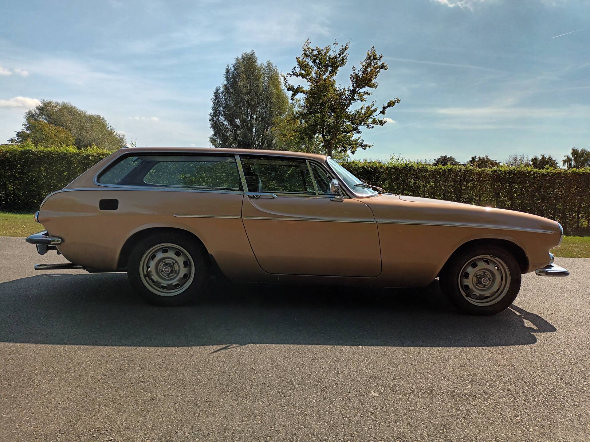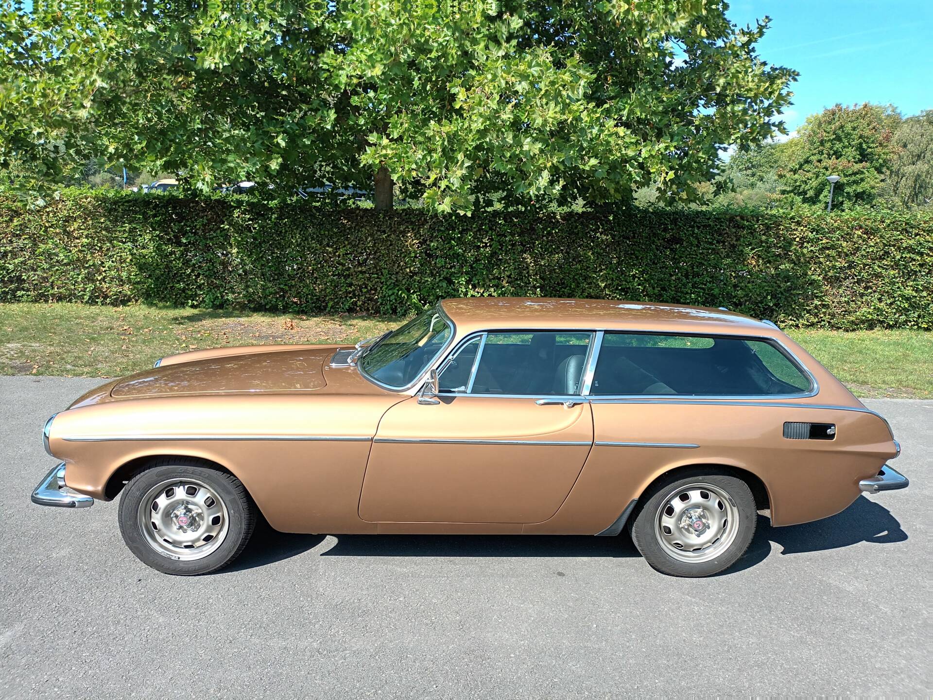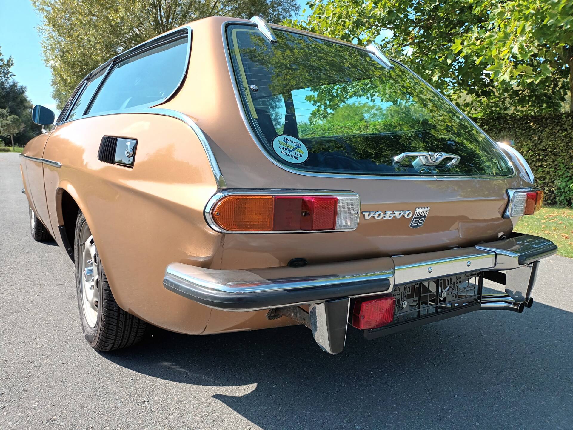 This 1972 Volvo 1800 ES appears in a very period-correct color combination. The Gold Metallic paint (code 105) complements the low front, long side lines, and the distinctive glass rear. The car has been repainted; only a small bubble near the antenna is mentioned. Importantly, the body is reported to be rust-free.
