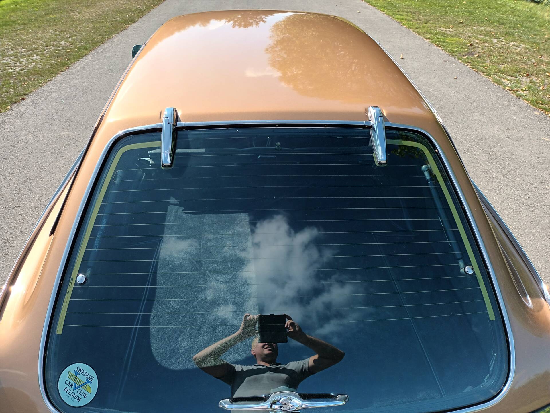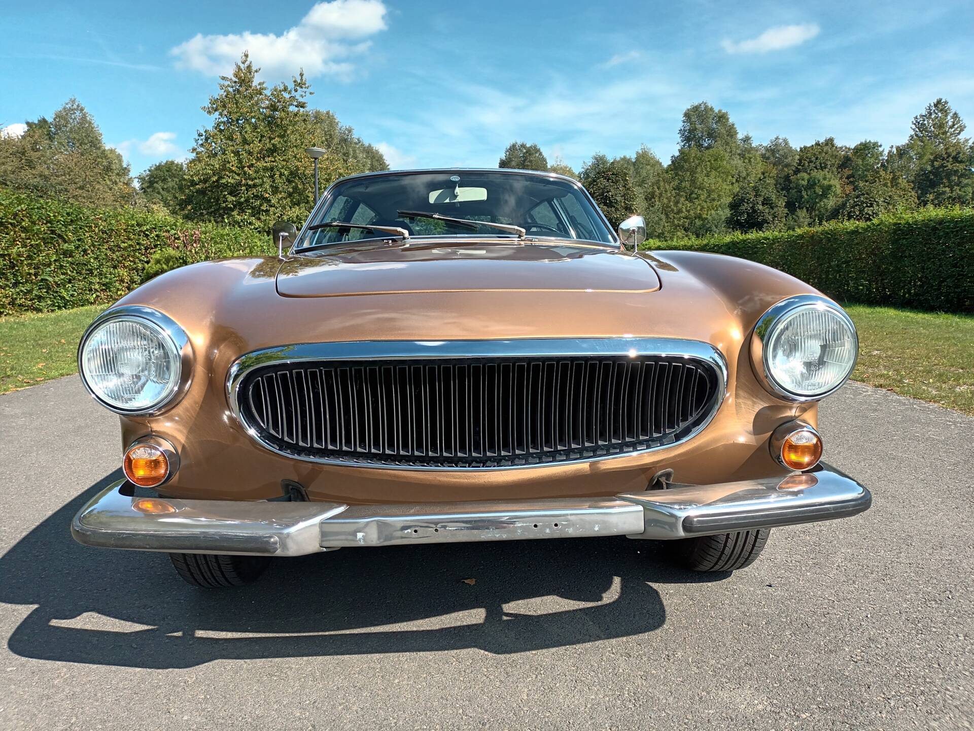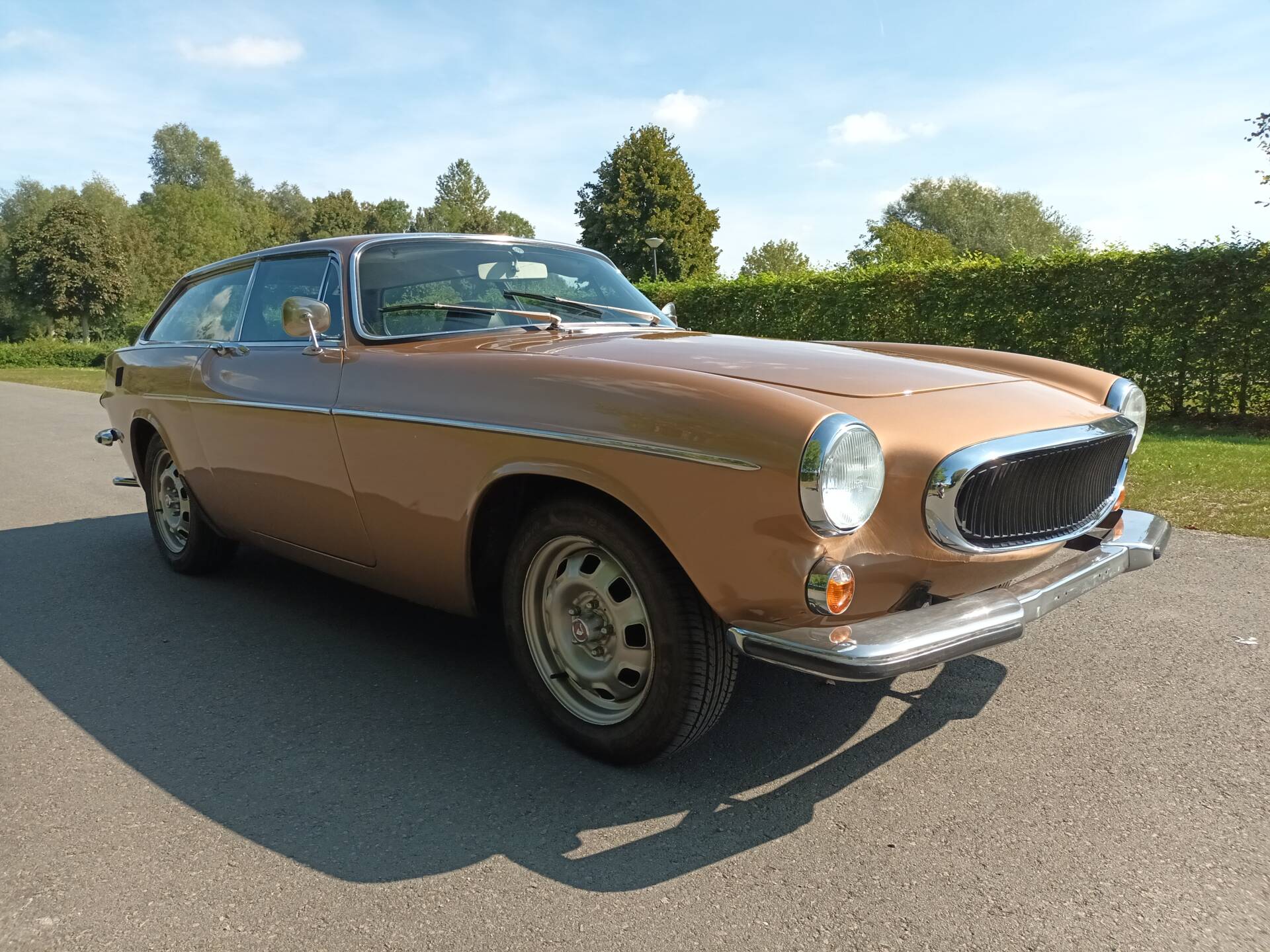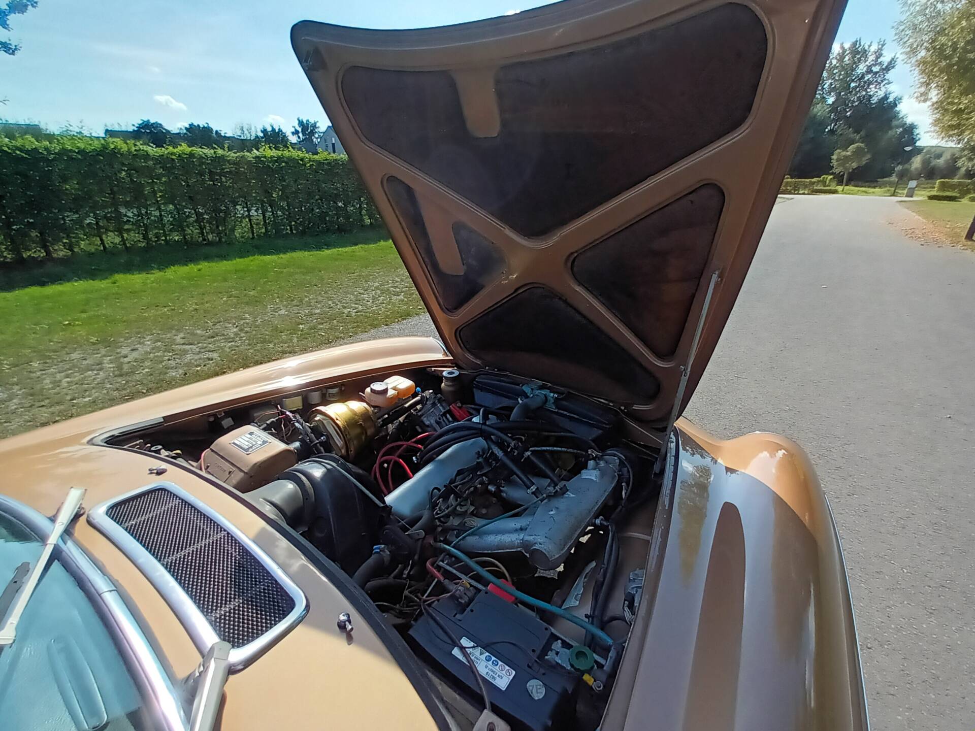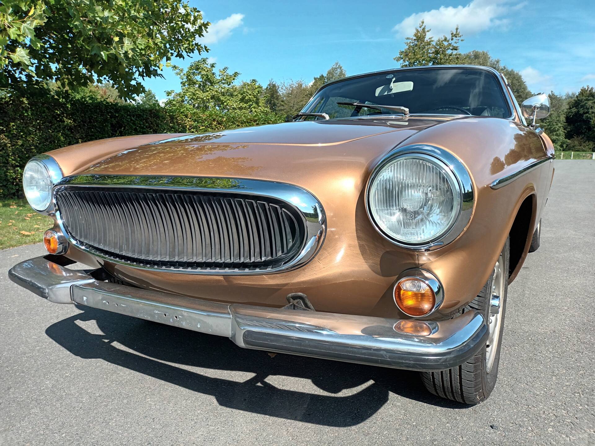 According to the available information, this example presents itself in very good overall condition. The body is finished in Gold Metallic (Volvo color code 105) and has been repainted; only a small bubble near the antenna is noted, and no rust is reported. In addition, there is extensive documentation from Belgium and France, numerous invoices, and detailed maintenance records. Notably, the car is already registered as a collector’s vehicle in France, making it not only a stylistic statement but also a well-documented example suitable for regular use.