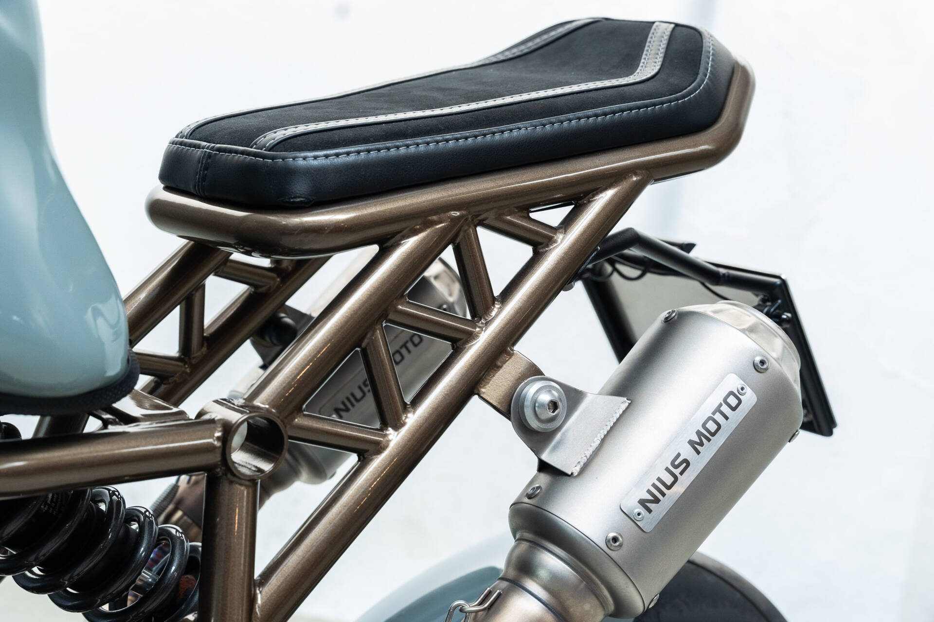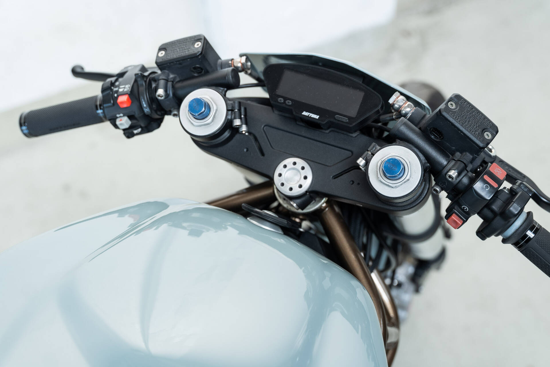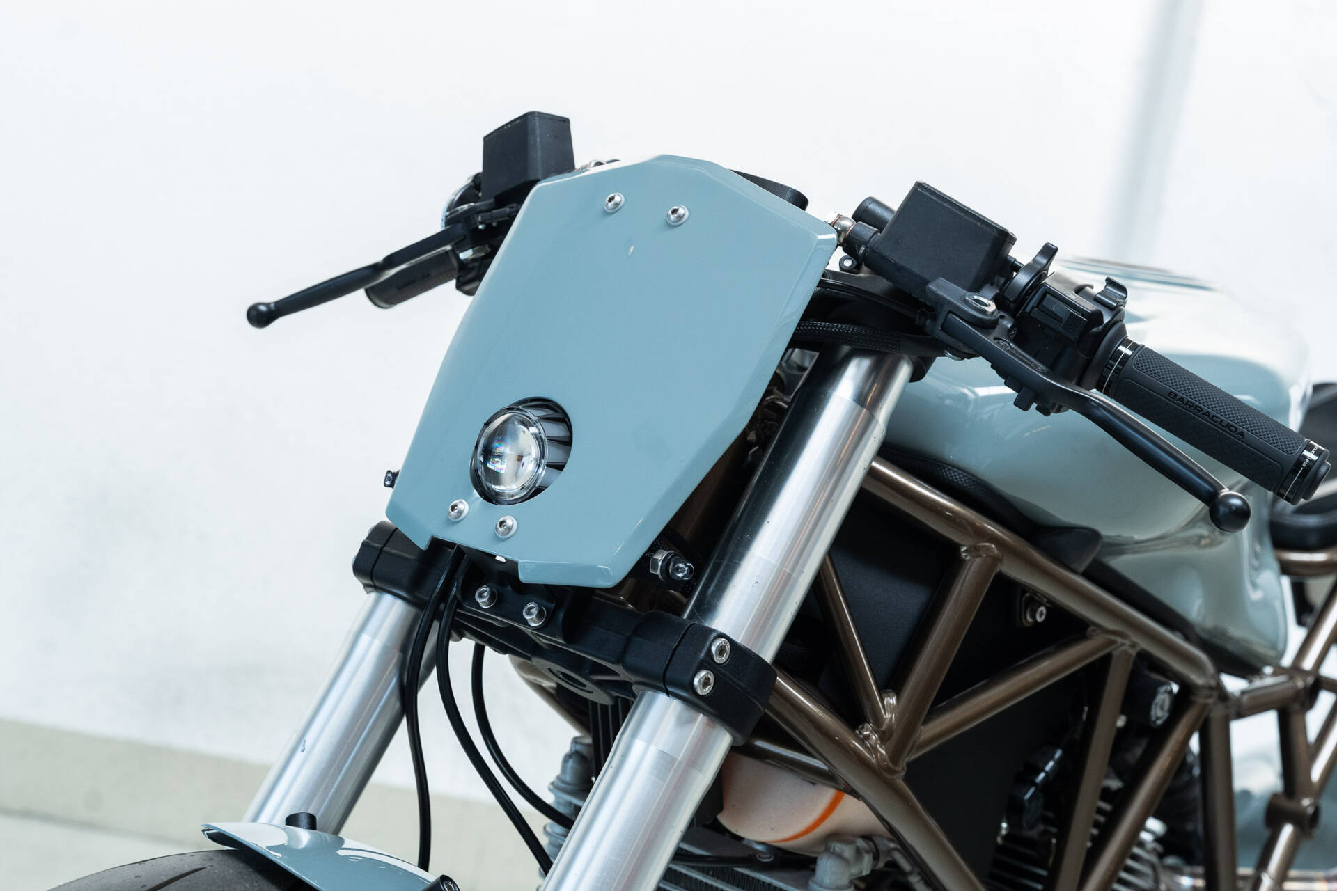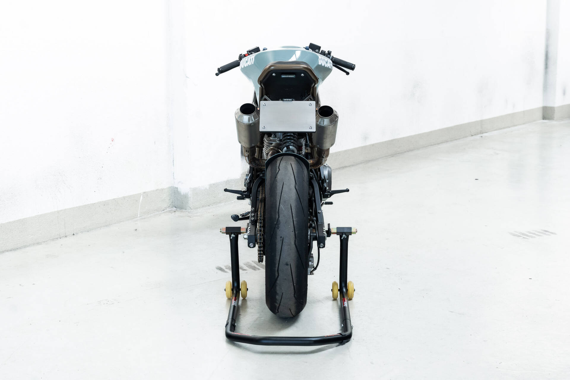 All wiring was redone and neatly integrated under a custom steel panel within the frame. The hand-built stainless 2-2 exhaust is inspired by Ducati’s WSBK Panigale models – symmetrical, compact, and radiating pure race DNA.