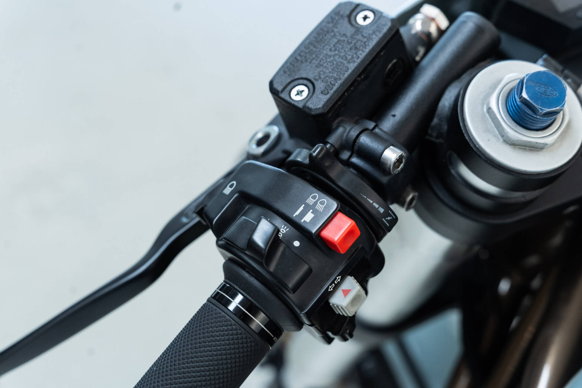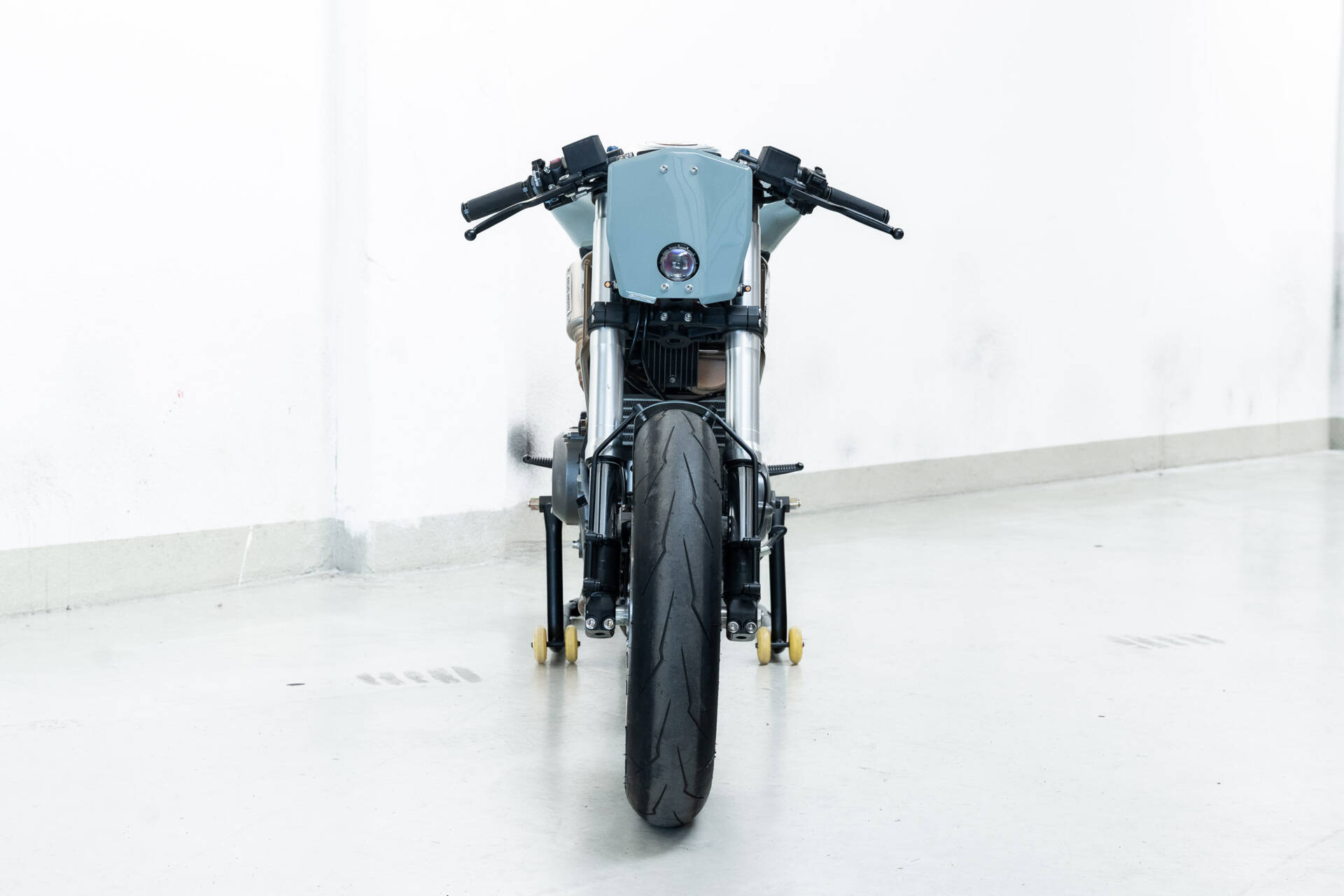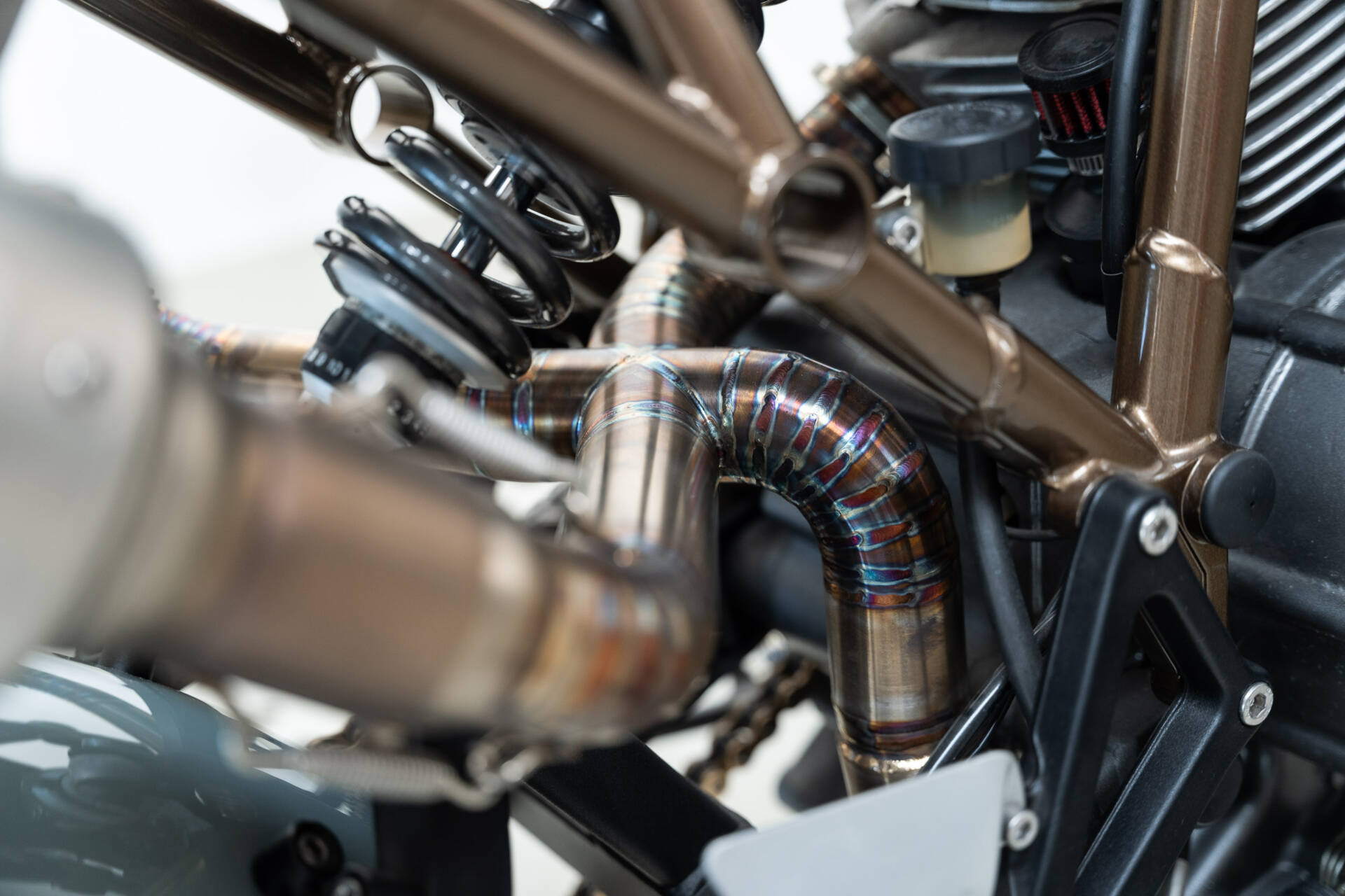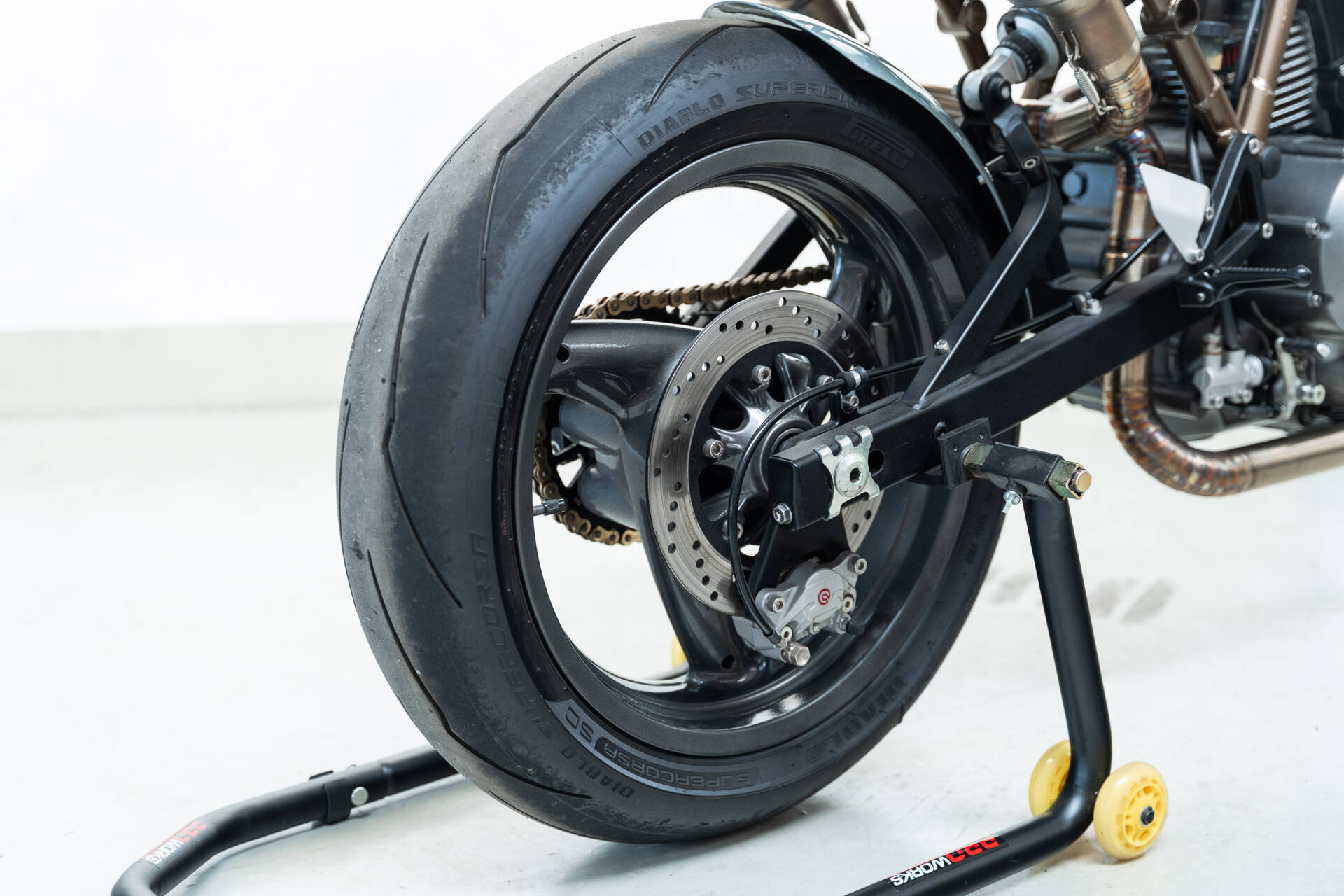 All wiring was redone and neatly integrated under a custom steel panel within the frame. The hand-built stainless 2-2 exhaust is inspired by Ducati’s WSBK Panigale models – symmetrical, compact, and radiating pure race DNA.