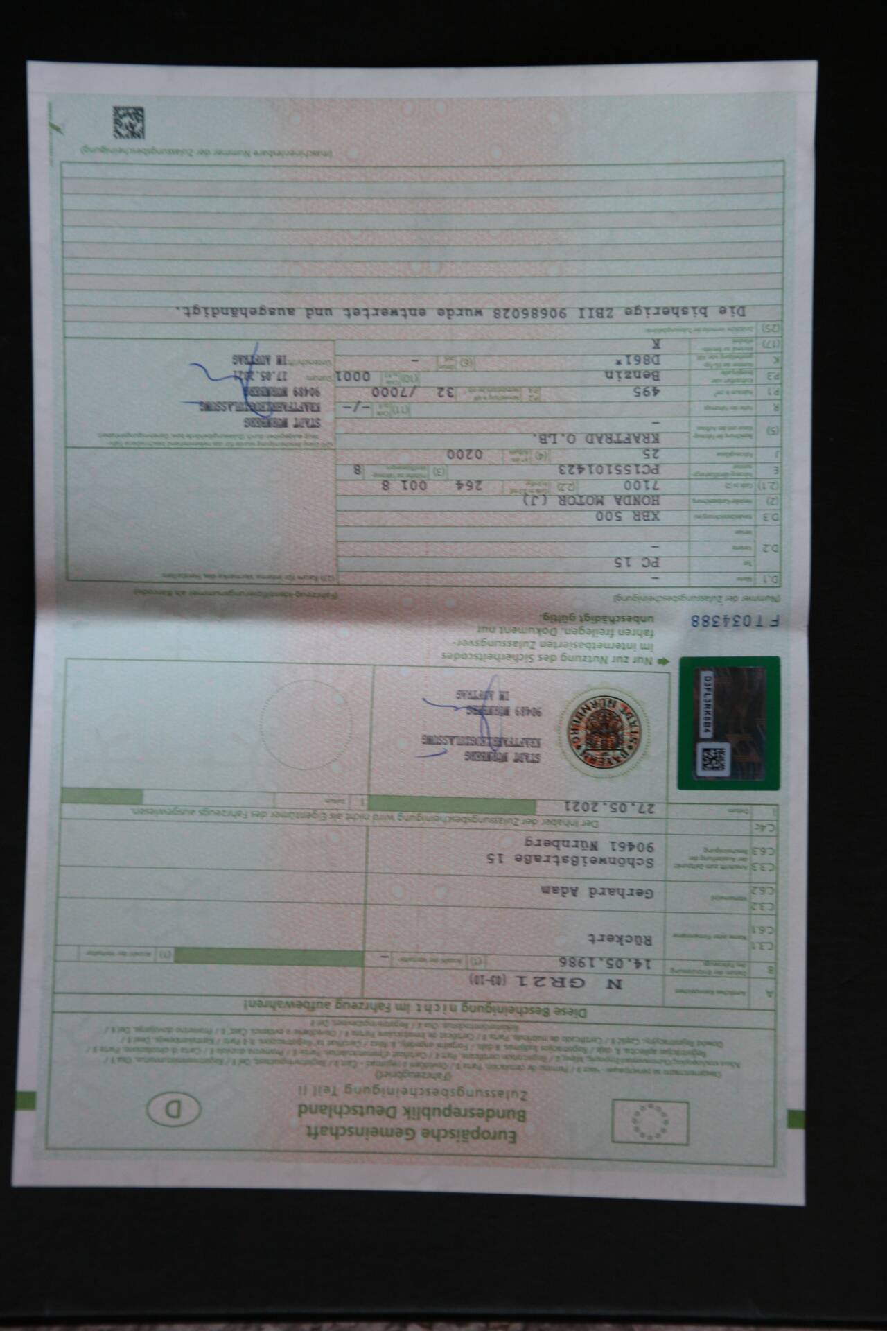 Nachdem das Motorrad von einem KFZ-Meister in betriebsbereiten Zustand gebracht wurde, habe ich das Fahrzeug im Mai 2021 zugelassen, bis es 2024 wieder abgemeldet wurde.