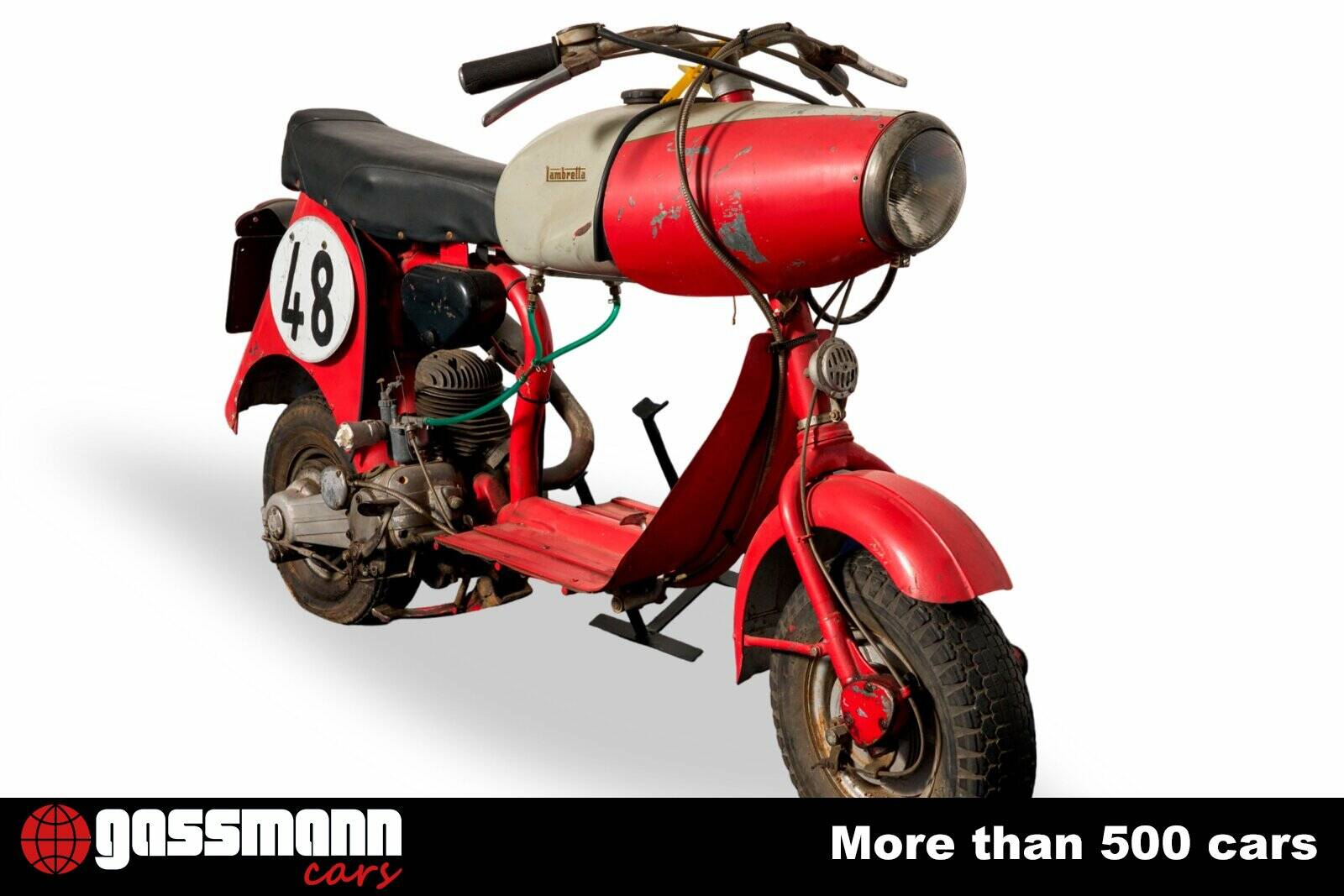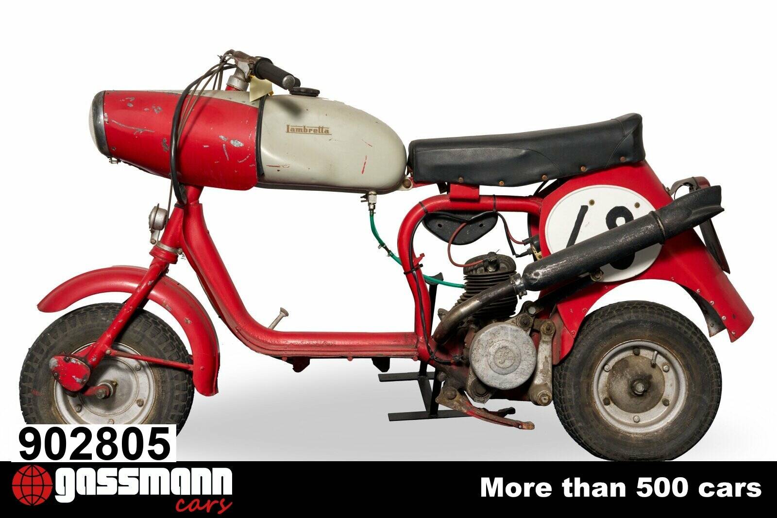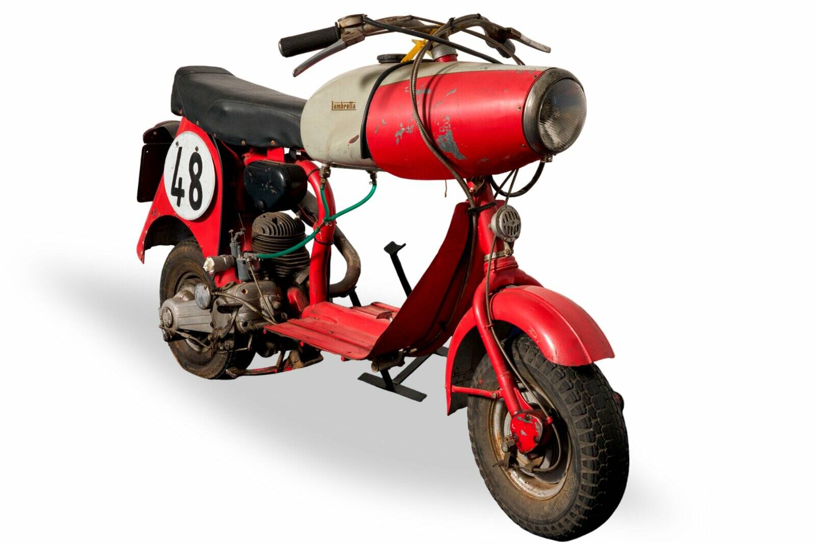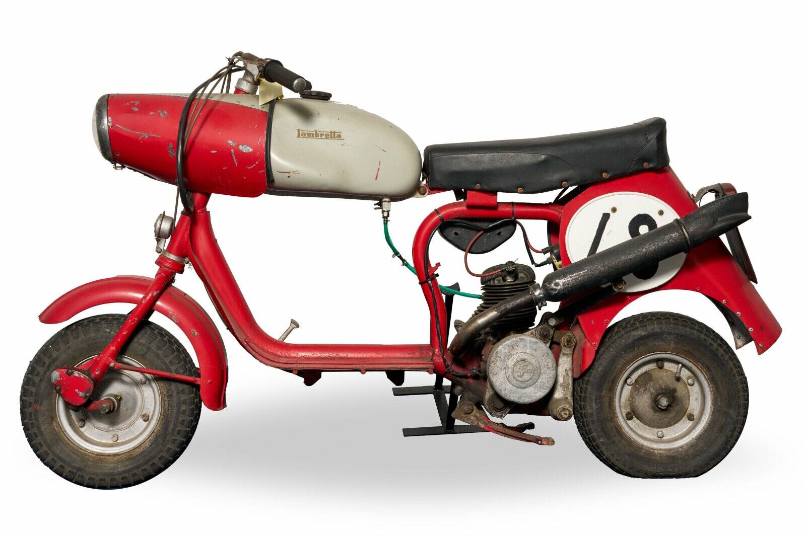 Based on a Lambretta Model D, this original machine was modified to take part in the scooter races in vogue in the 1950s. The frame, engine and transmission are recognisably from a Model D, but everything else was radically altered, using traditional methods but more modern parts such as a double saddle allowing the rider to adopt a position leaning forward, a fuel tank leading on from the handsome streamlined headlamp, and, at the rear, a fairing with the racing number. The raised exhaust rounds off this specially-built model, reflecting the ingenuity driven by the passion of racing. The entire machine has been very well preserved, as if it had just finished its last race.